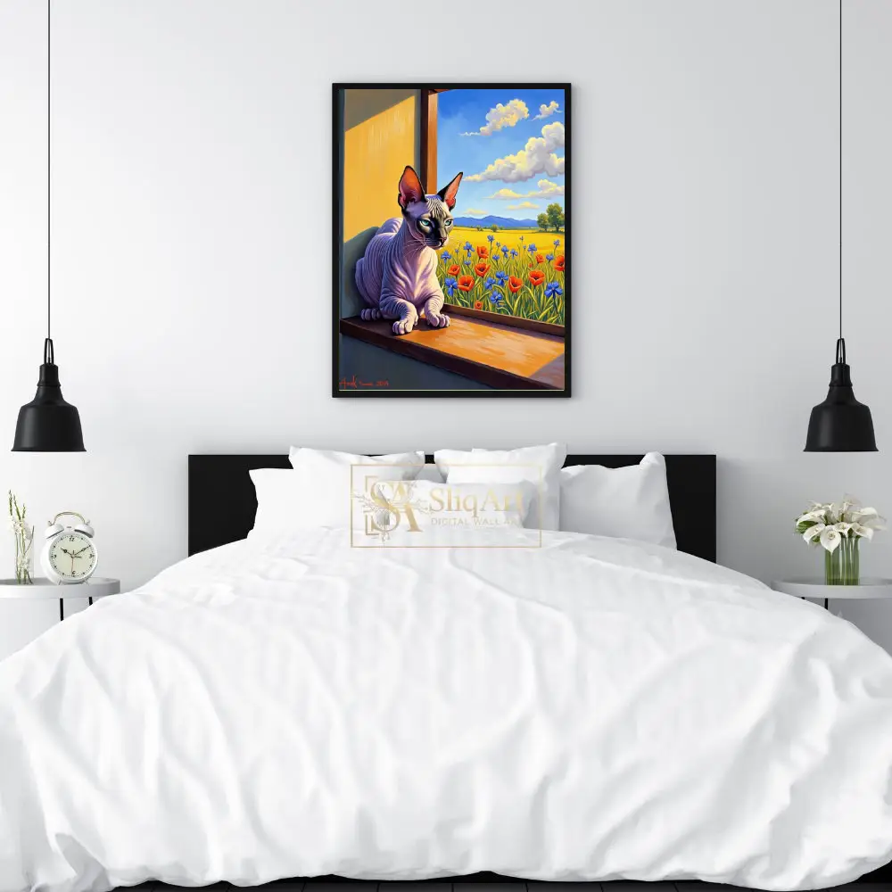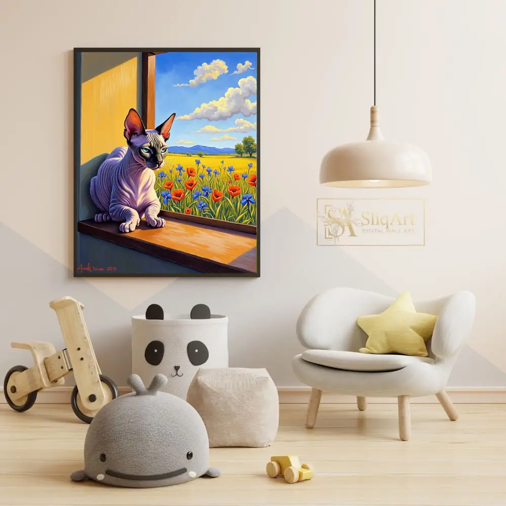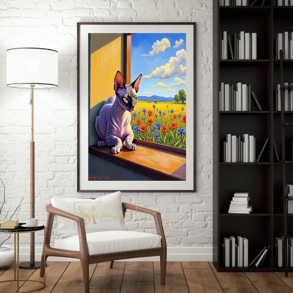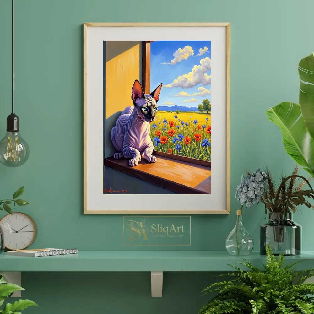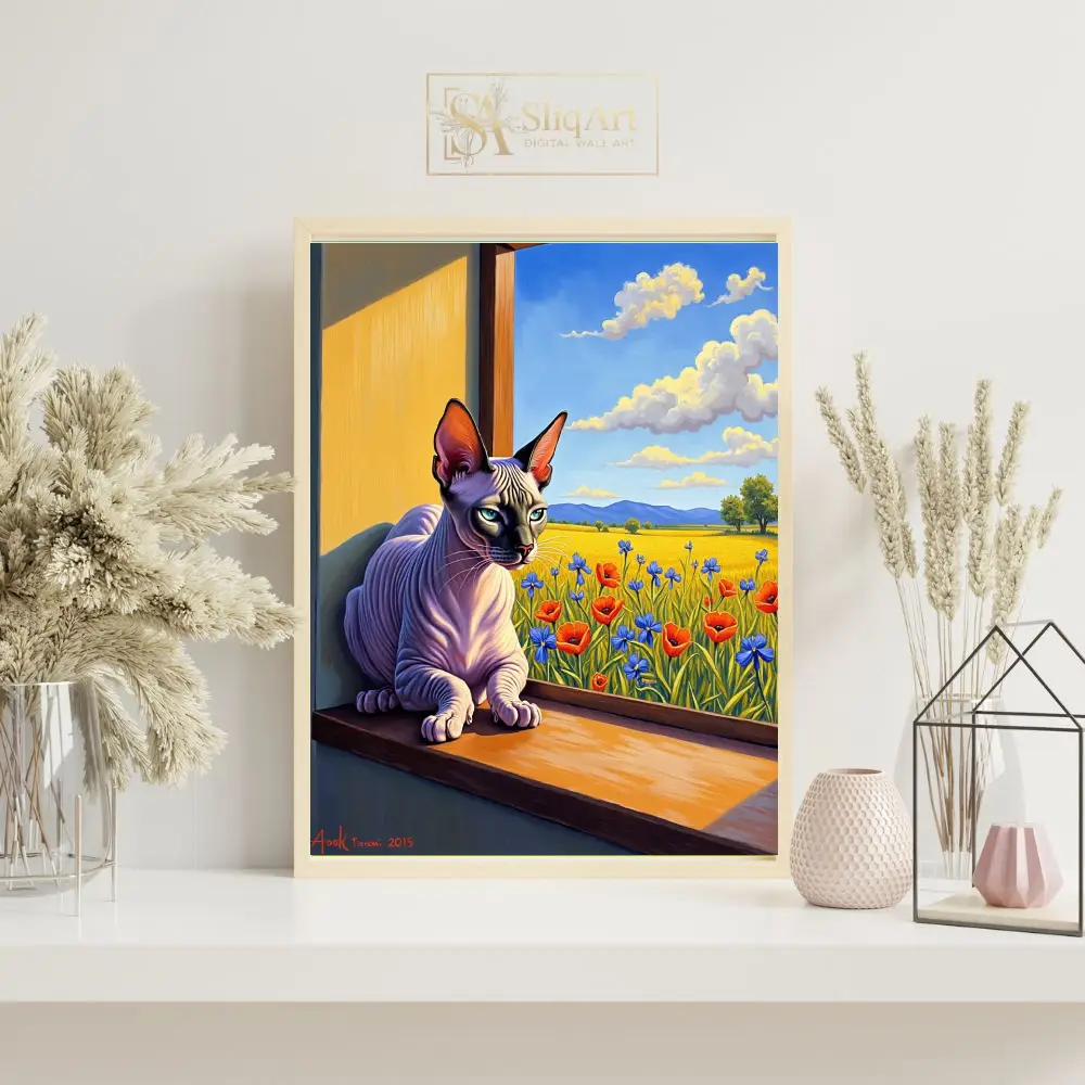 Experience the serene beauty of a Sphynx cat in this vibrant art piece. Resting on a sunlit wooden windowsill, the hairless cat gazes out at a breathtaking summer landscape.