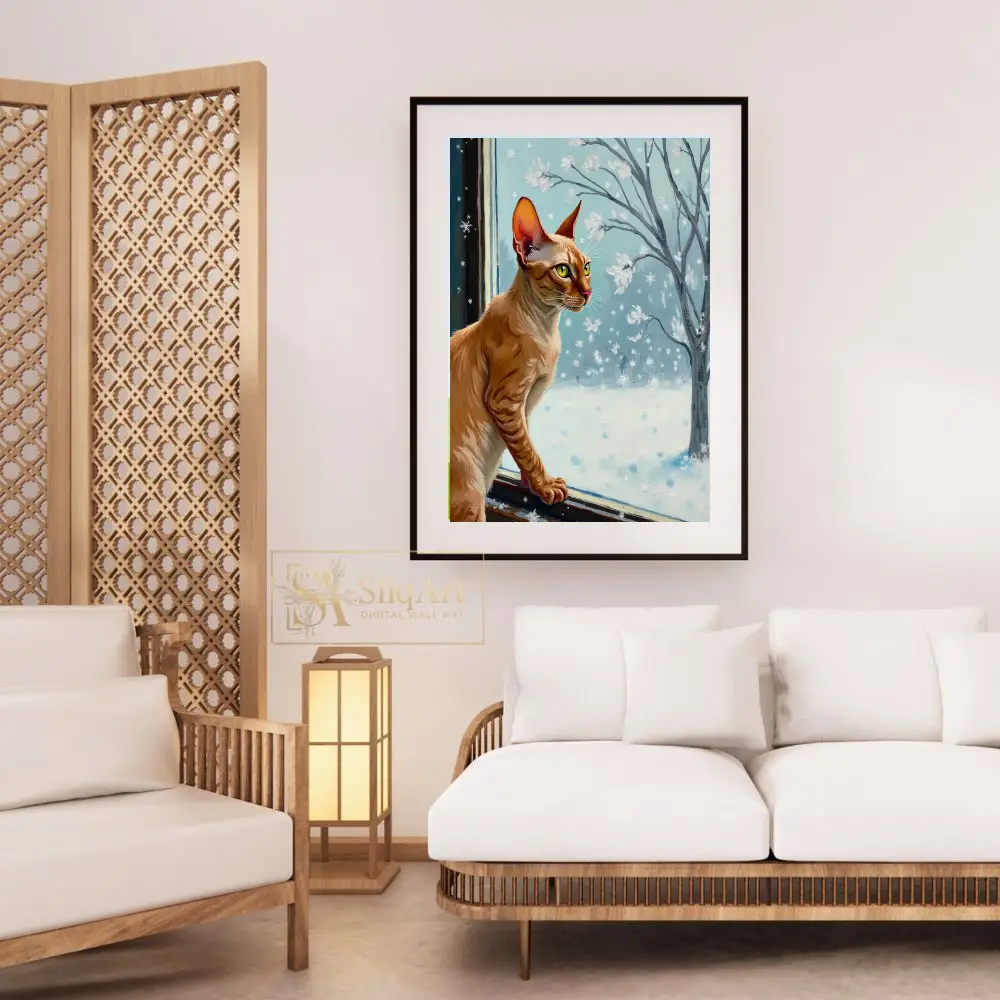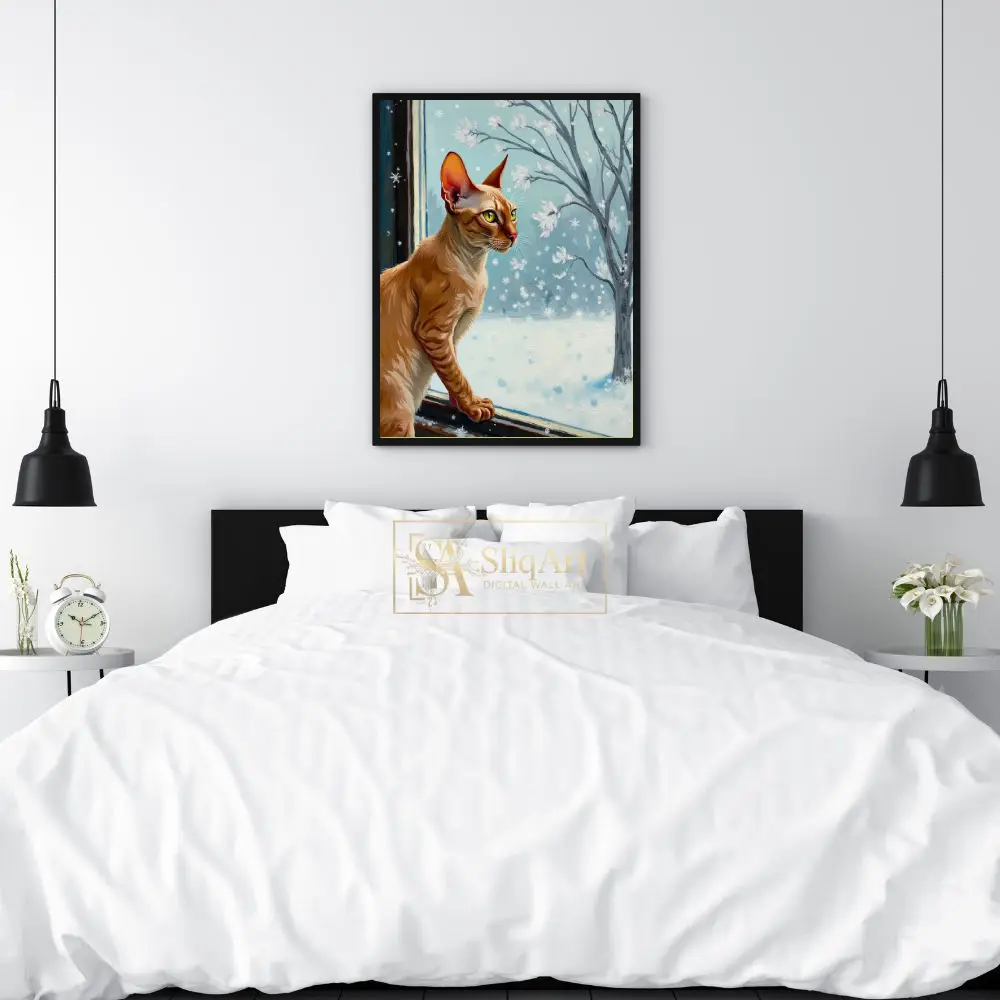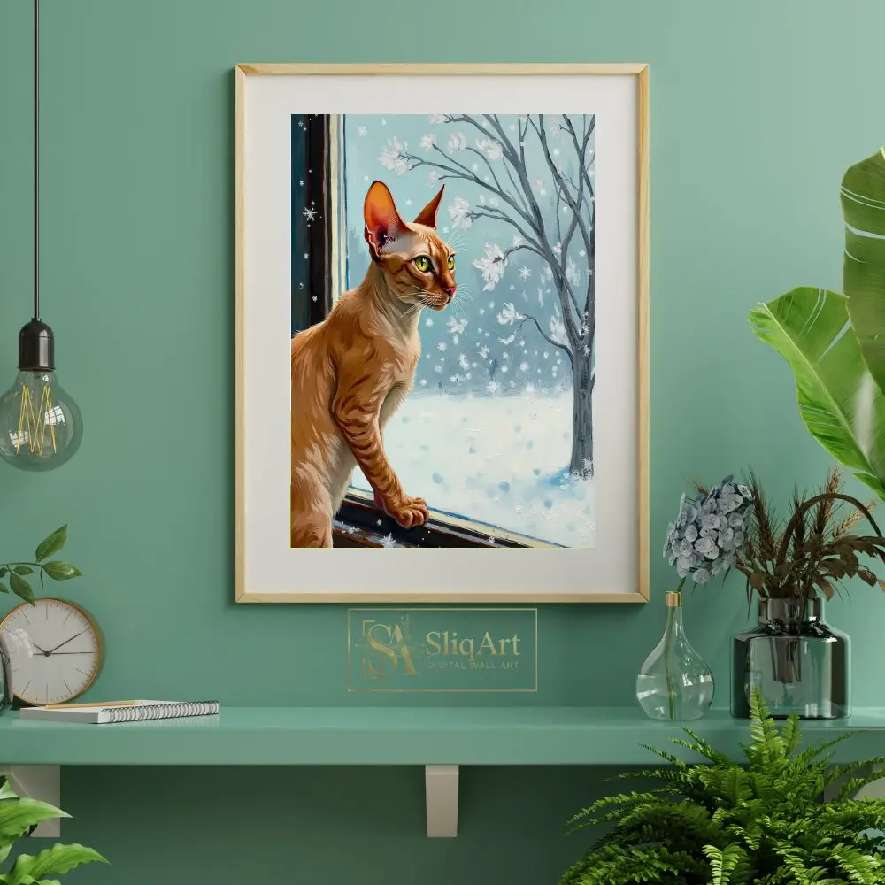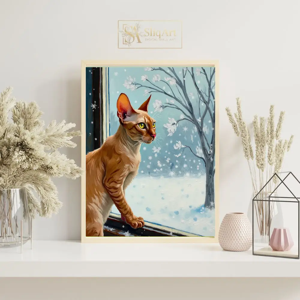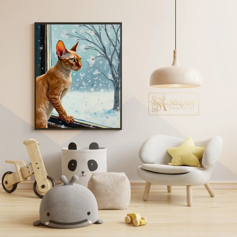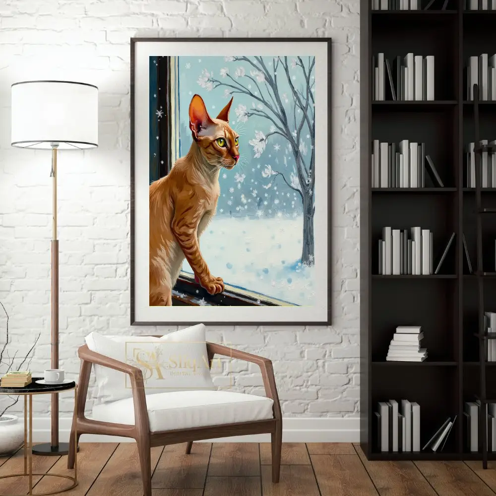 Capture the quiet wonder of a winter morning with this stunning painterly piece. Featuring an elegant orange tabby cat, likely a Cornish Rex, perched thoughtfully by a window, this artwork beautifully contrasts the warm, vibrant ginger tones of the feline with the cool, serene blues and whites of a falling snow landscape.