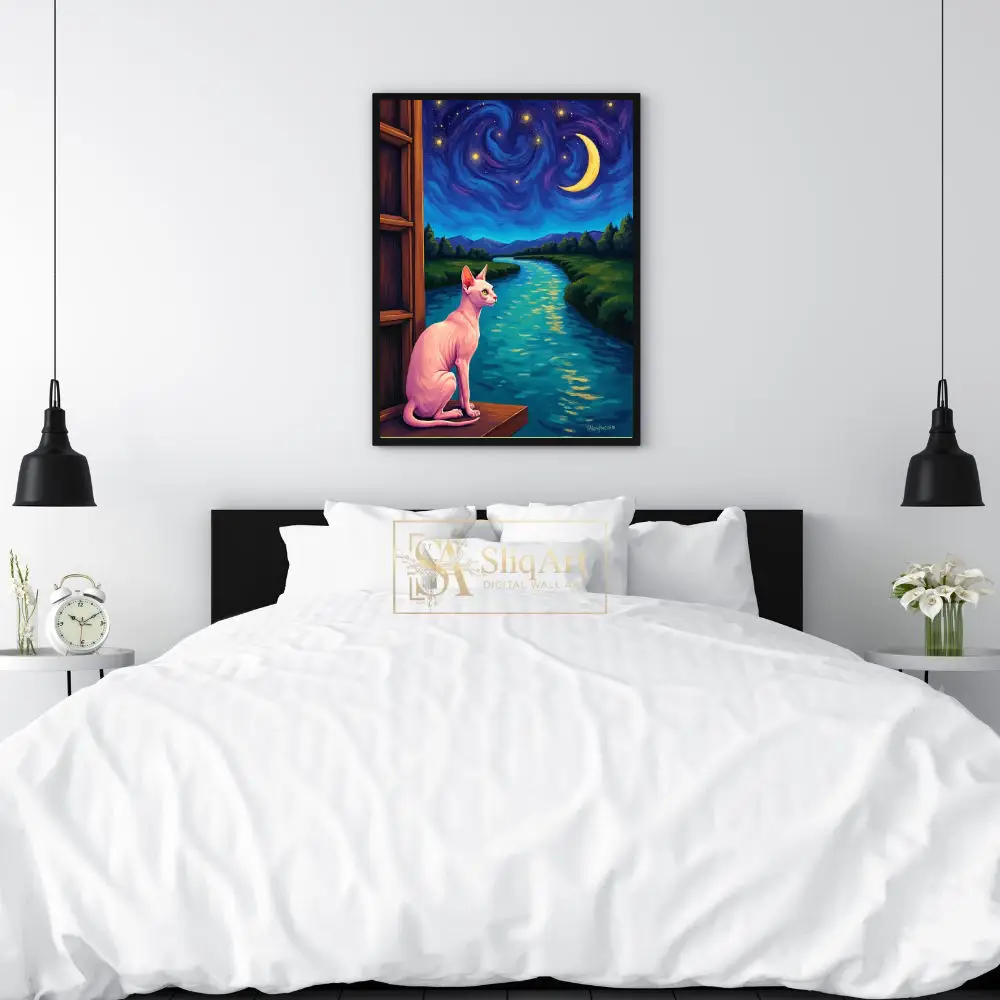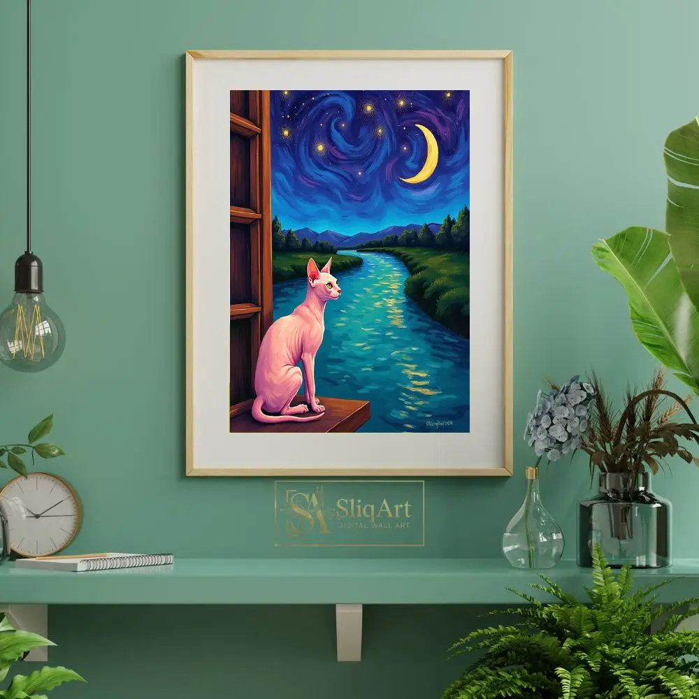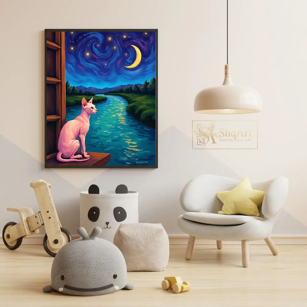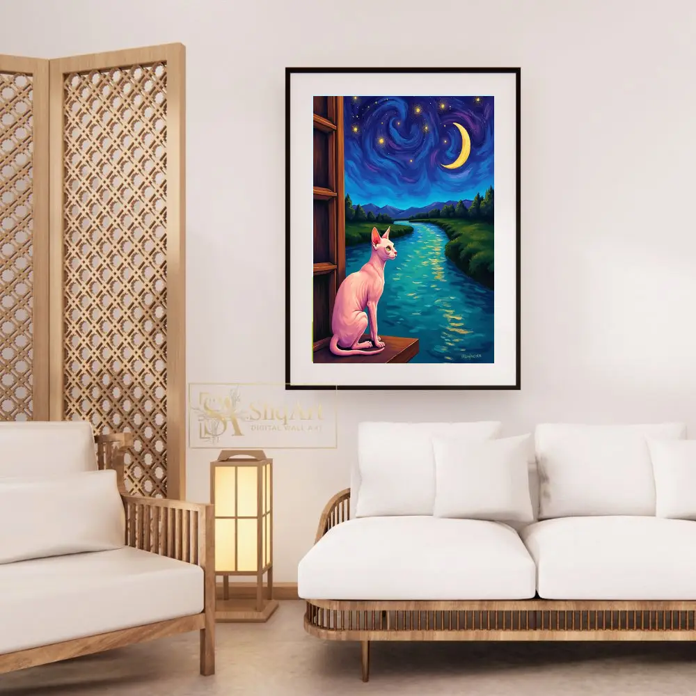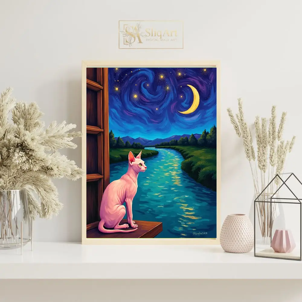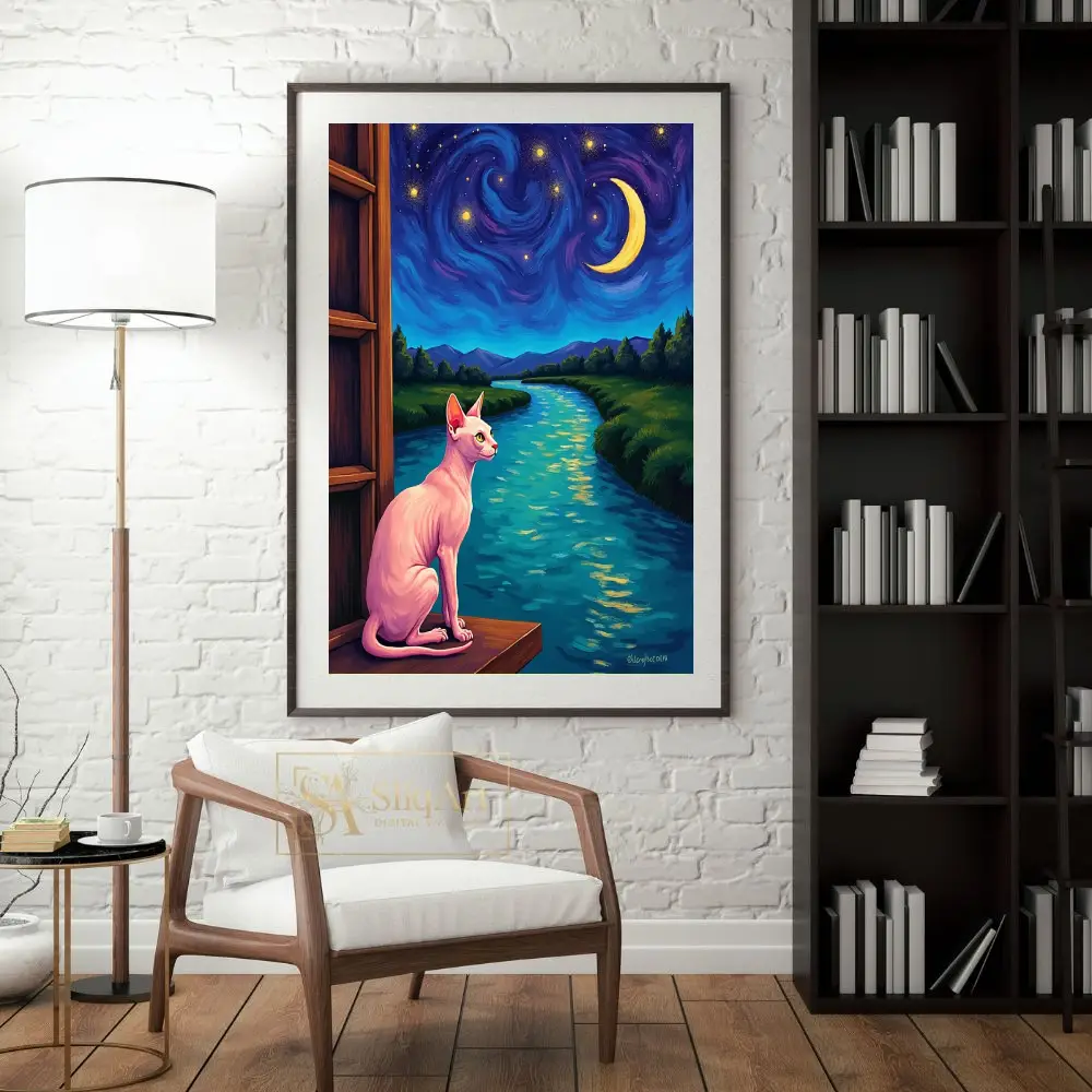 Inspired by Van Gogh’s masterpiece, this piece features a hairless cat sitting contemplatively by a window, looking out over a vibrant night sky filled with glowing stars and a crescent moon. The deep blues of the sky and the shimmering reflections on the river create a soothing yet dynamic atmosphere, while the pink hues of the cat offer a striking and modern contrast.