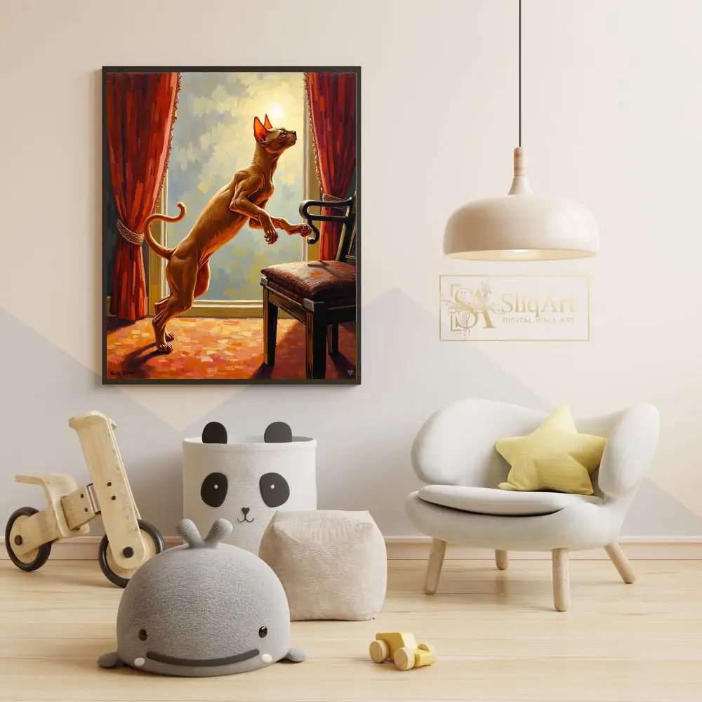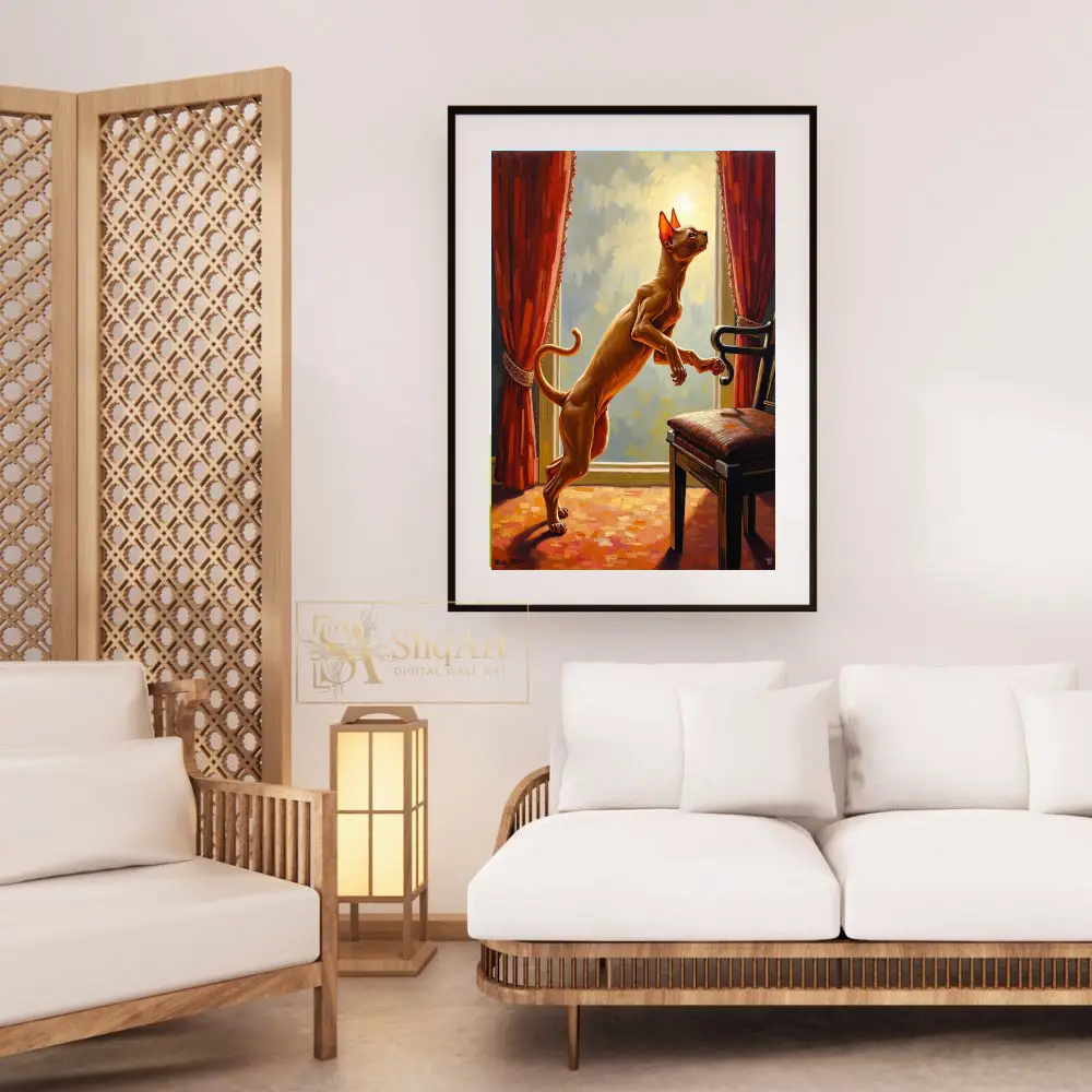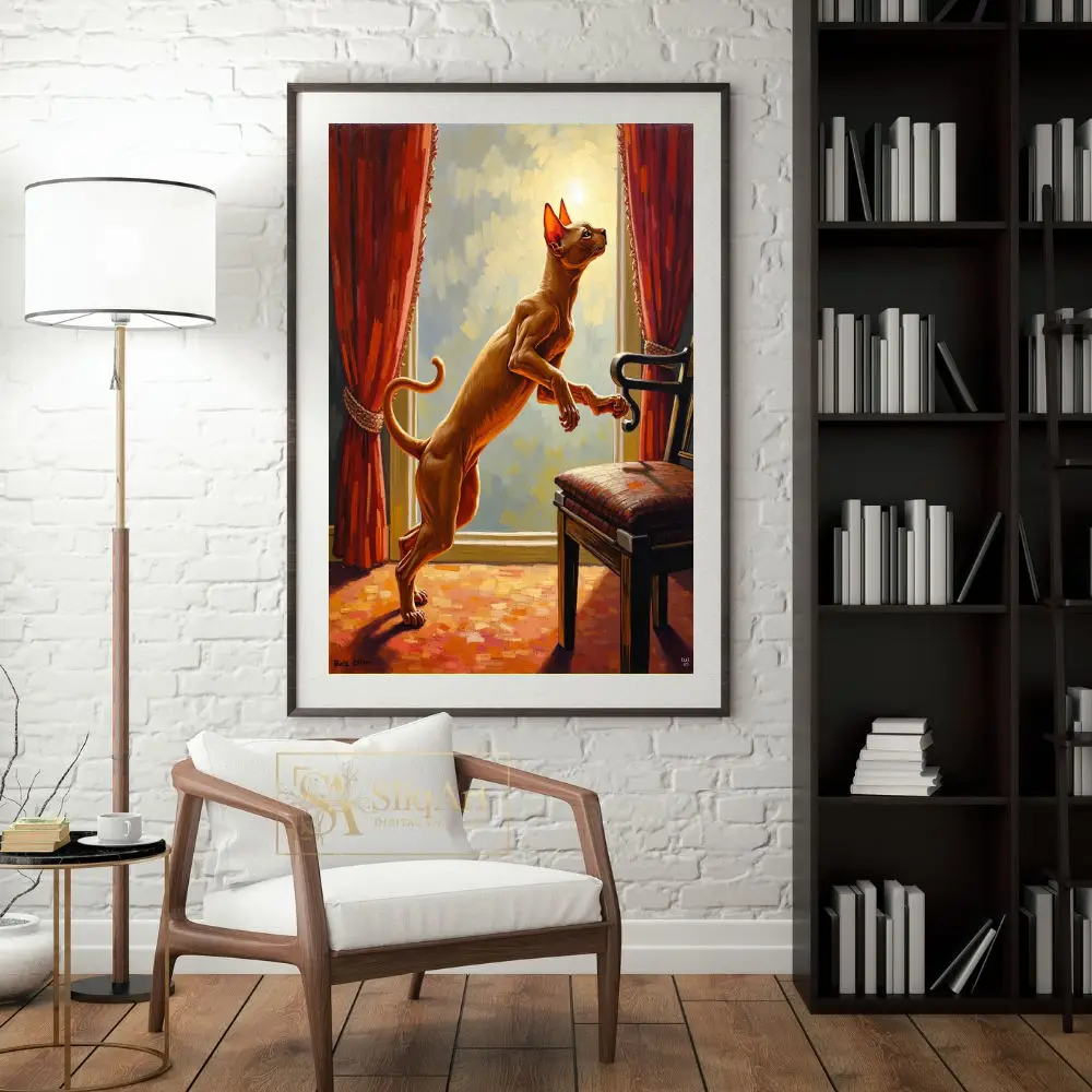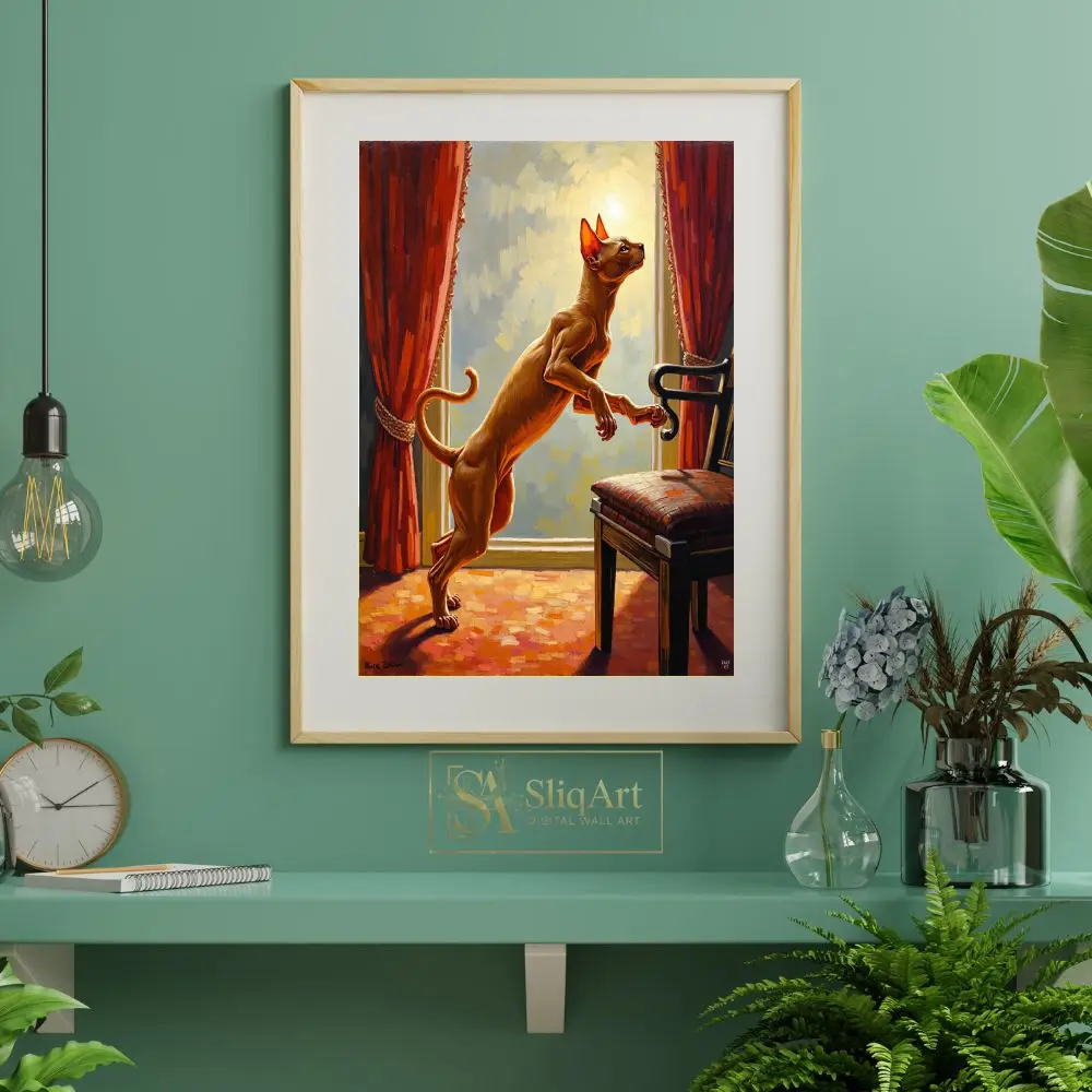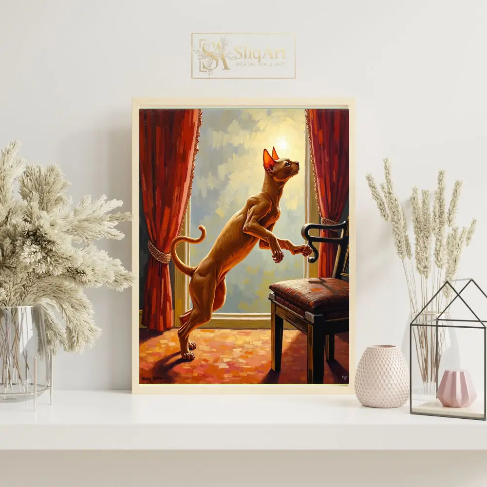 Experience the captivating beauty of the Sphynx breed with this masterfully rendered impressionist painting. The artwork depicts a muscular hairless cat gracefully reaching toward a sunlit window, its skin glowing with golden and amber hues.