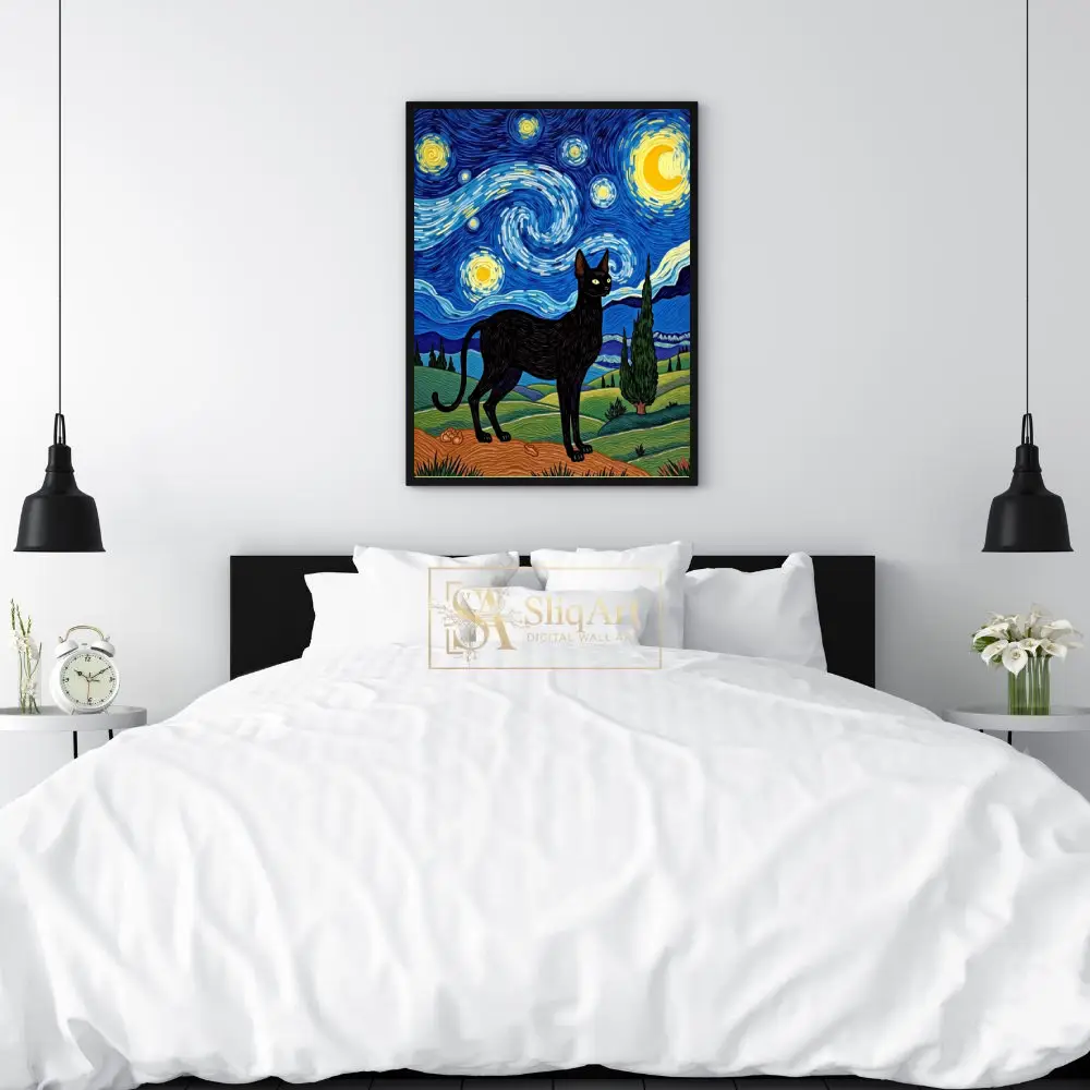 Starry Night Black Cat Canvas Art – Van Gogh Inspired Feline Decor