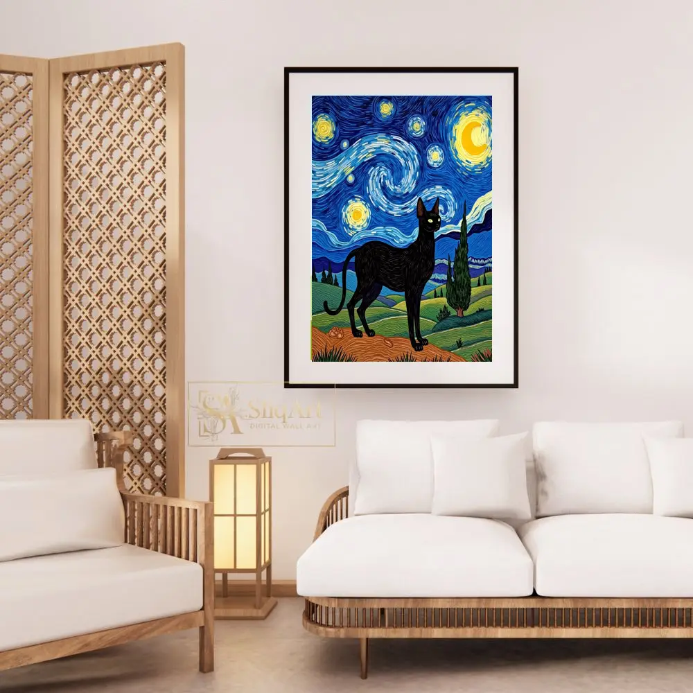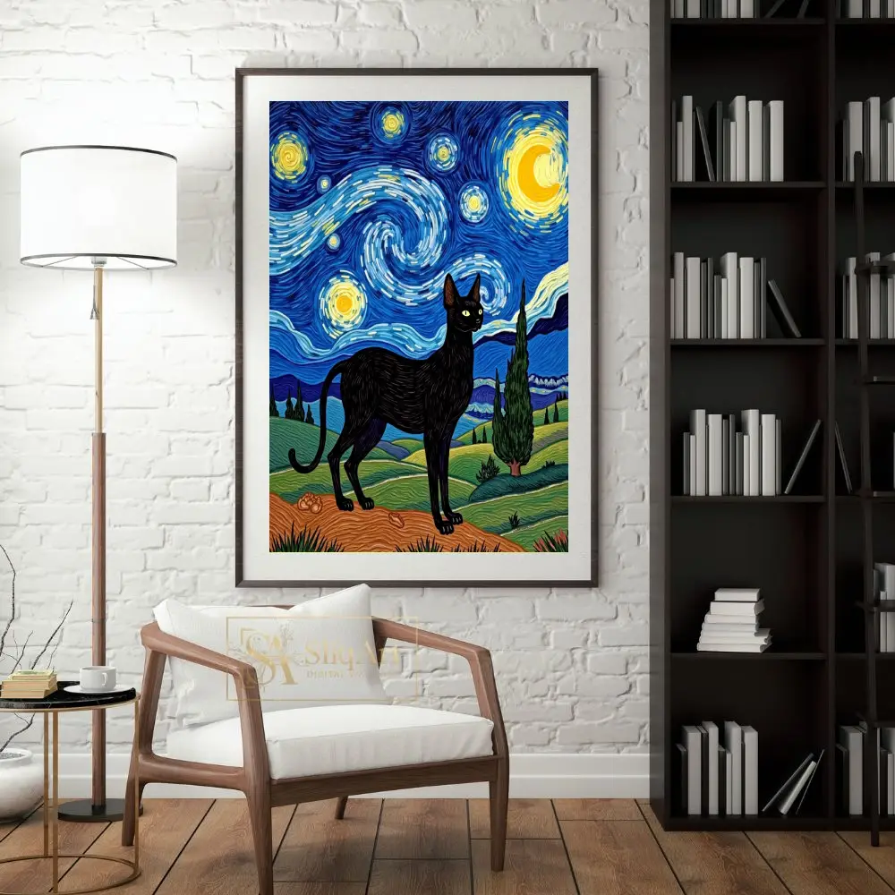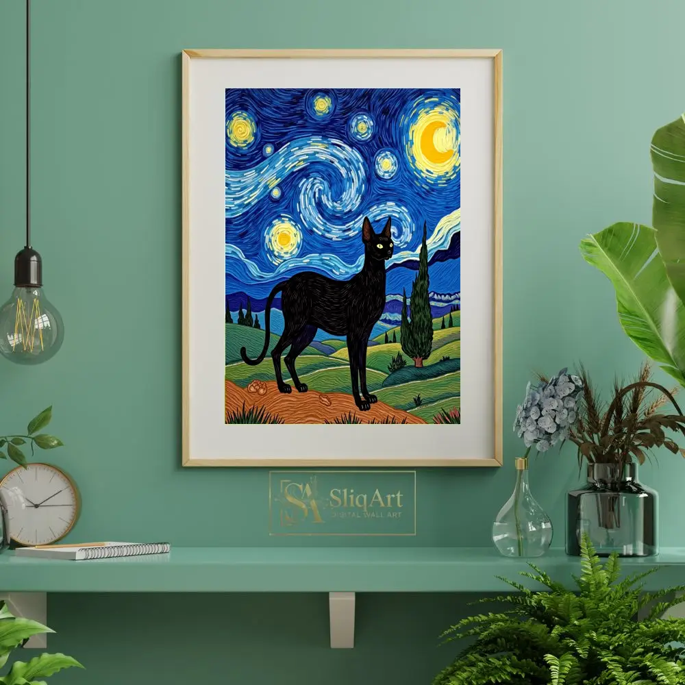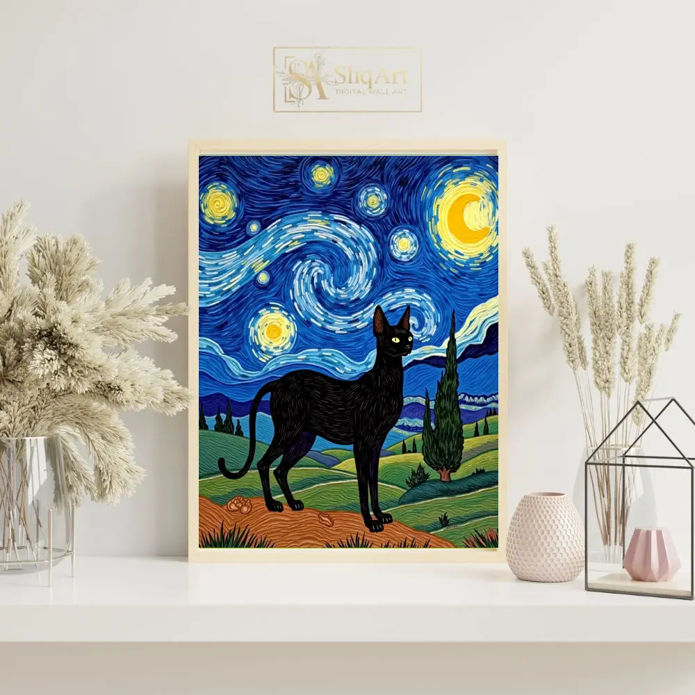 Elevate your interior design with this mesmerizing digital painting that pays homage to Vincent van Gogh’s ‘The Starry Night’. At the heart of the composition stands a sleek, regal black cat, its silhouette sharply defined against a backdrop of swirling celestial energy.