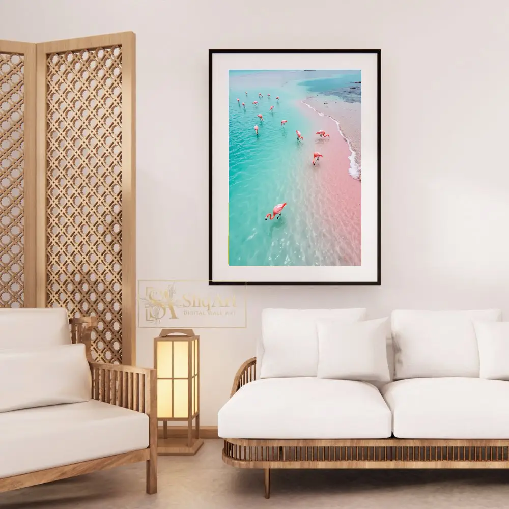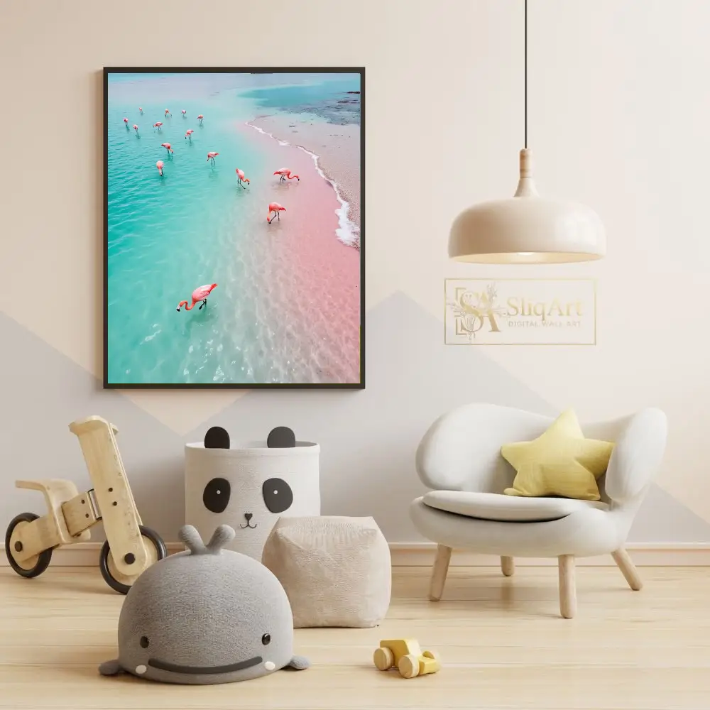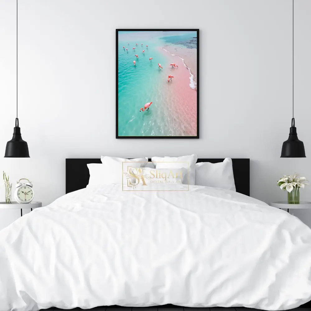Transform your walls into a tropical oasis with this breathtaking aerial photograph. Capturing a flock of vibrant pink flamingos as they wade through crystalline turquoise waters along a rare pink sand shore, this piece is a masterclass in natural color theory.