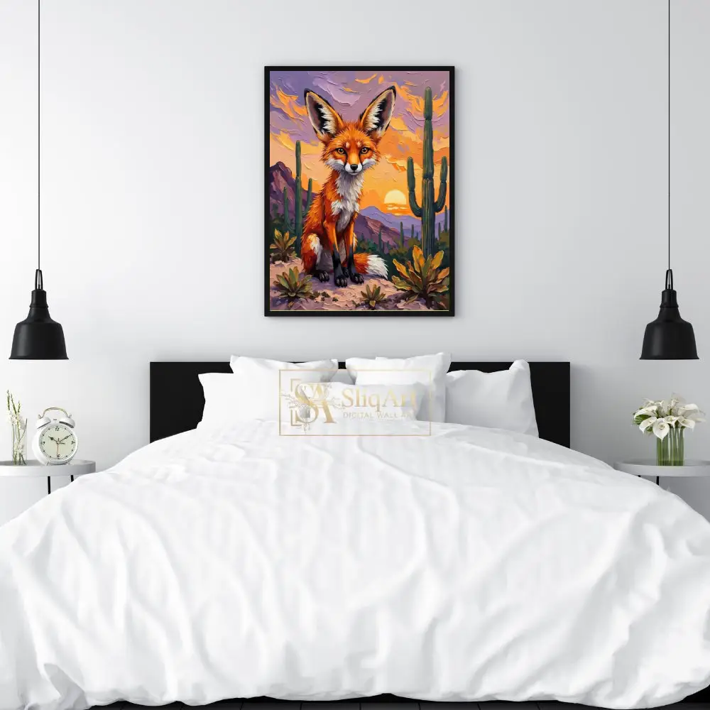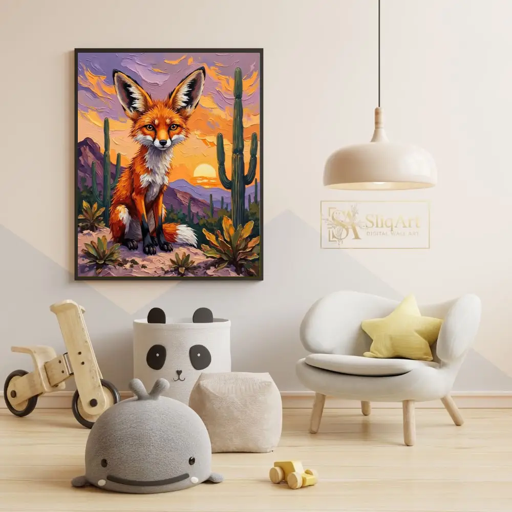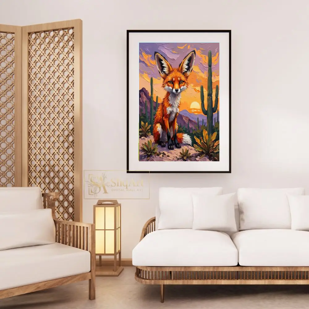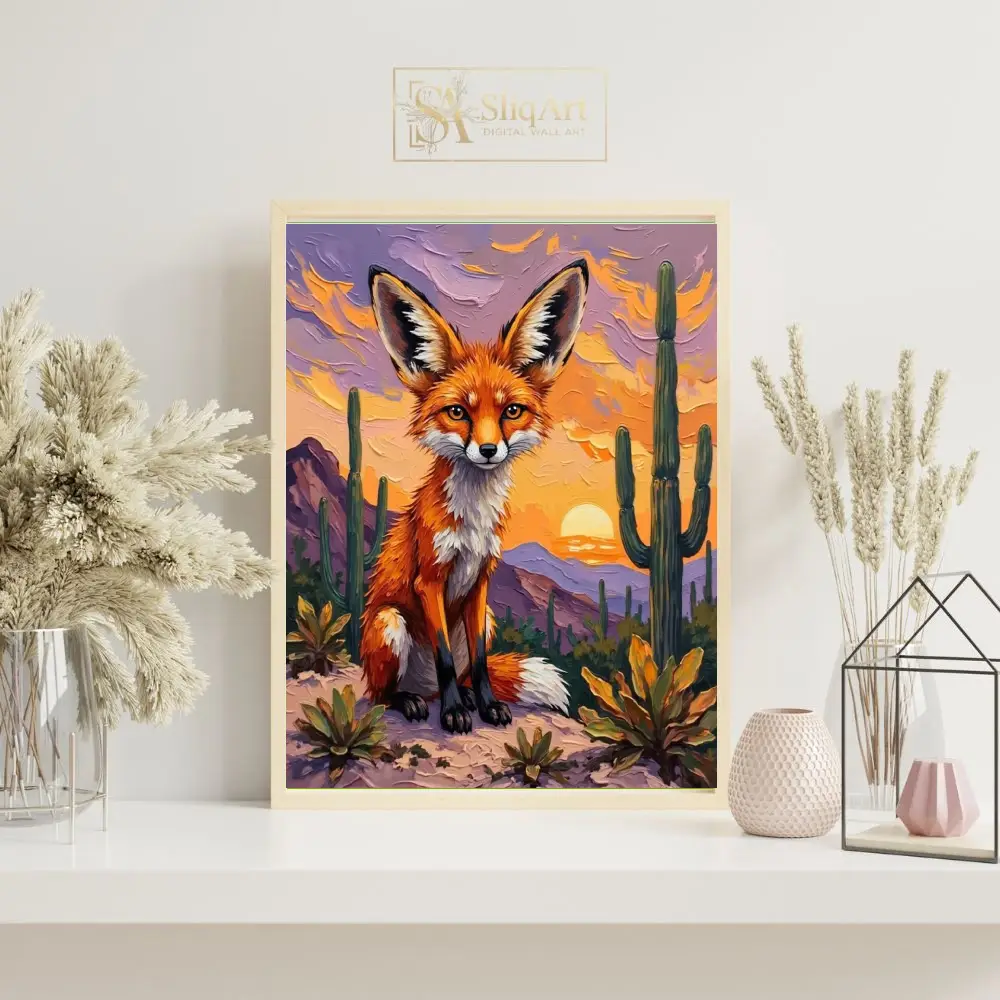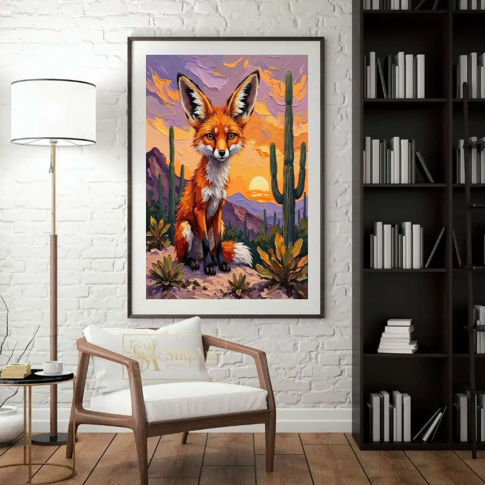 Capture the enchanting spirit of the desert with this stunning impasto-style painting featuring a majestic fox. Bathed in the warm, golden glow of a setting sun, the fox sits poised amidst towering saguaro cacti and purple-hued mountains.
