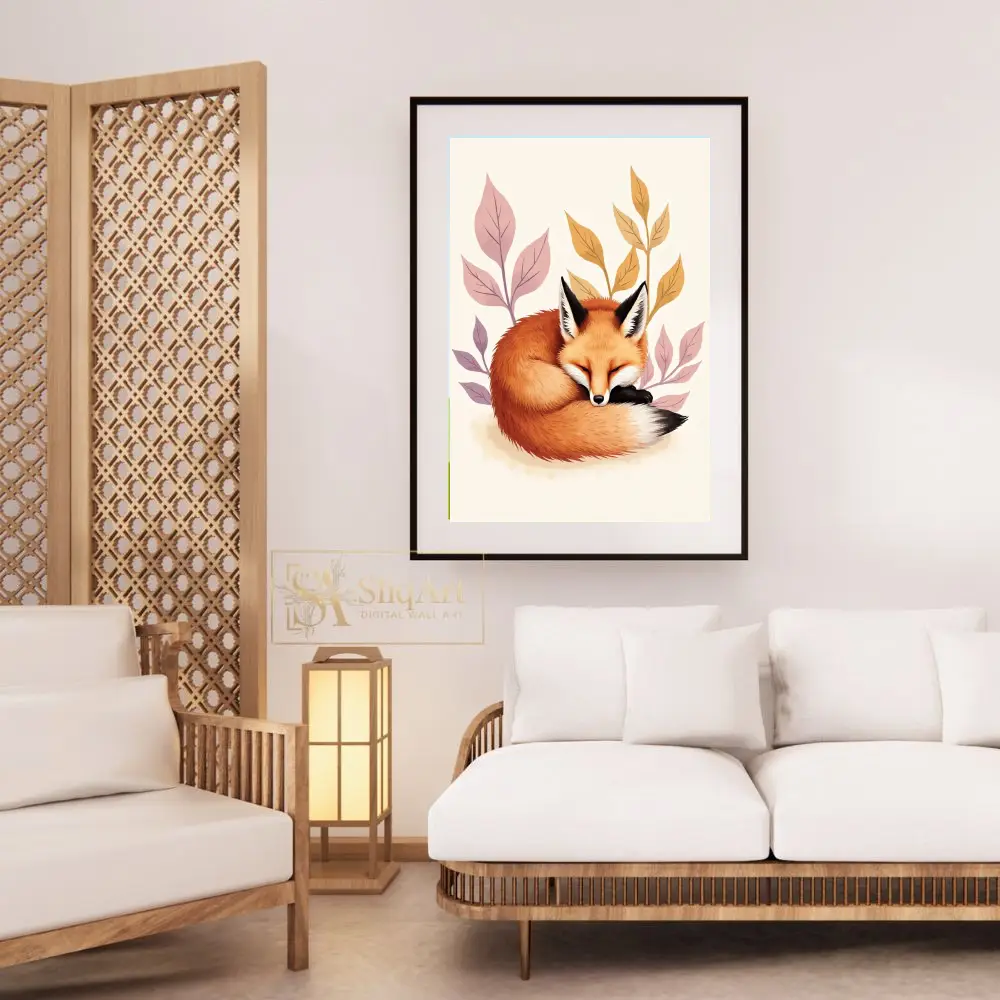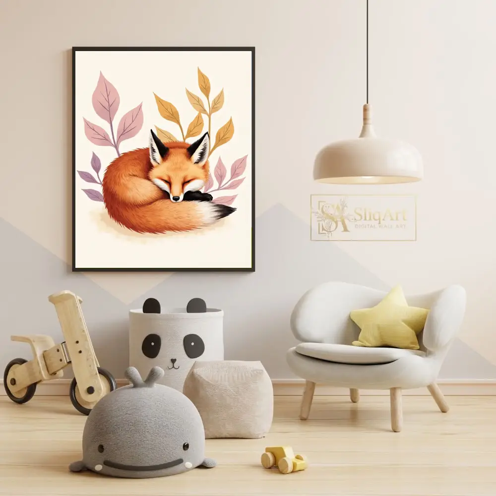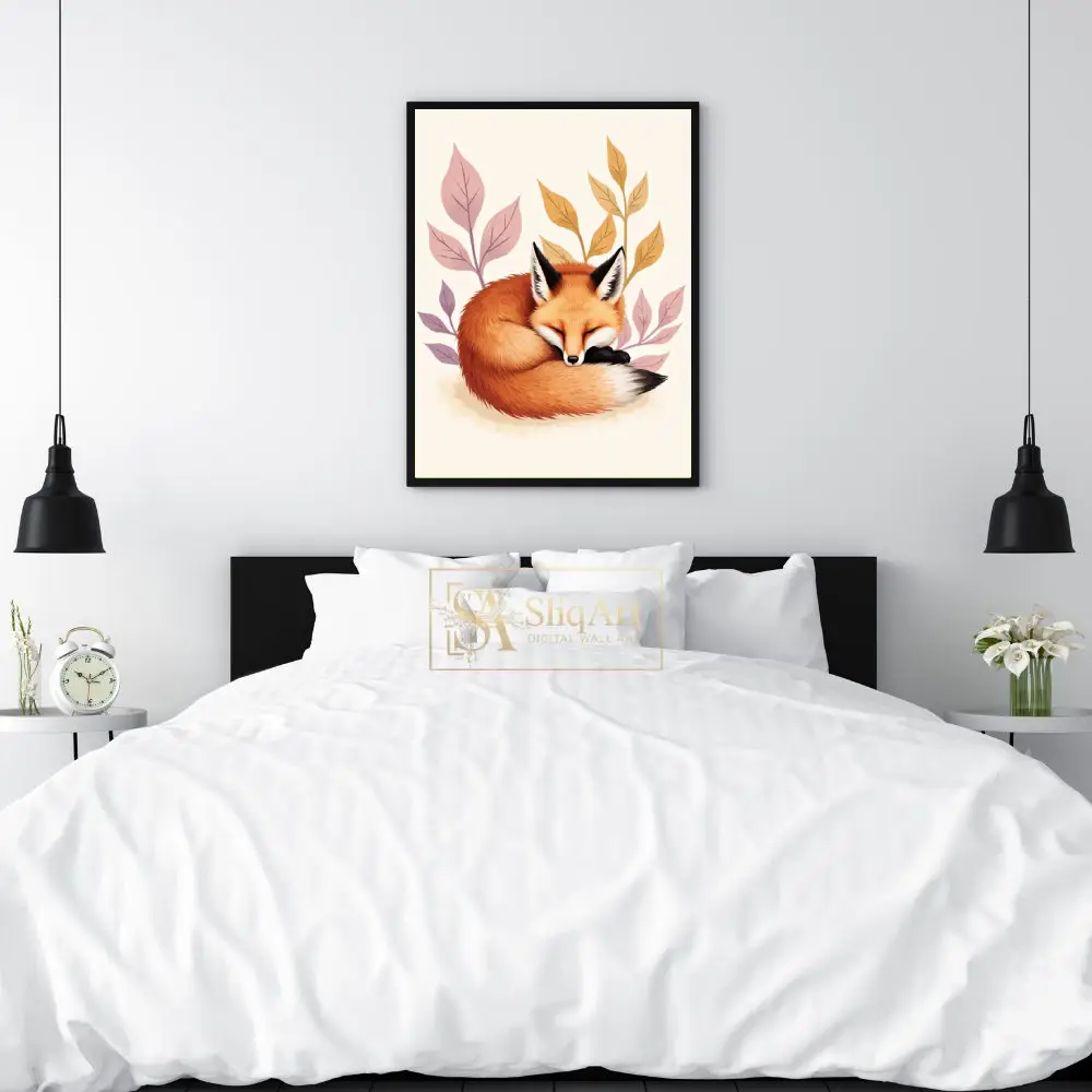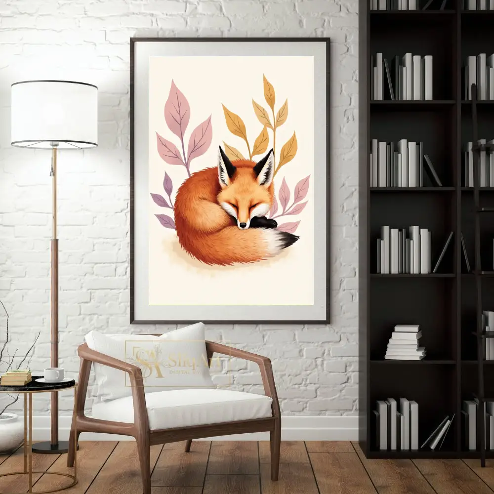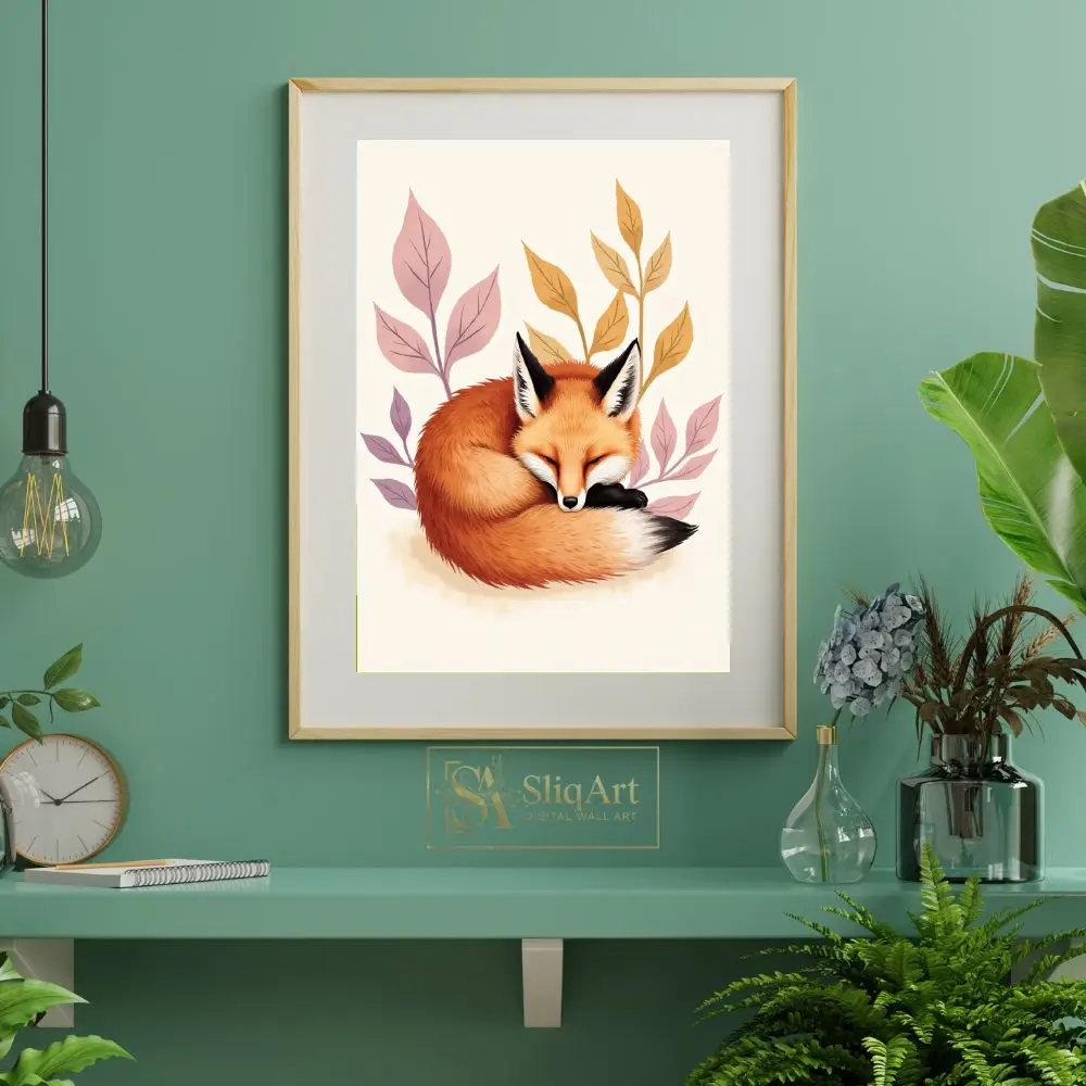 Embrace the tranquility of the forest with this charming illustration of a red fox curled in a peaceful slumber. Nestled among stylized leaves in soft hues of lavender and ochre, this artwork captures a moment of pure serenity.