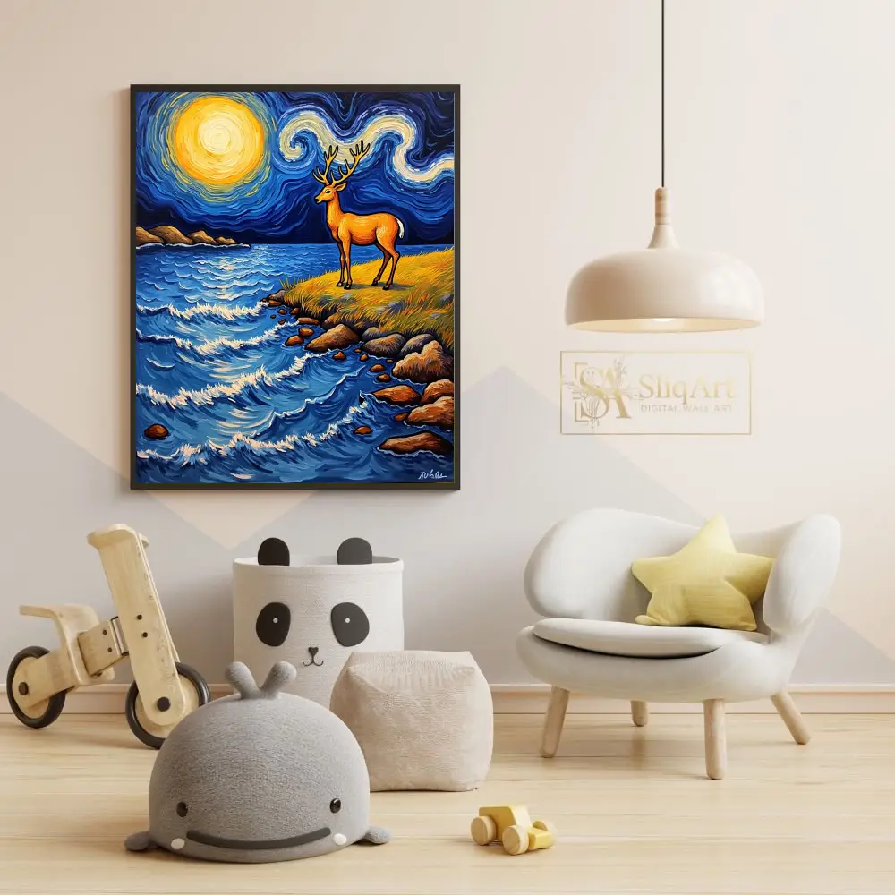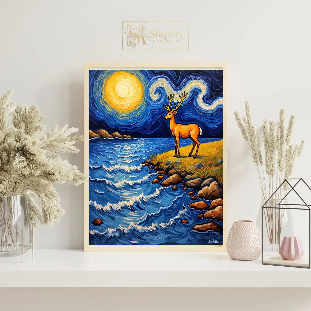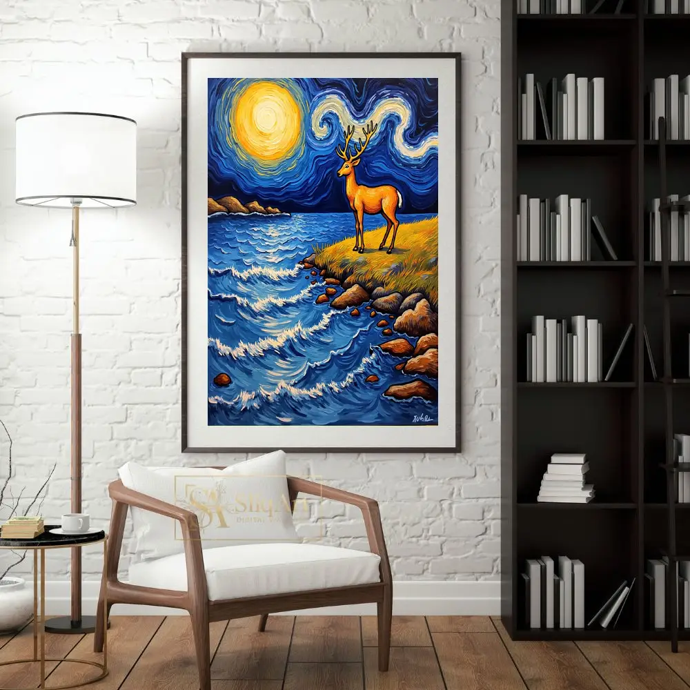 Elevate your interior with this breathtaking piece of wall art featuring a majestic golden stag standing at the edge of a turbulent, swirling ocean. Inspired by the legendary Post-Impressionist style of Vincent van Gogh, the artwork captures a glowing celestial body illuminating a dynamic sky filled with rhythmic patterns and deep blue hues.