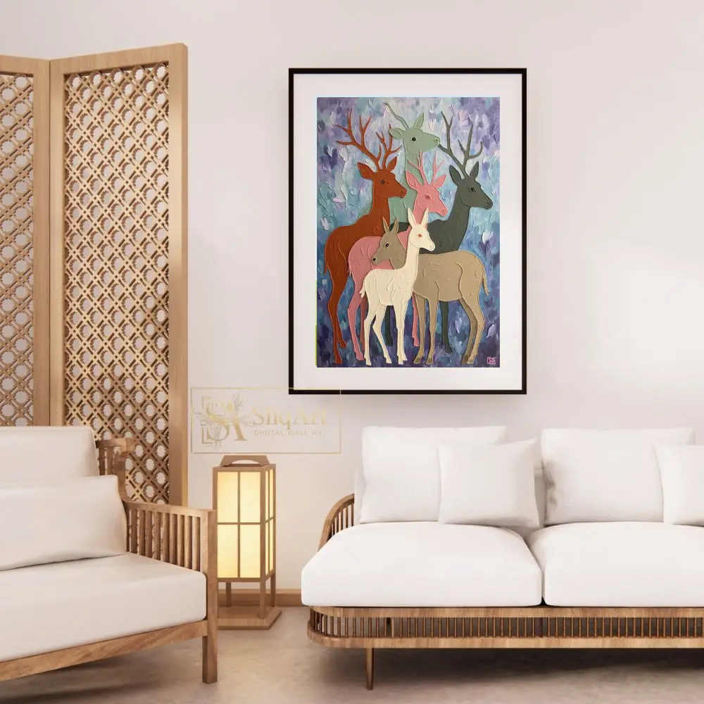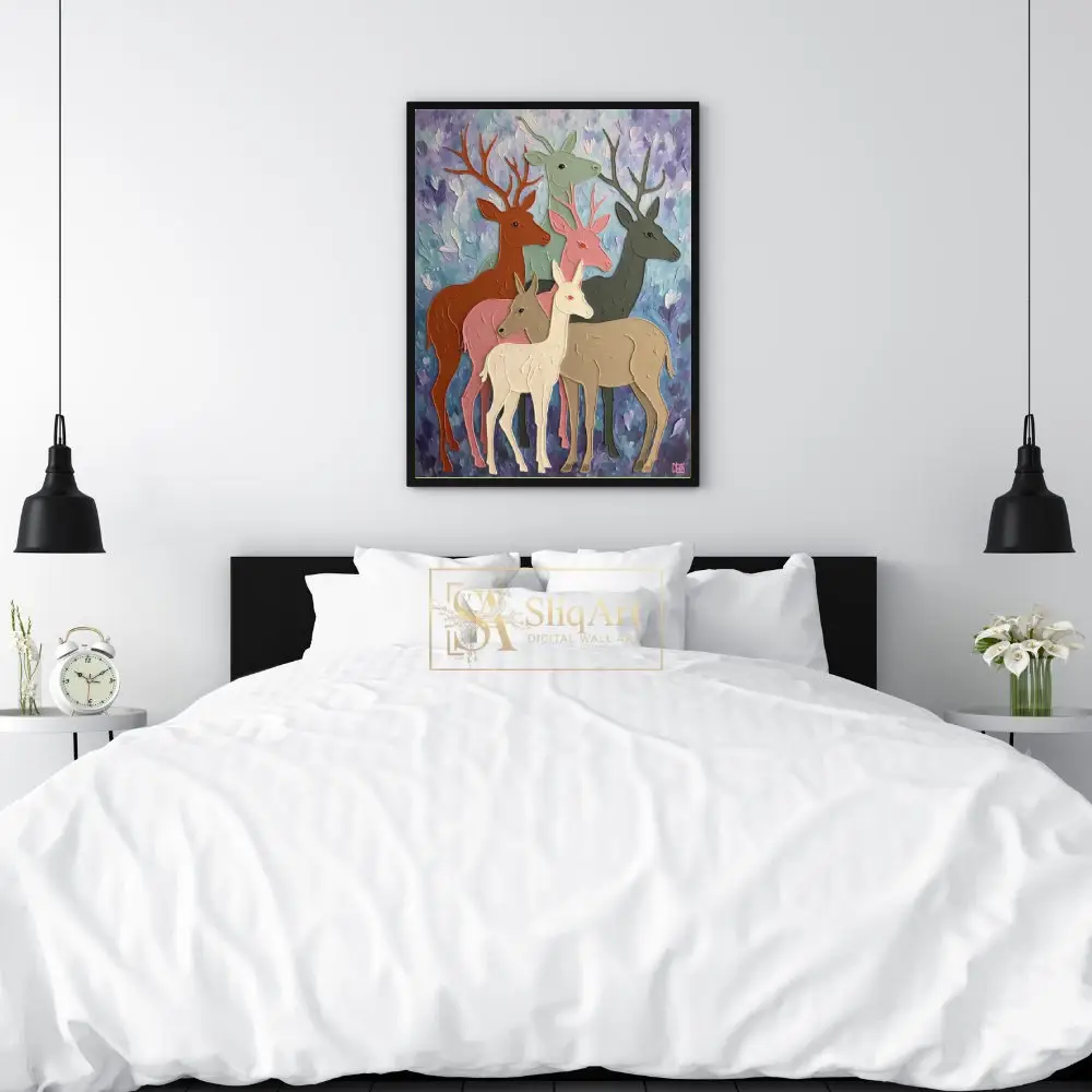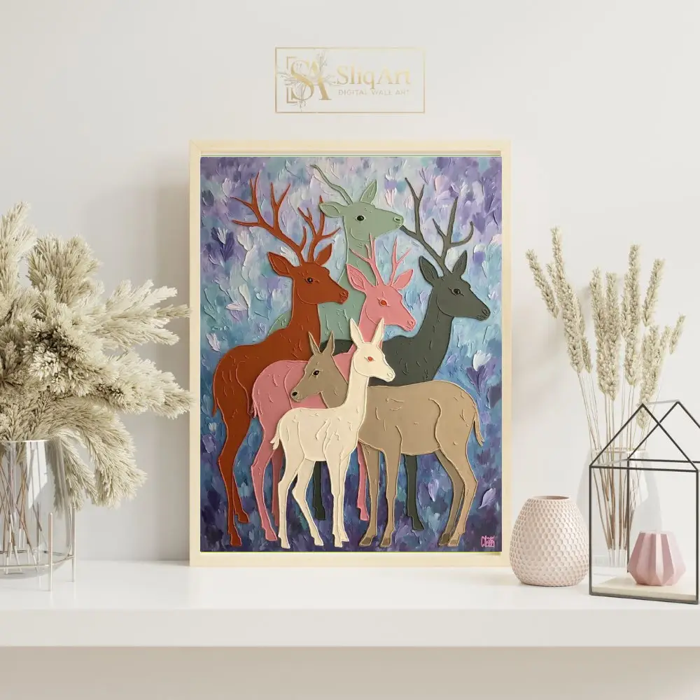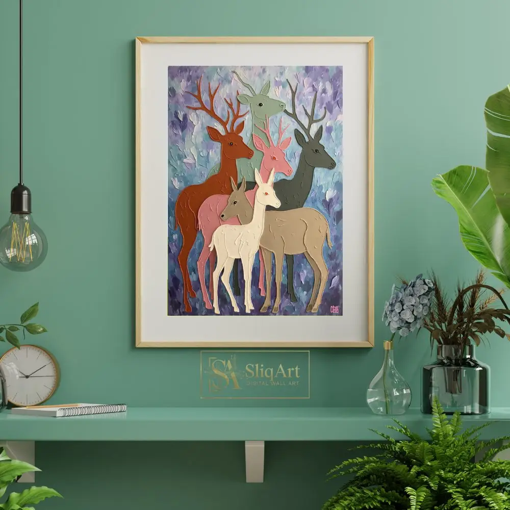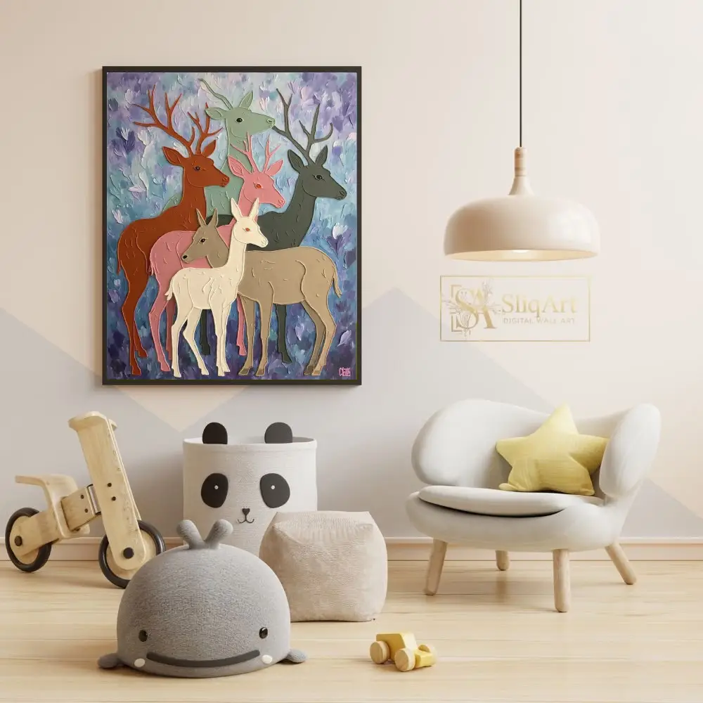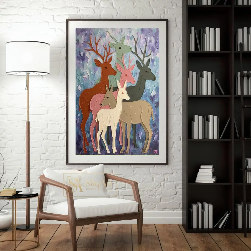 This captivating piece features a stylized herd of deer rendered in a unique contemporary style. Each animal is presented in a distinct color—ranging from earthy browns and tans to soft pinks and mint greens—creating a vibrant and harmonious composition.