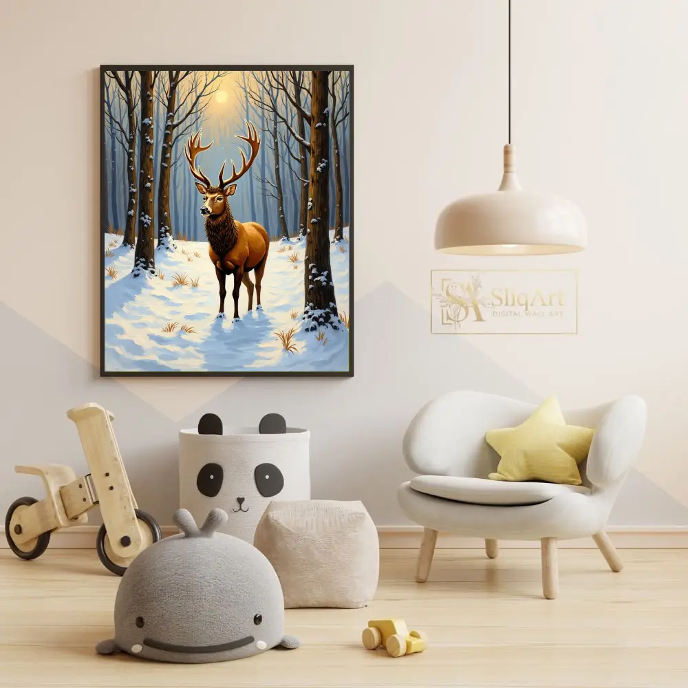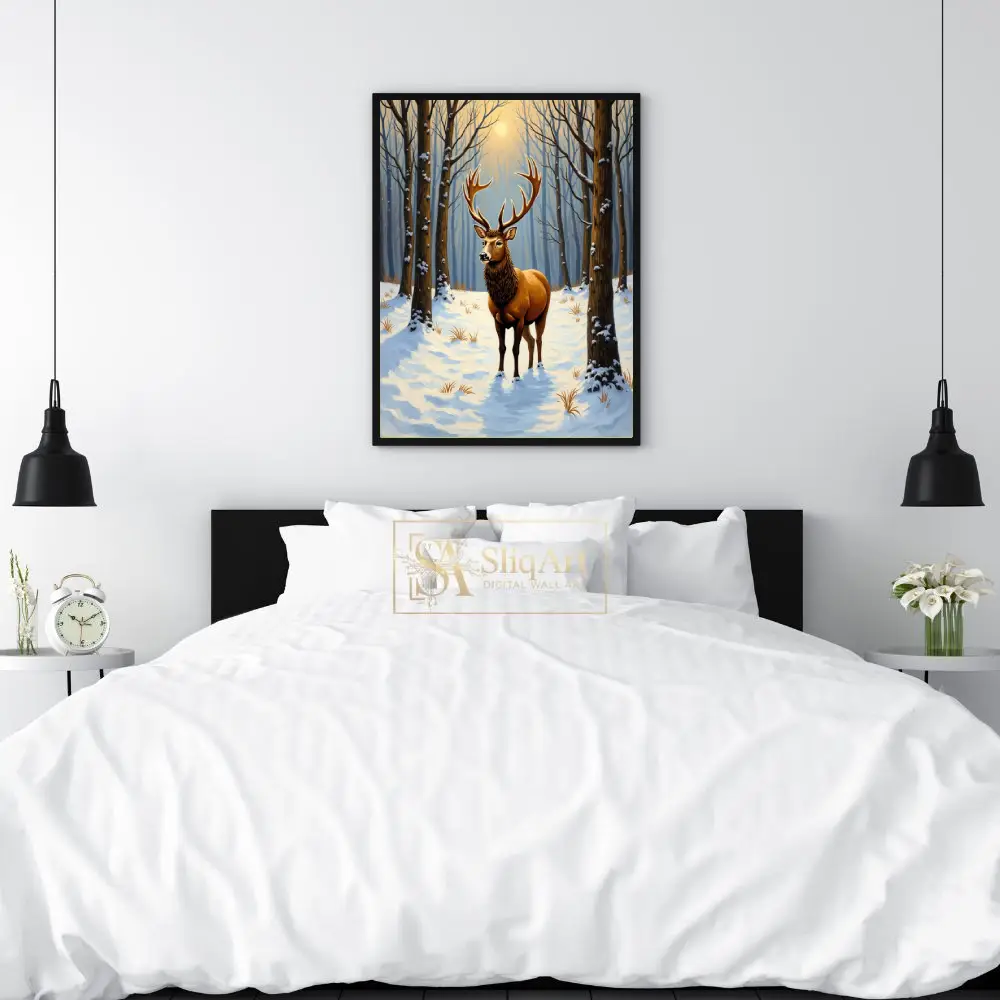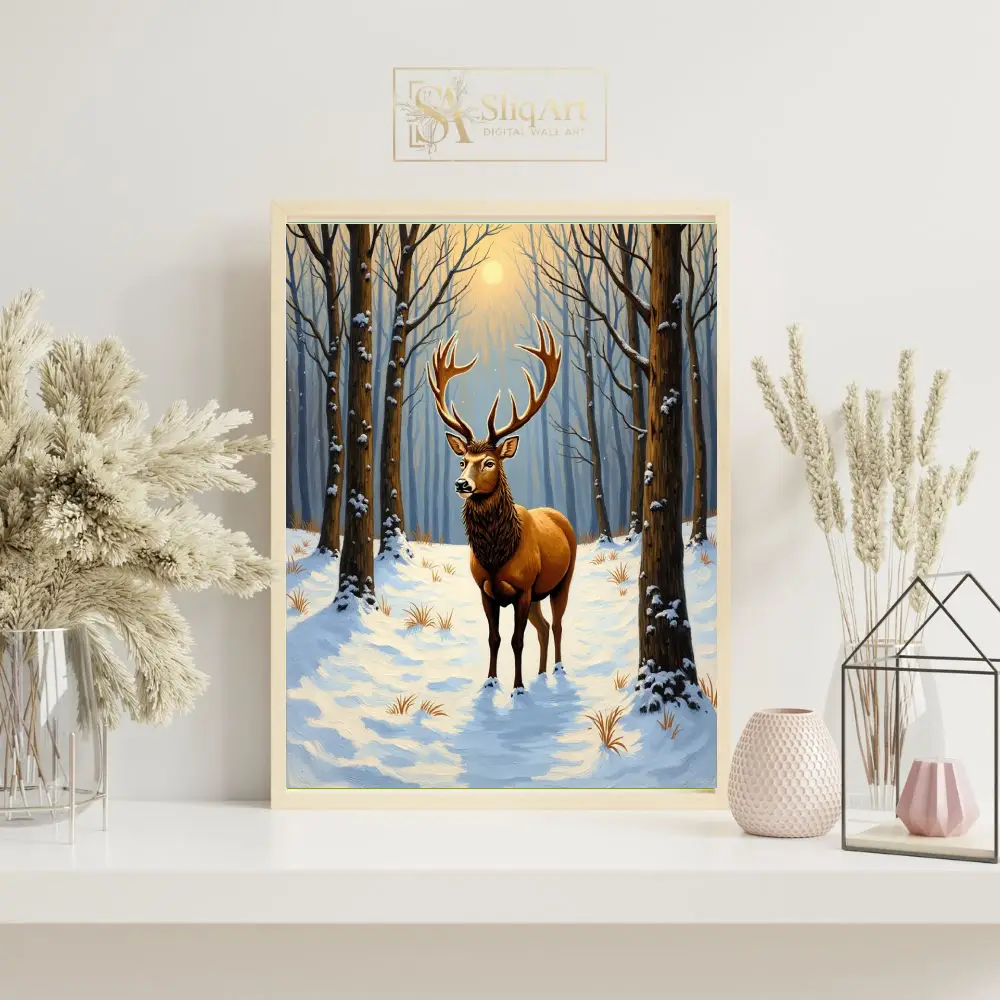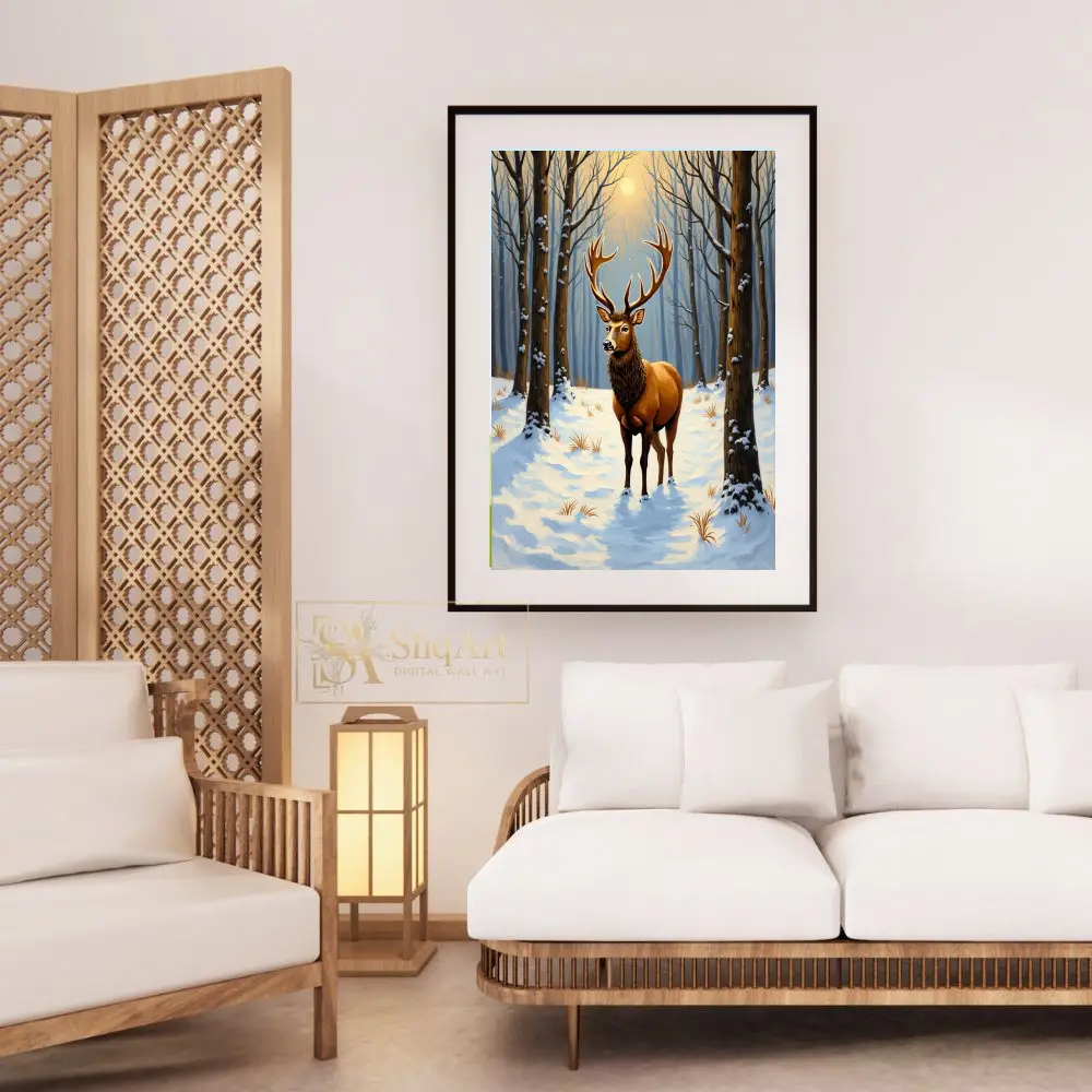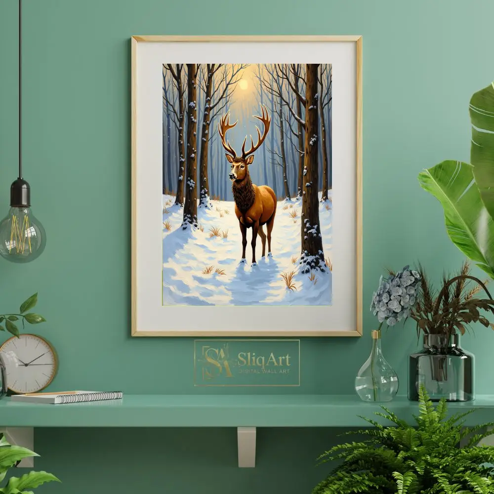 Capture the serene power of the wild with this stunning art print featuring a noble stag standing amidst a quiet, snow-covered forest. The low winter sun filters through the skeletal trees, casting a warm golden glow that illuminates the stag’s magnificent antlers and thick coat.