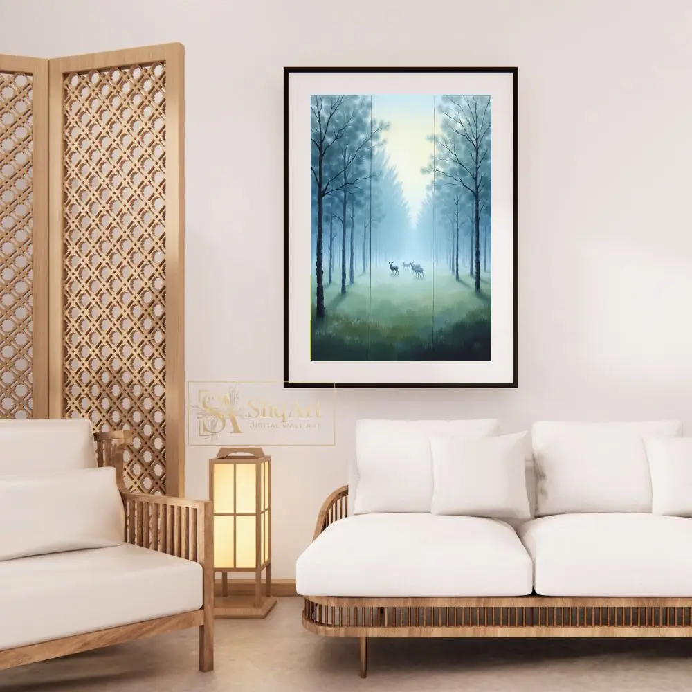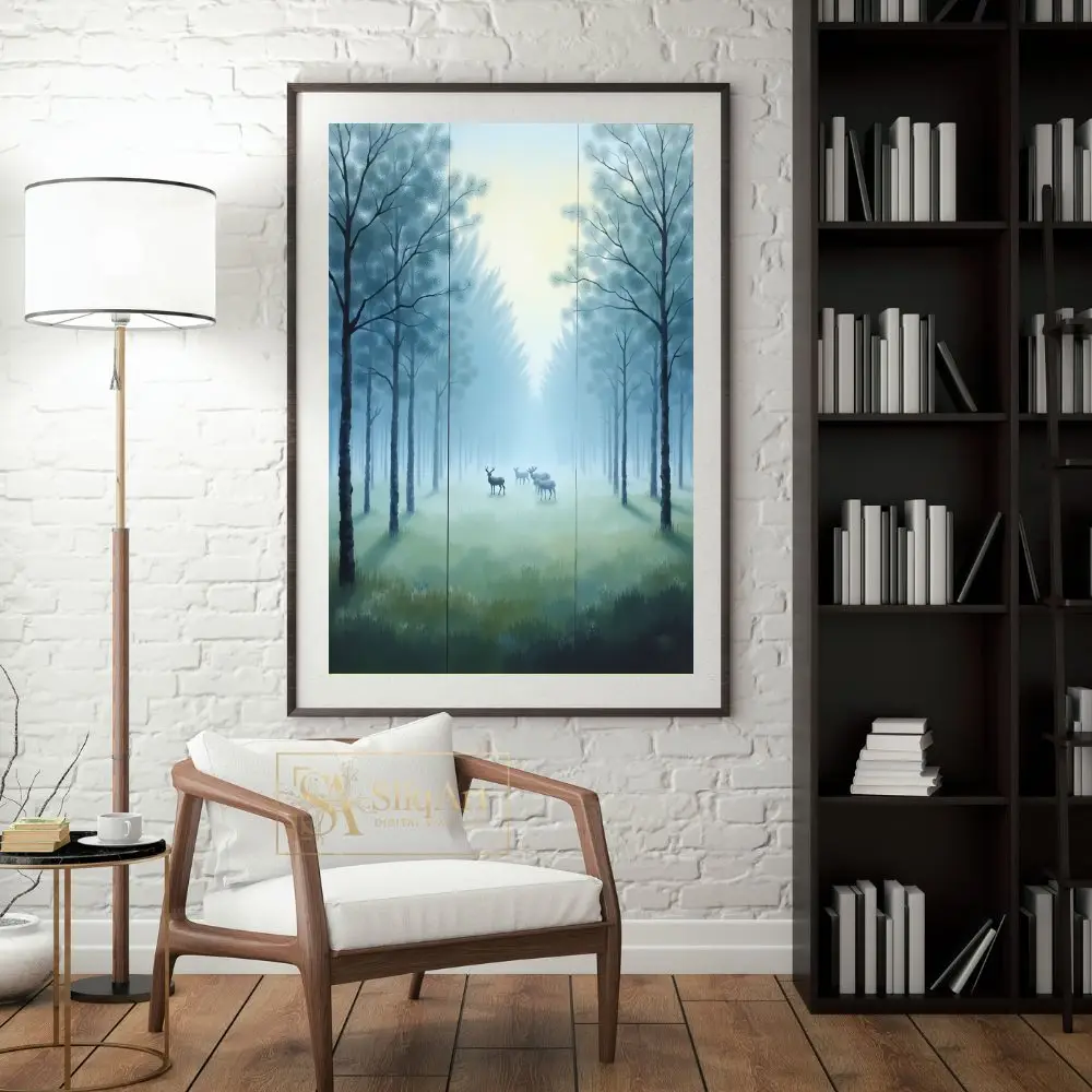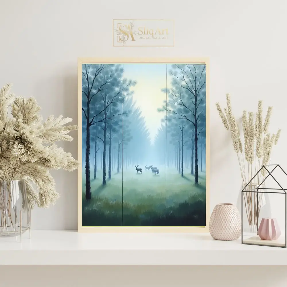 Experience the quiet majesty of nature with this ethereal triptych from SliqArt. Depicting a graceful herd of deer nestled within a fog-drenched forest, this artwork captures the fleeting magic of dawn.