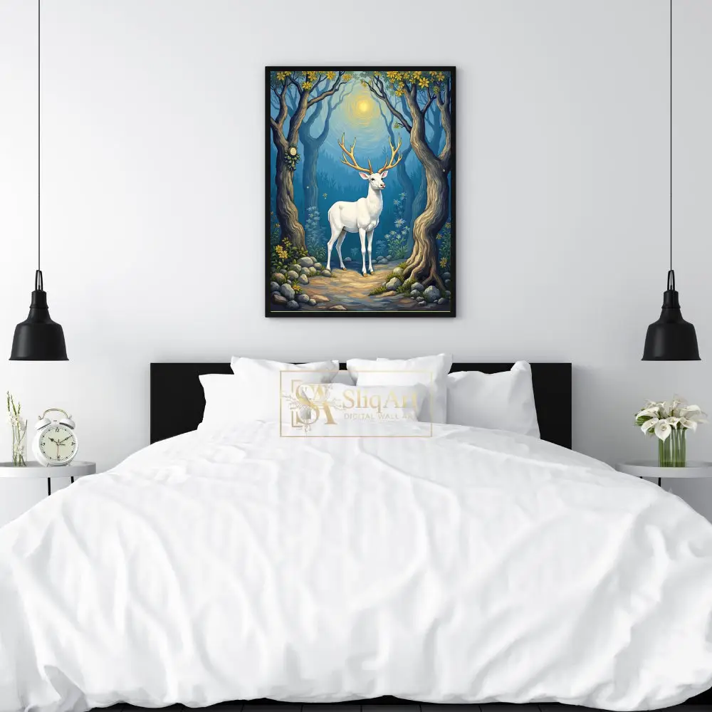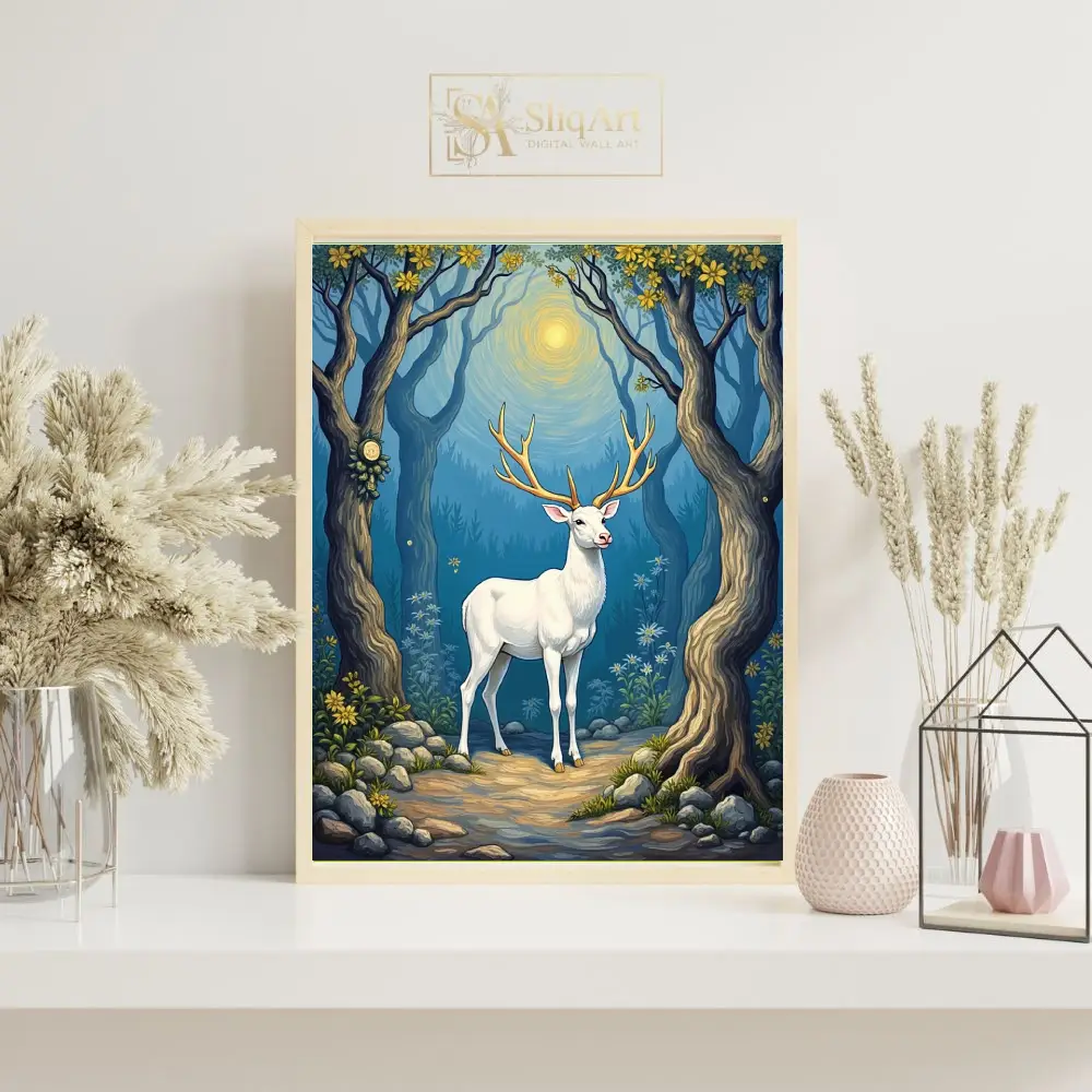 This captivating art piece features a majestic white stag standing gracefully in the heart of an enchanted forest. With its magnificent golden antlers and a serene expression, the stag becomes a symbol of purity and wonder.