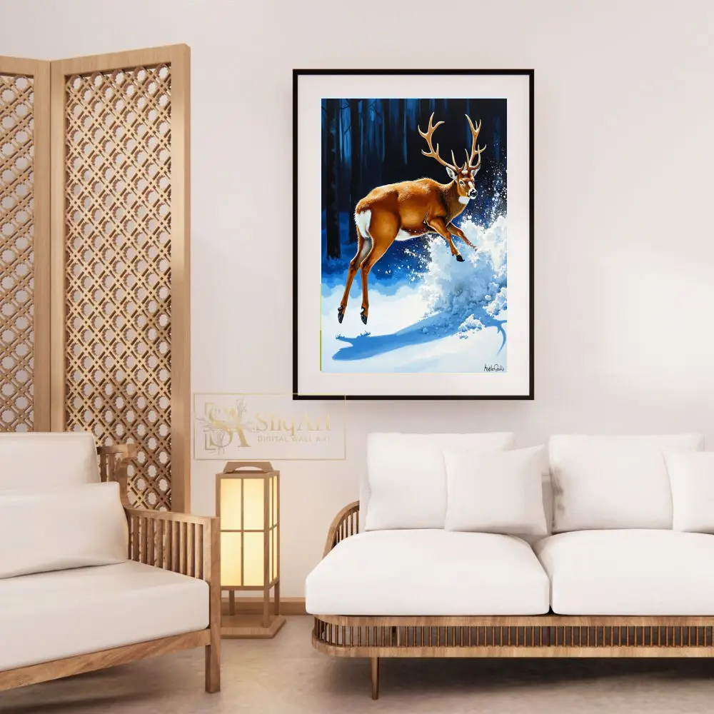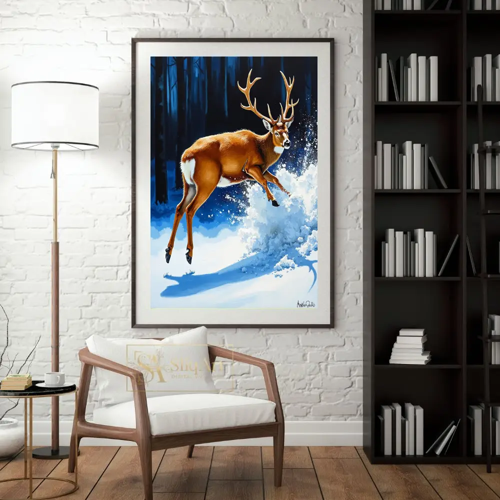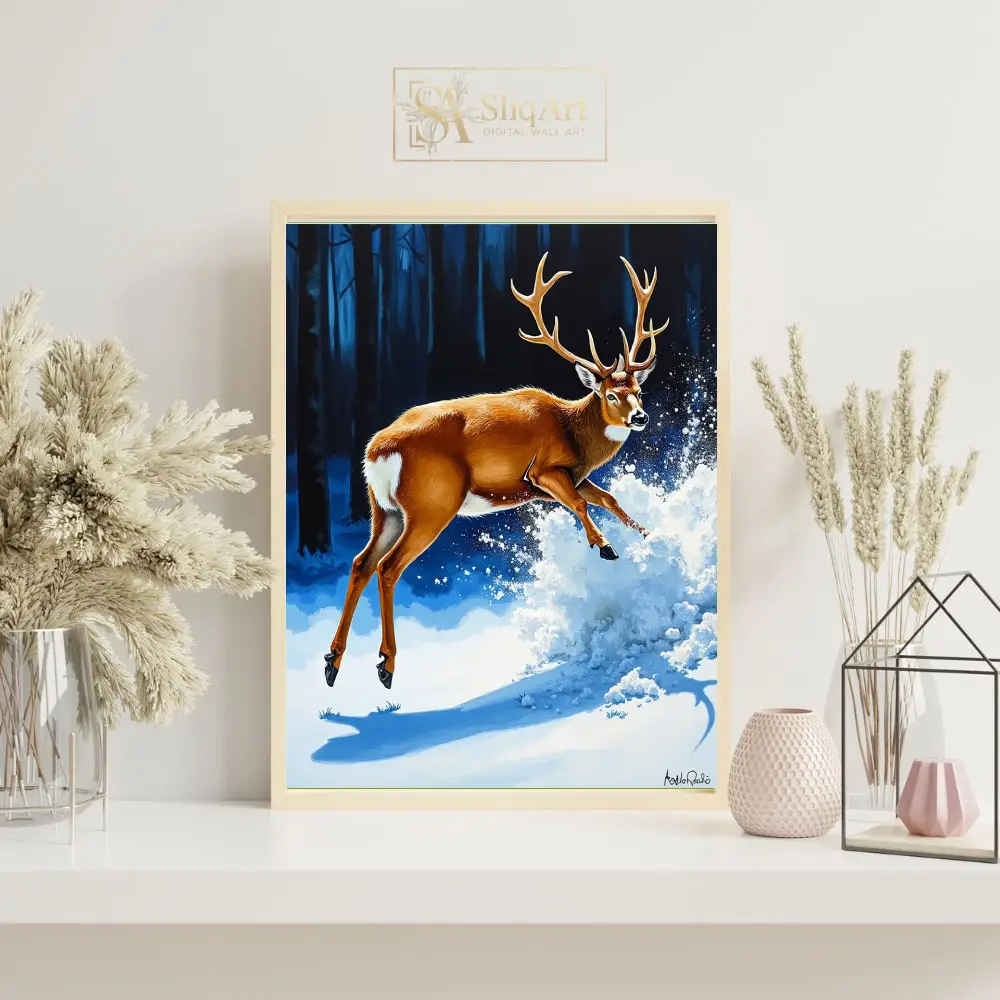 Capturing a moment of pure, dynamic energy, this stunning piece features a powerful buck leaping through a pristine winter landscape.