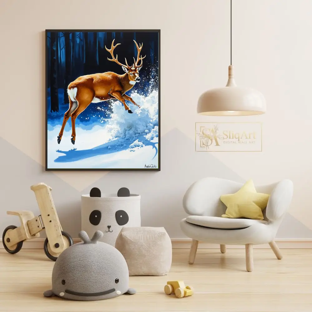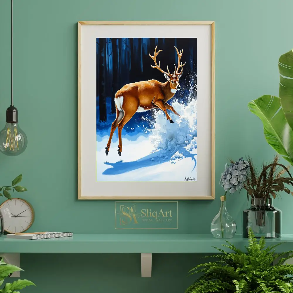 A vibrant and energetic painting of a majestic buck leaping through snow-covered woods, perfect for adding a touch of nature’s power to your home.
