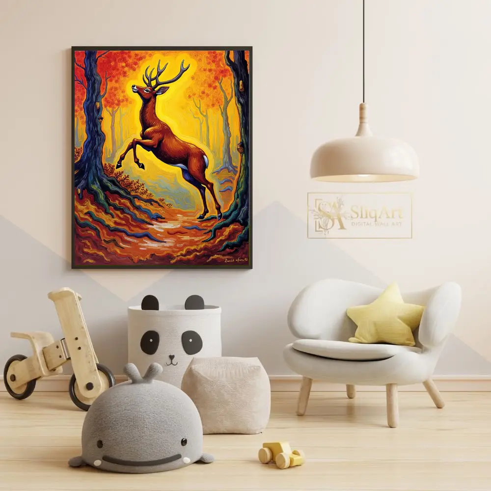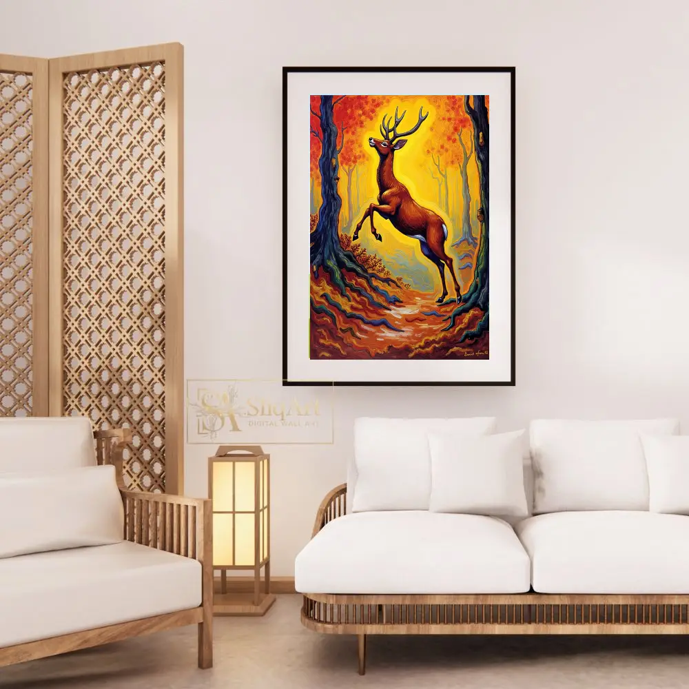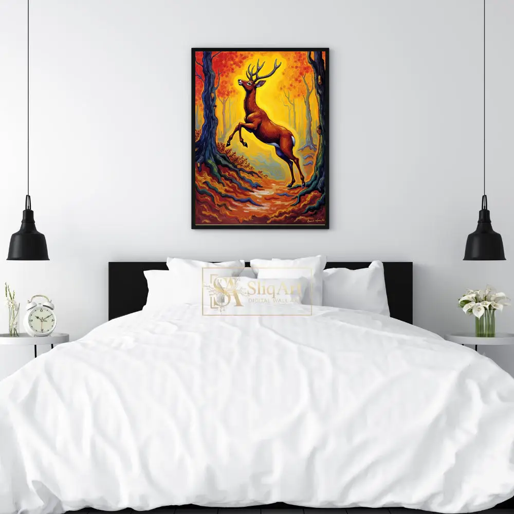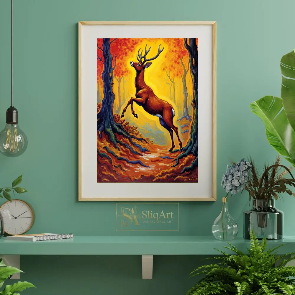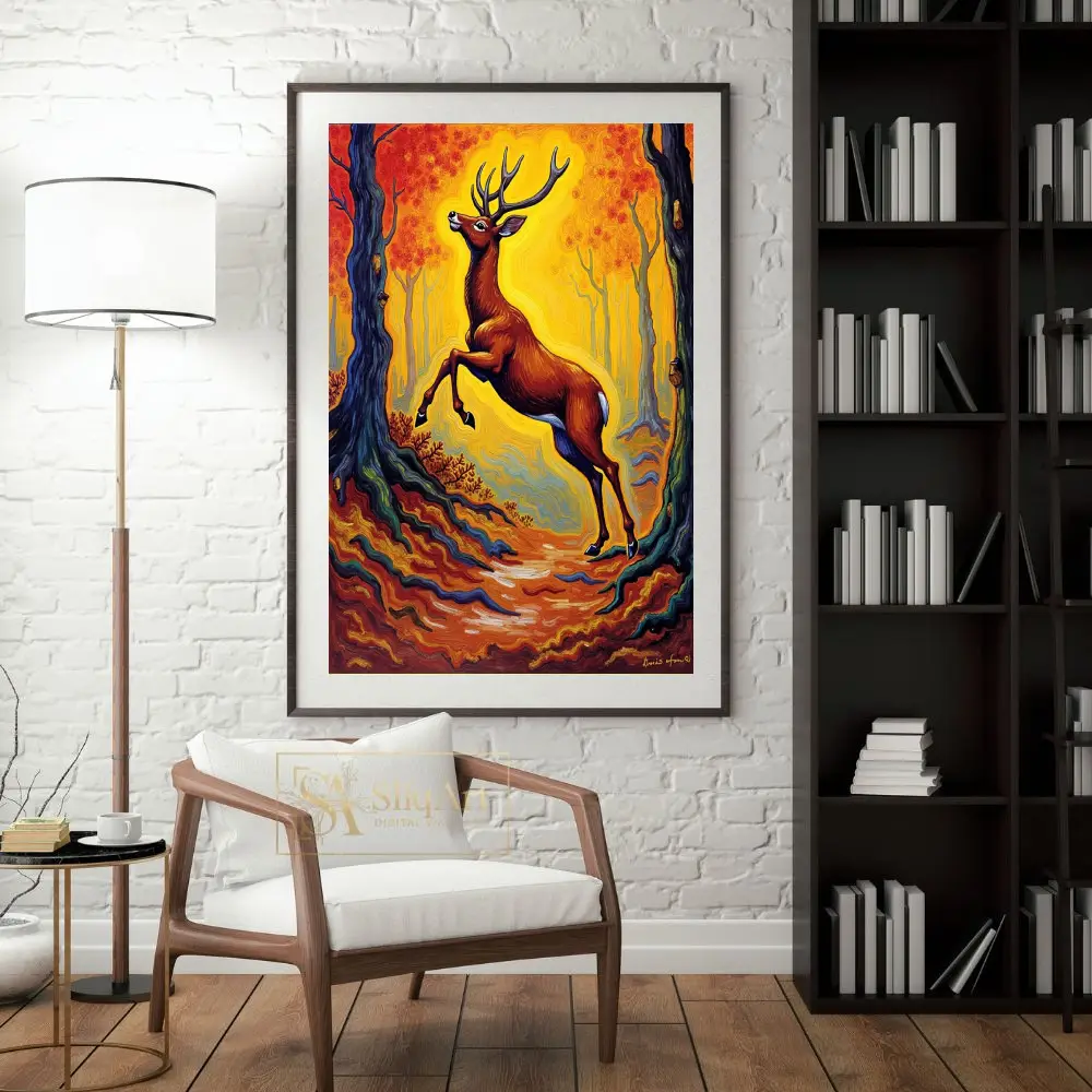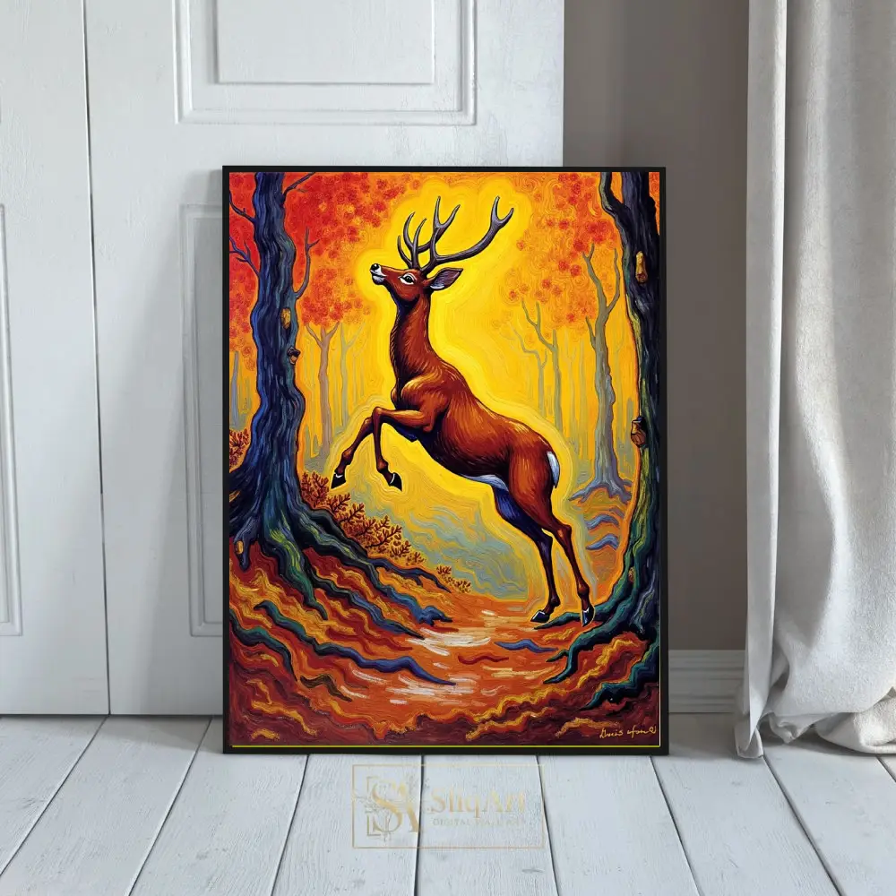 Capture the raw energy and mystical beauty of the wild with this stunning Post-Impressionist inspired painting. Featuring a majestic buck mid-leap, the artwork is set against a vibrant, swirling forest of golden yellows and fiery oranges.