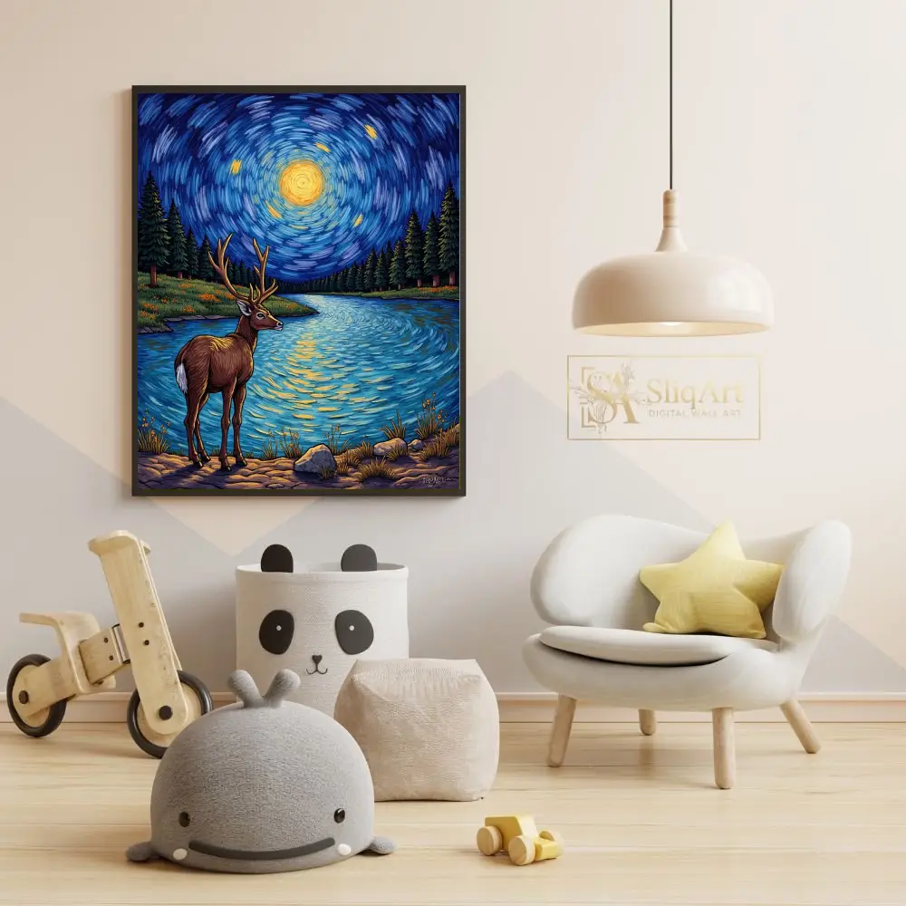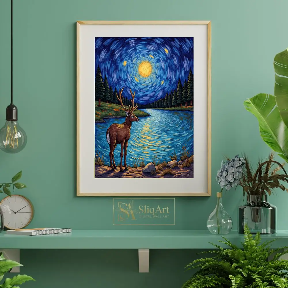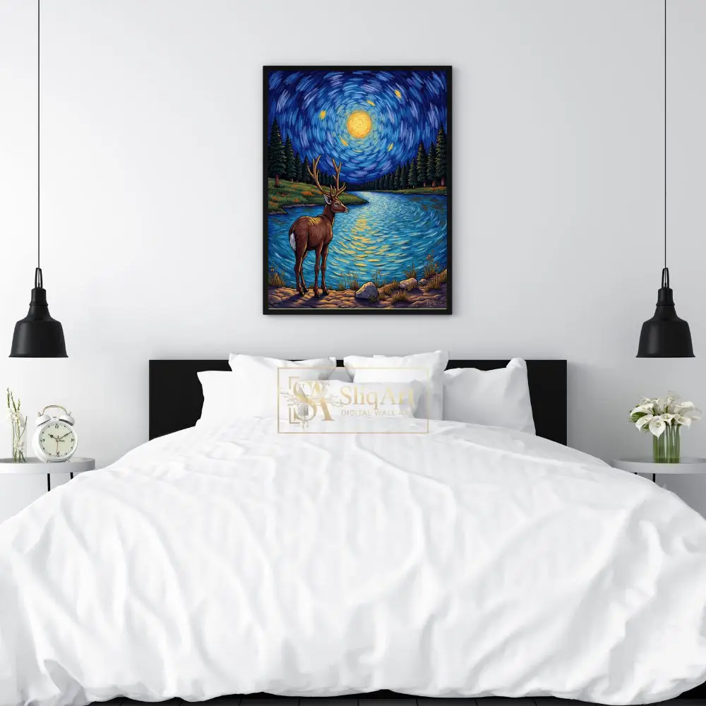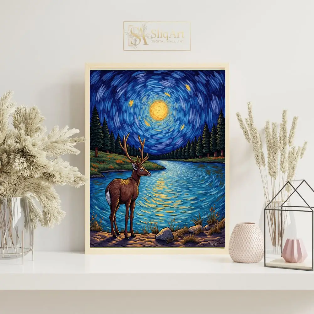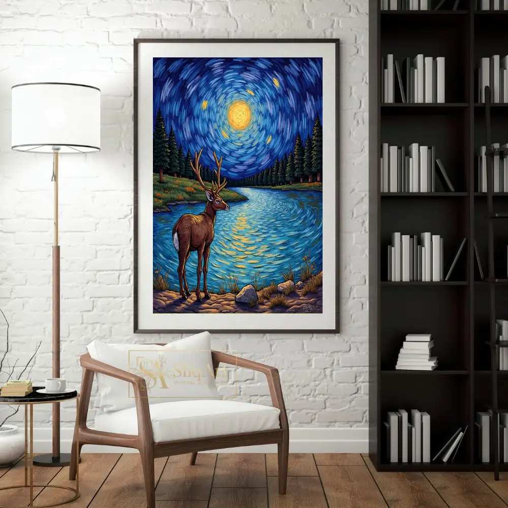 This captivating art piece merges the majesty of wildlife with the iconic aesthetic of post-impressionism. A magnificent stag stands at the edge of a serene lake, silhouetted against a mesmerizing, swirling night sky.