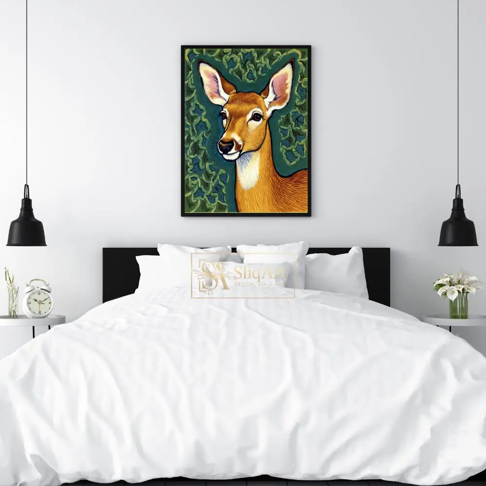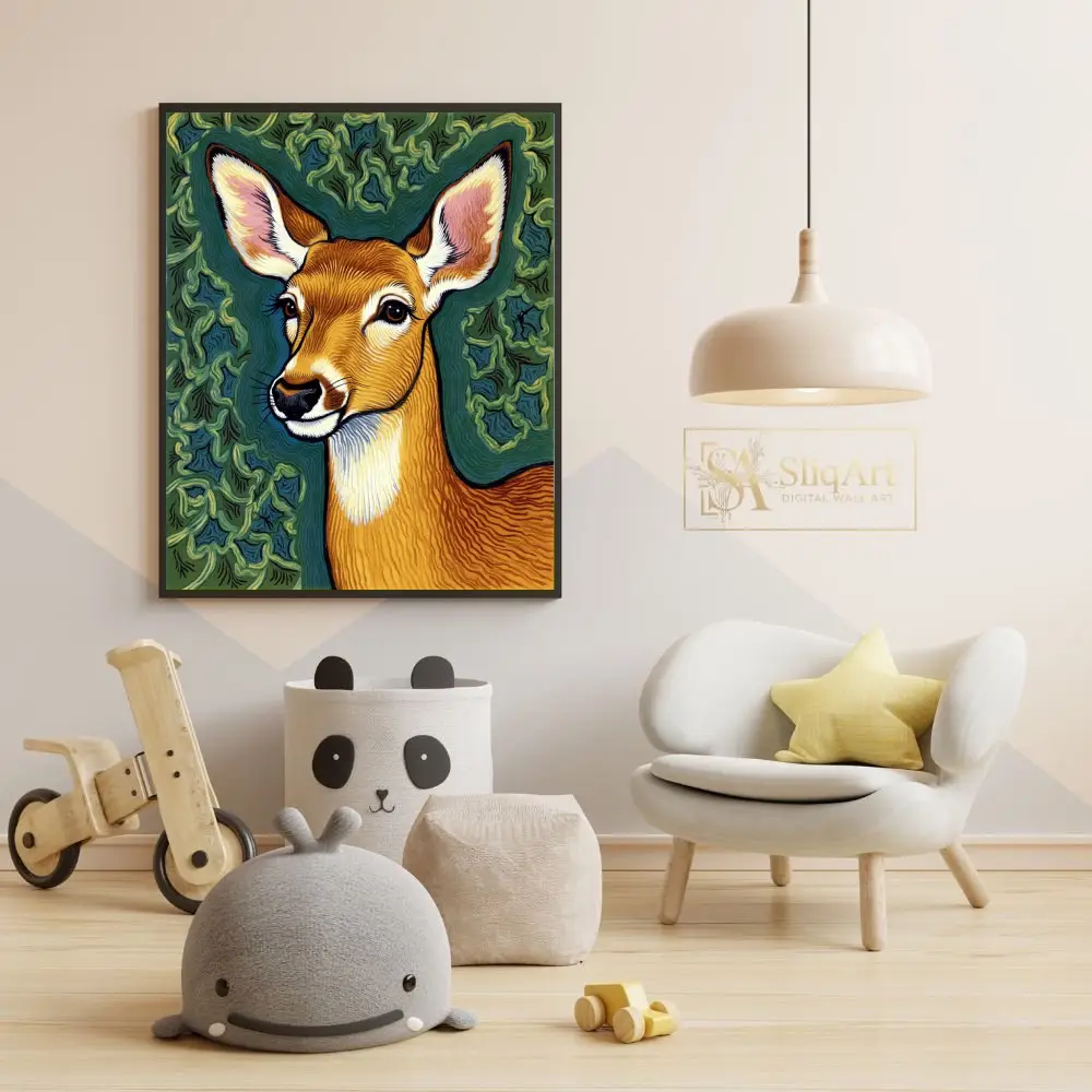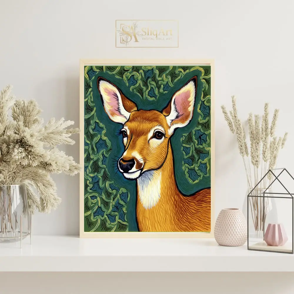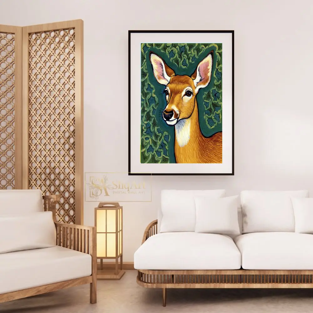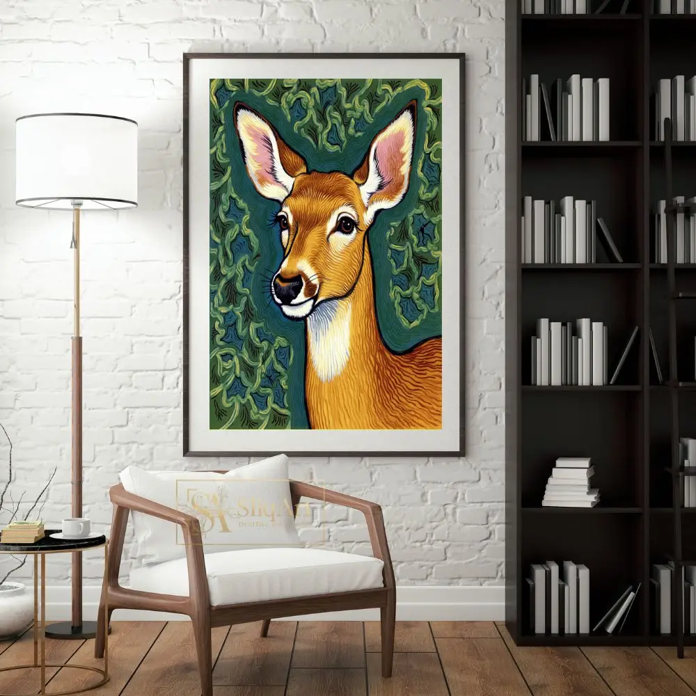 Bring the serene beauty of the wilderness into your home with this striking deer portrait. Rendered in a unique illustrative style reminiscent of traditional linocut or woodblock prints, this piece features intricate wavy patterns that give the deer’s coat and the leafy background a sense of rhythmic movement.