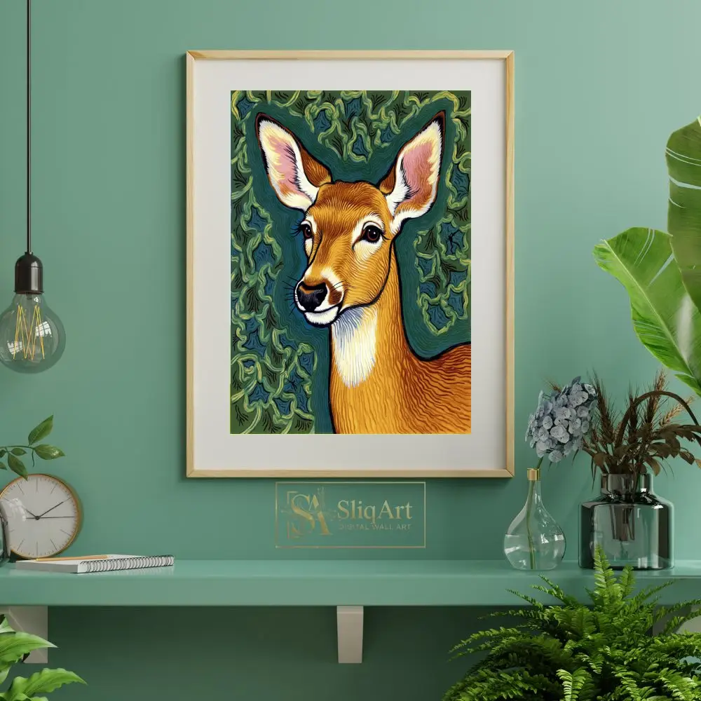 The warm ochre and golden-brown tones of the doe are beautifully contrasted against a deep forest green and teal backdrop, while the soft pink accents in the ears add a touch of gentle charm. Perfect for nature enthusiasts, this art piece combines modern graphic elements with a rustic folk art soul.