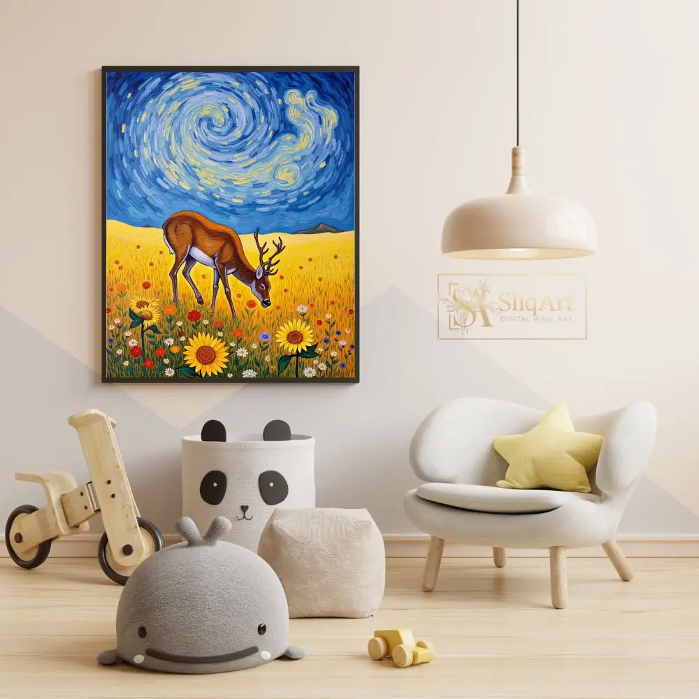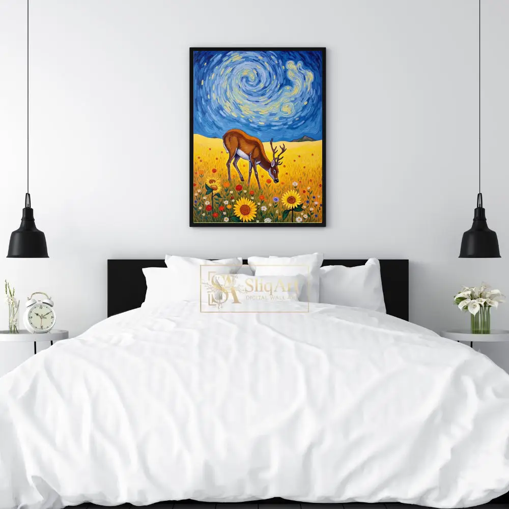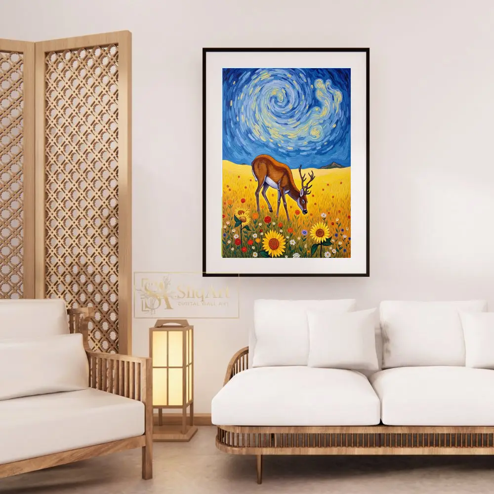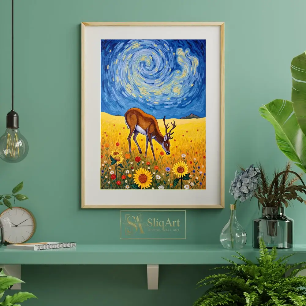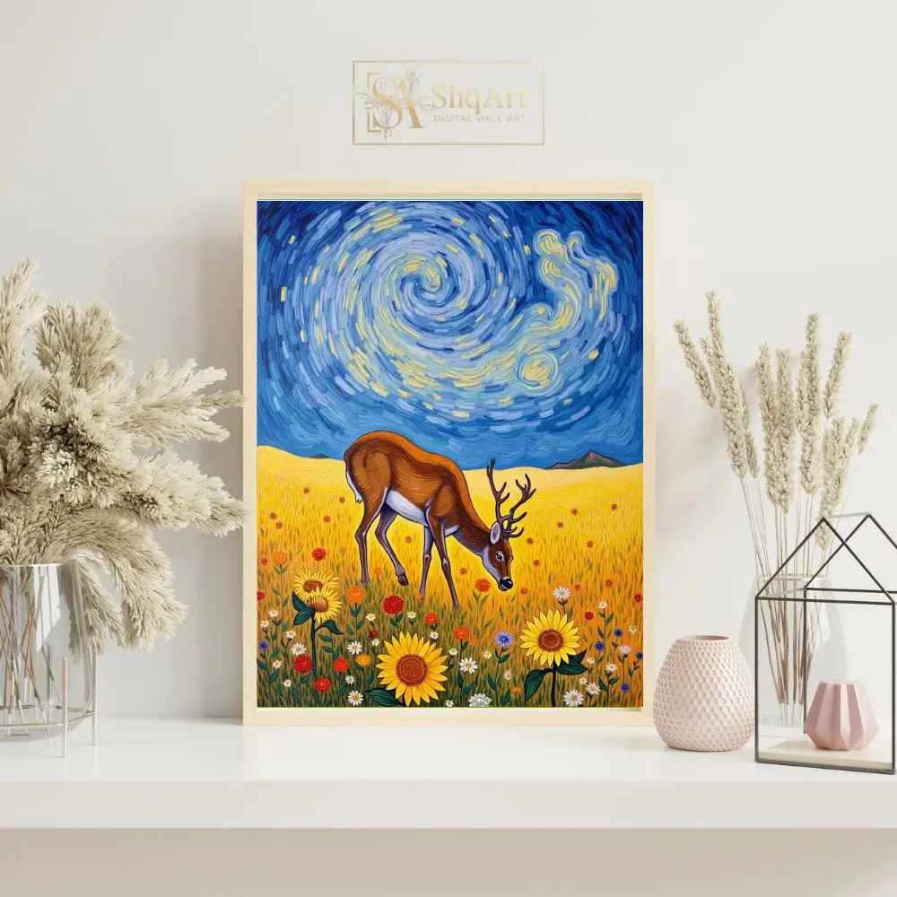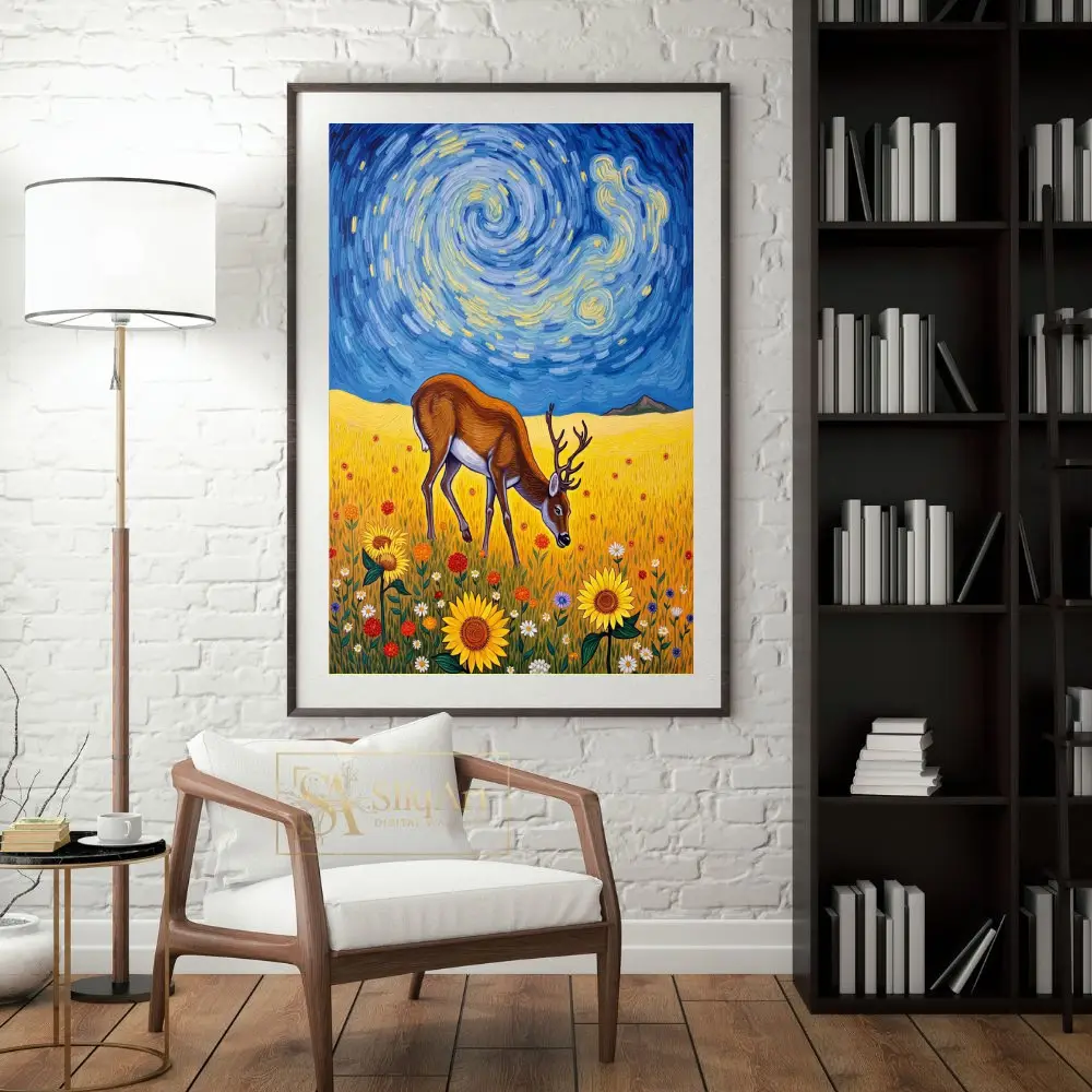 Transform your living space with this captivating fusion of wildlife and classic art history. This stunning piece features a majestic deer grazing peacefully in a sun-drenched field of sunflowers, set against a dramatic, swirling sky reminiscent of Vincent van Gogh’s ‘The Starry Night’.