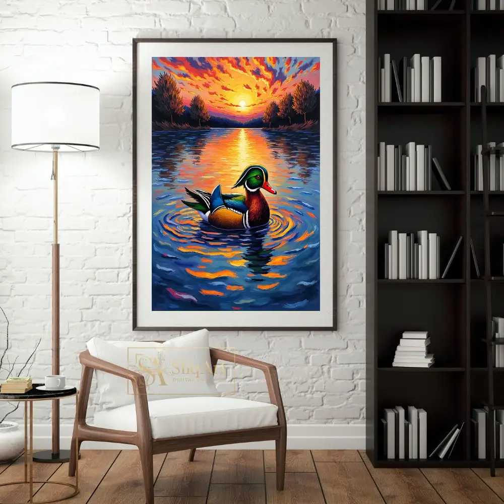 The wood duck itself is a masterpiece of color, with its characteristic emerald head and intricate feather patterns rendered in bold, textured brushstrokes. This impressionistic style adds a sense of movement and life to the scene, making it a captivating addition to any room that needs a touch of nature’s majesty and a burst of warm, energetic color.