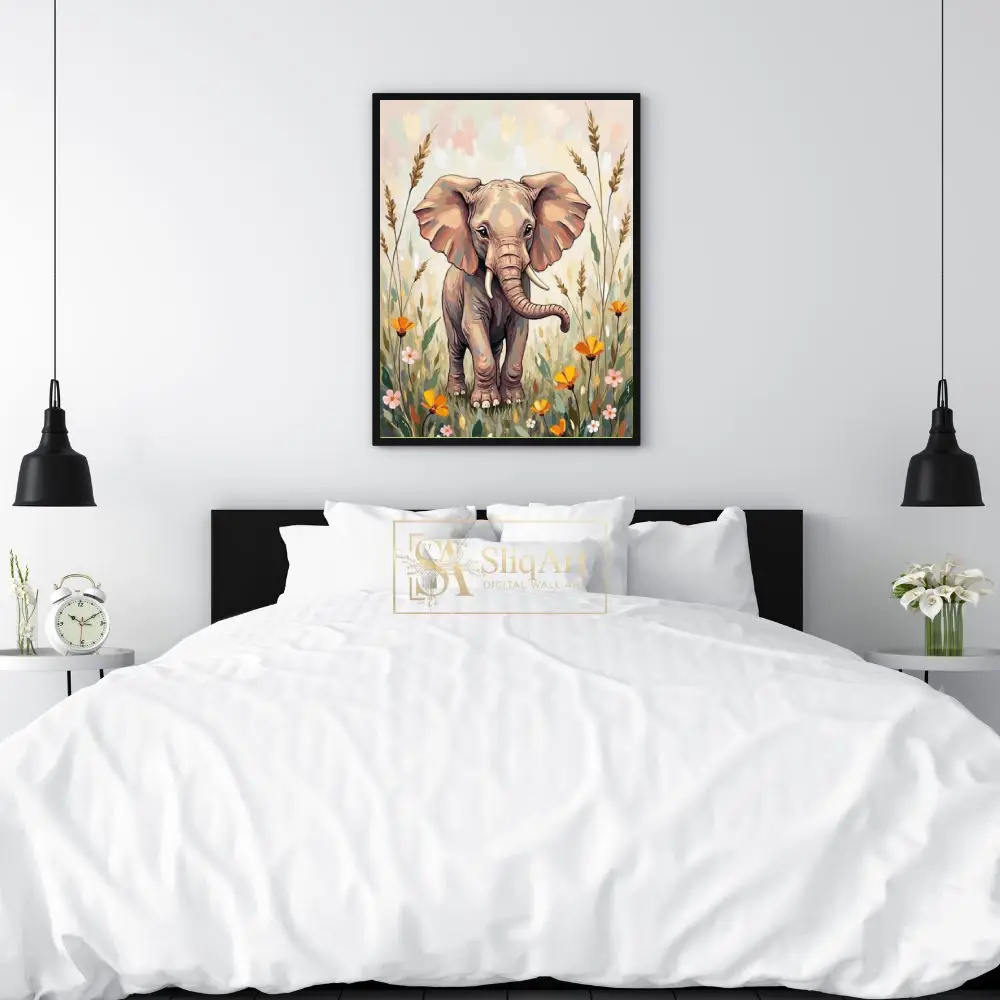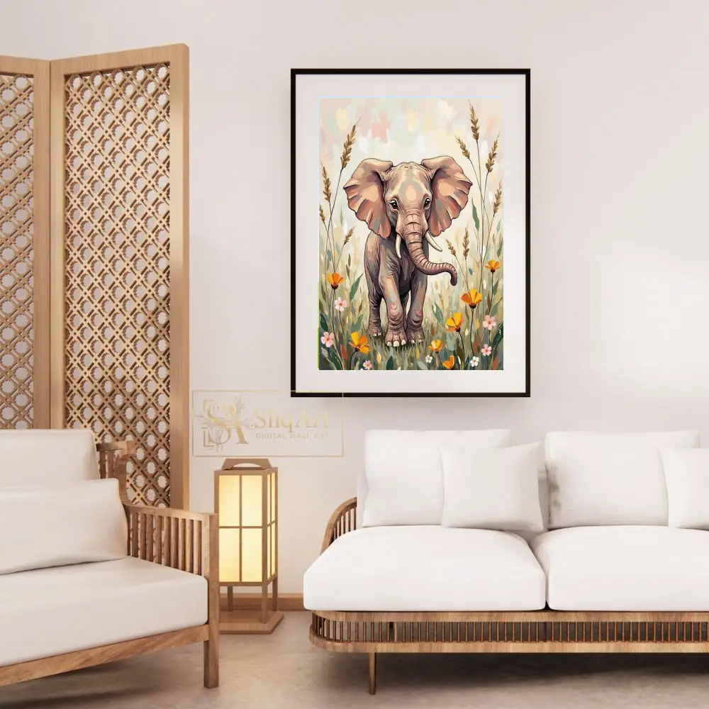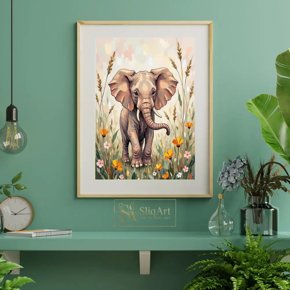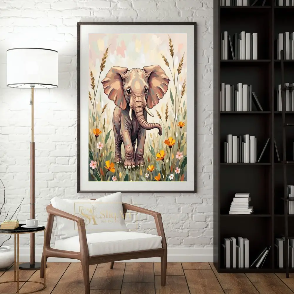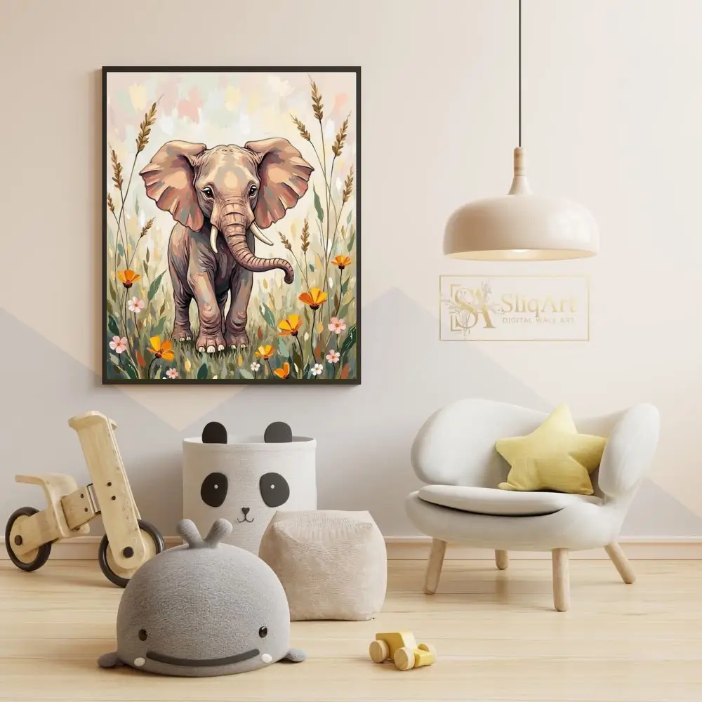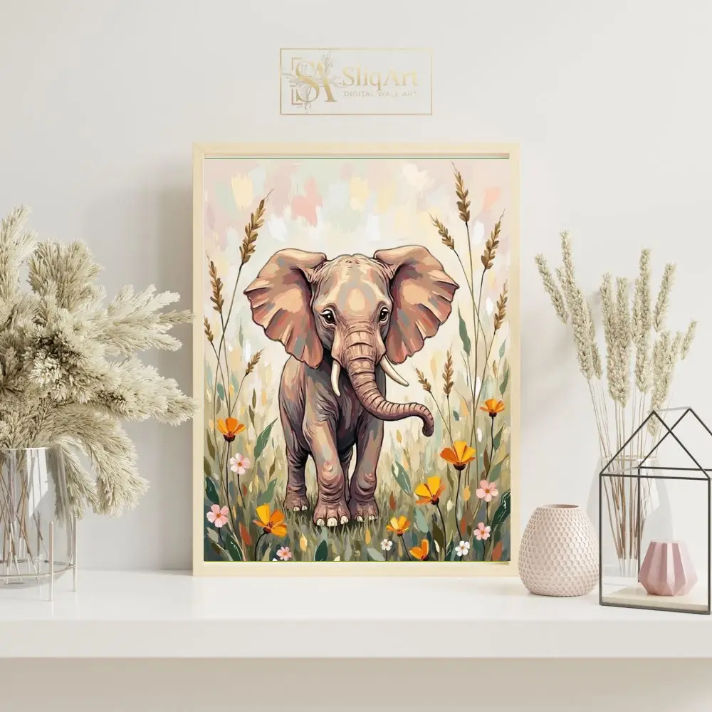 A gentle color palette of beige, dusty rose, peach, and muted greens lends a soothing and nurturing quality to the scene. The elephant’s expressive eyes and endearing posture make it a captivating focal point that evokes feelings of peace, innocence, and the beauty of the natural world.