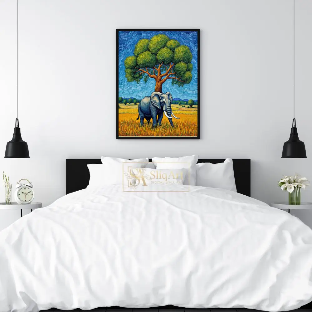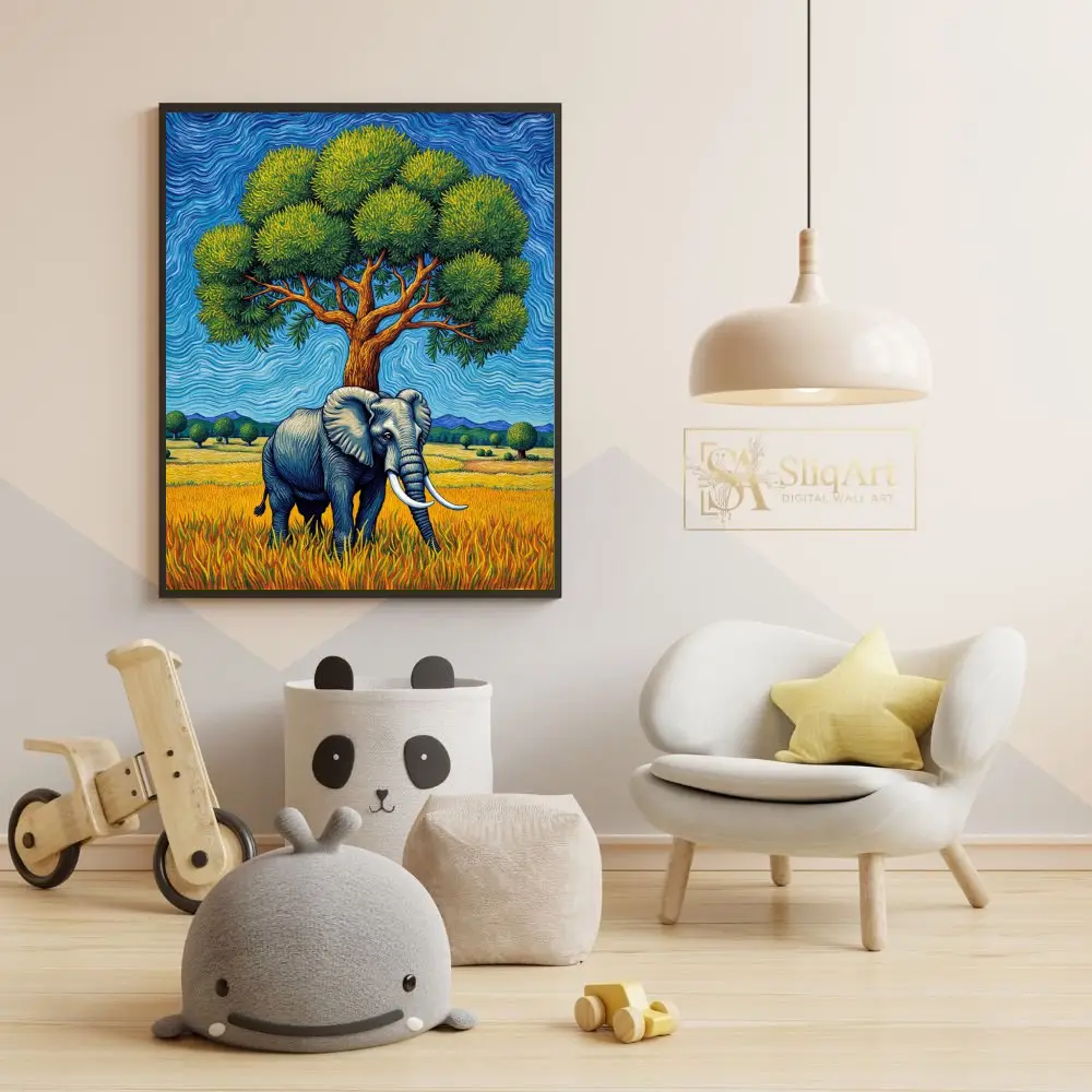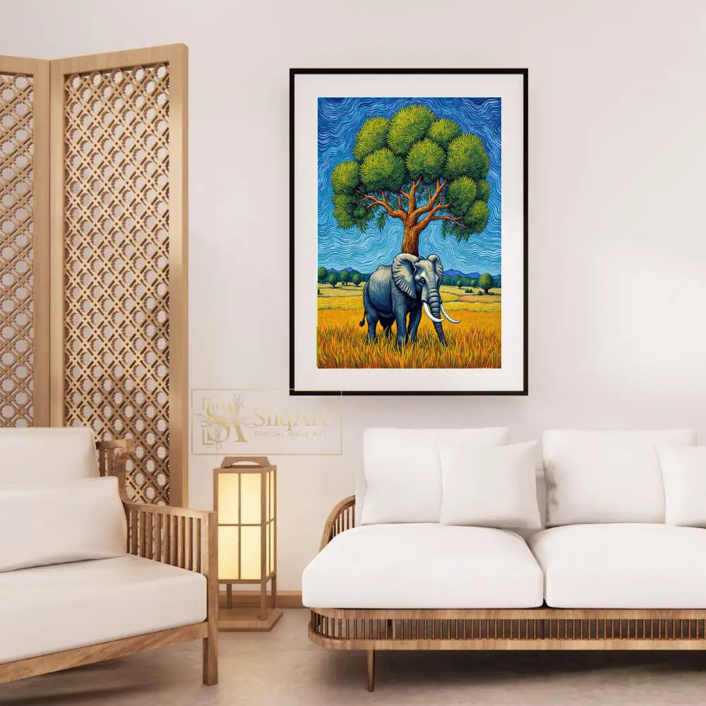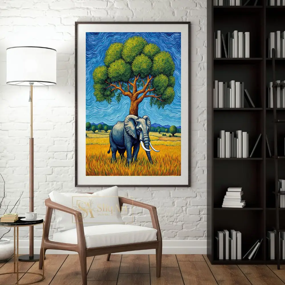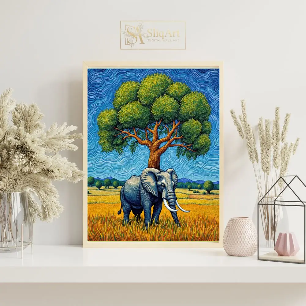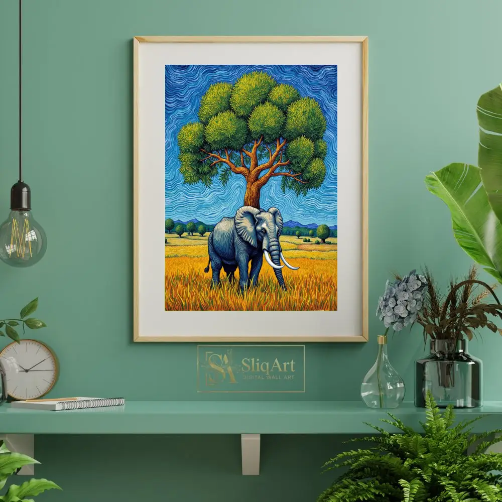 Experience the raw power and serene beauty of the African wild with this stunning impasto-style painting. Featuring a magnificent elephant standing under a lush, vibrant green tree, the piece is defined by its rhythmic, swirling brushstrokes that echo the energy of the natural world.