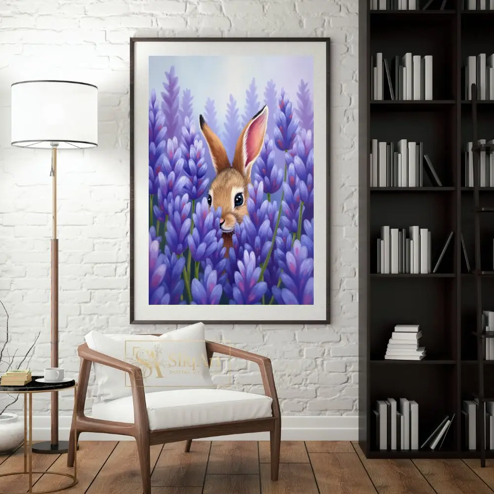 Featuring a charming brown bunny peeking through a dense thicket of lavender blooms, this piece uses a soothing palette of purples and warm browns to create a serene environment. The whimsical style and detailed rendering of the animal’s curious eyes and soft fur make it a heart-warming addition to any interior, perfect for those who love animals and botanical beauty.
