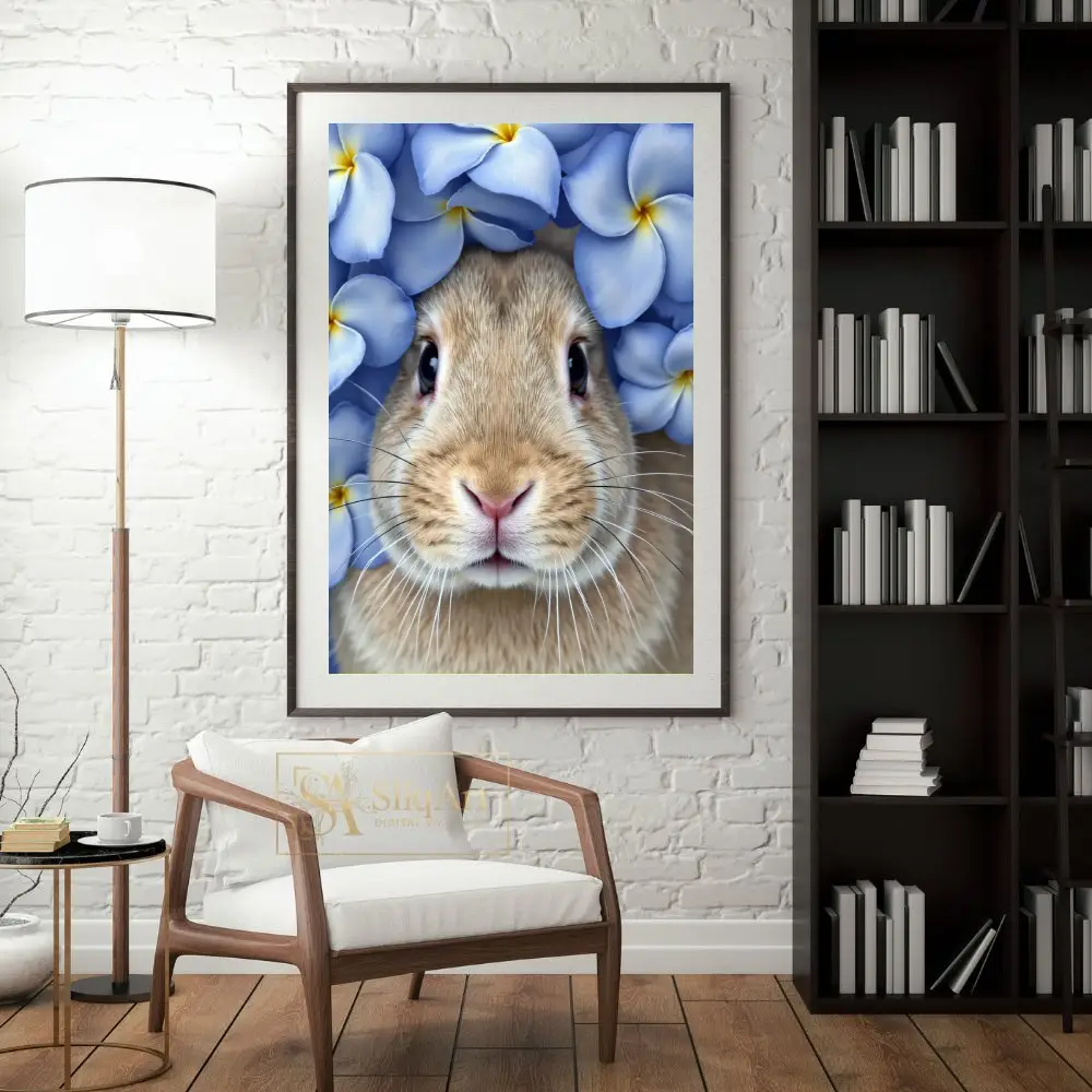 Surrounding the rabbit is a lush frame of soft, sky-blue frangipani flowers with vibrant yellow centers, creating a serene and whimsical atmosphere. The contrast between the warm, earthy tones of the rabbit’s fur and the cool, calming blues of the petals makes this a versatile piece for modern interiors. This artwork combines the innocence of wildlife with the elegance of botanical design, perfect for creating a peaceful focal point in any room.