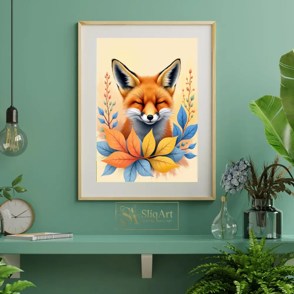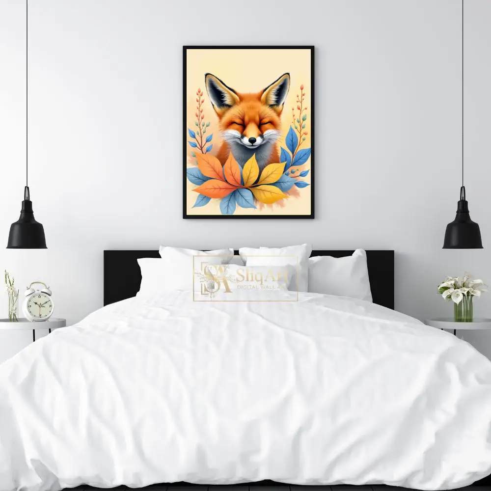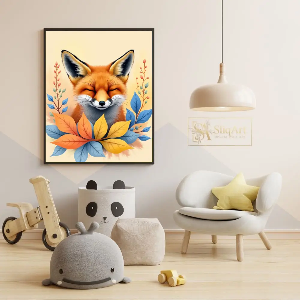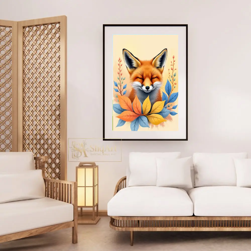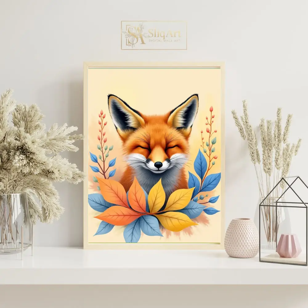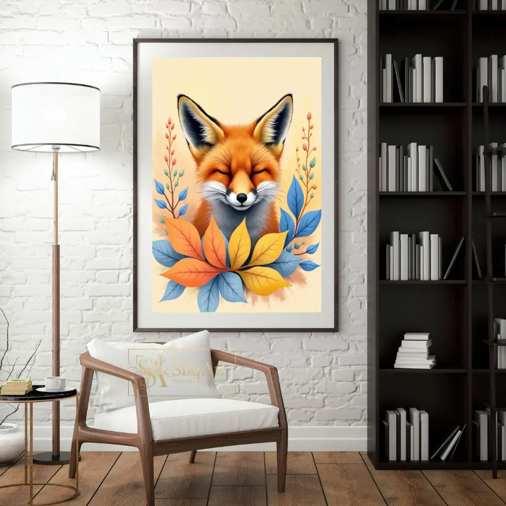 This enchanting piece features a beautifully rendered red fox, eyes closed in a moment of pure serenity. Surrounded by a bouquet of stylized autumn leaves in contrasting hues of vibrant orange, sunny yellow, and cool slate blue, the fox emanates a peaceful energy.