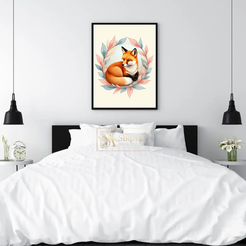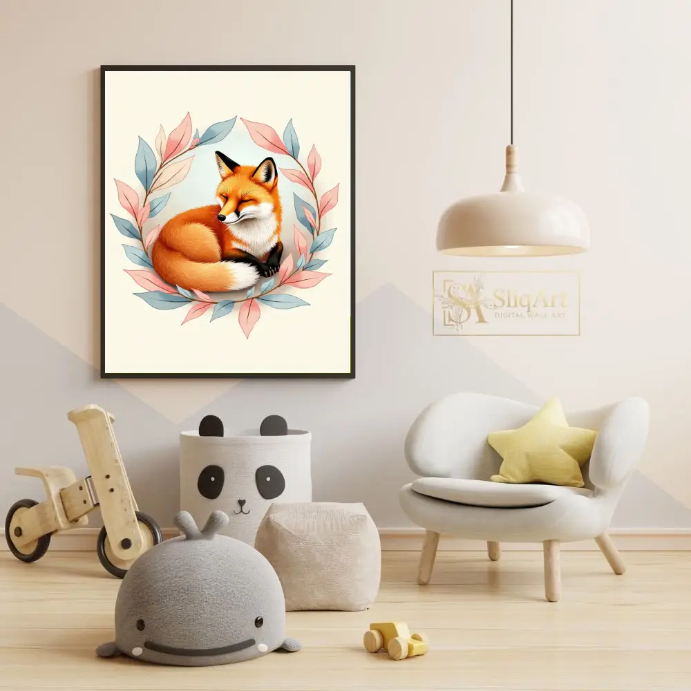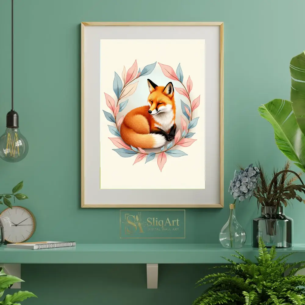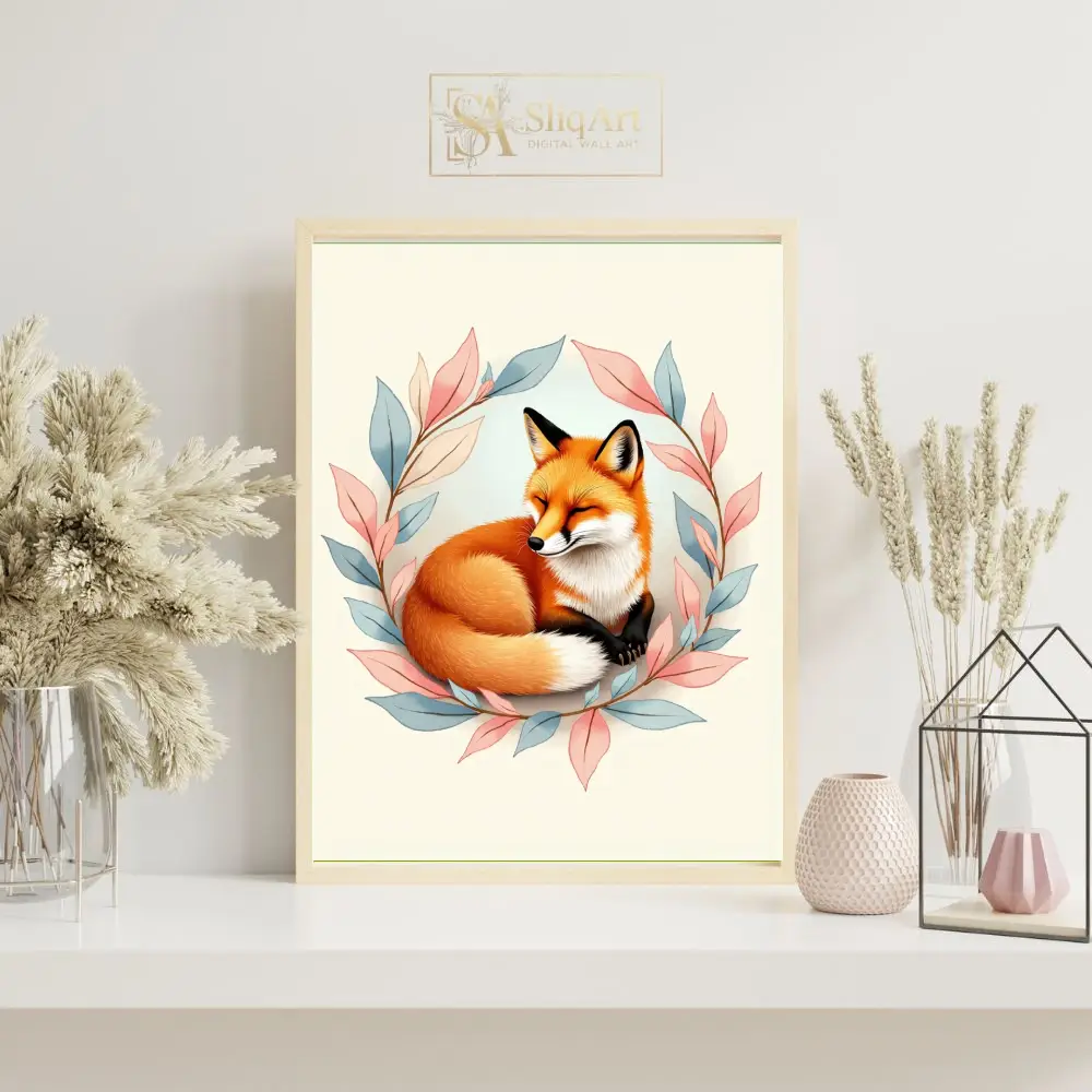 This enchanting illustration features a peaceful red fox curled up in a deep slumber, encircled by a delicate wreath of pastel pink and blue leaves.