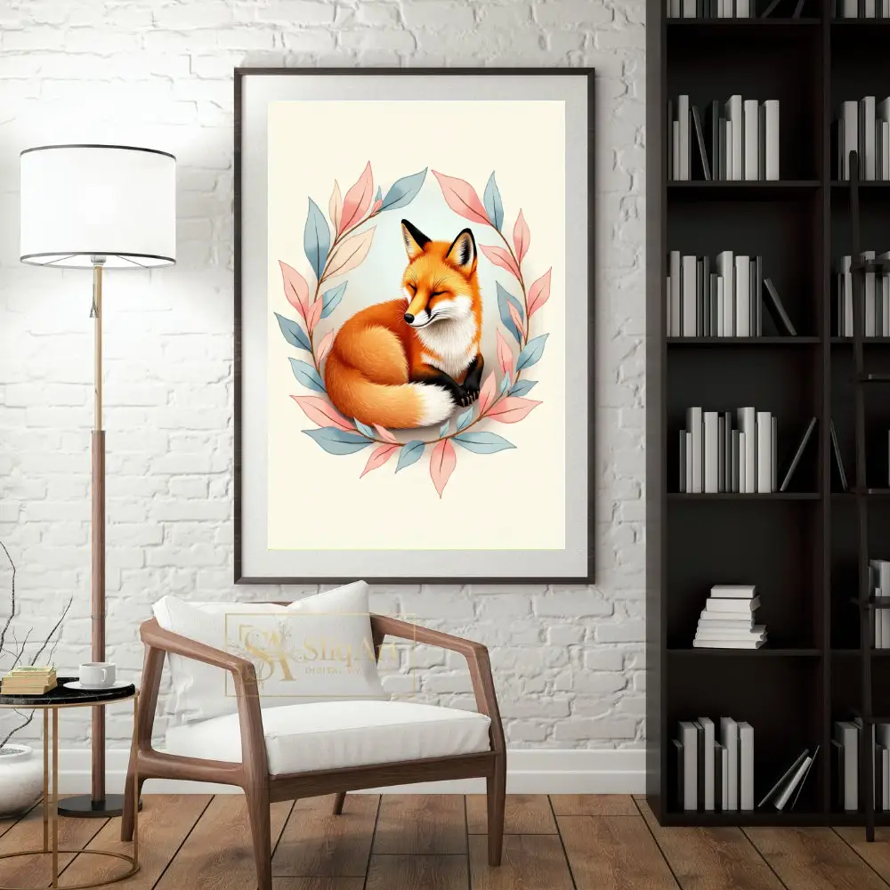 The soft textures and gentle expression of the fox evoke a sense of tranquility and natural beauty. Perfect for adding a touch of whimsical charm to your decor, this piece blends modern digital illustration with a classic woodland aesthetic, creating a cozy and inviting atmosphere in any room.