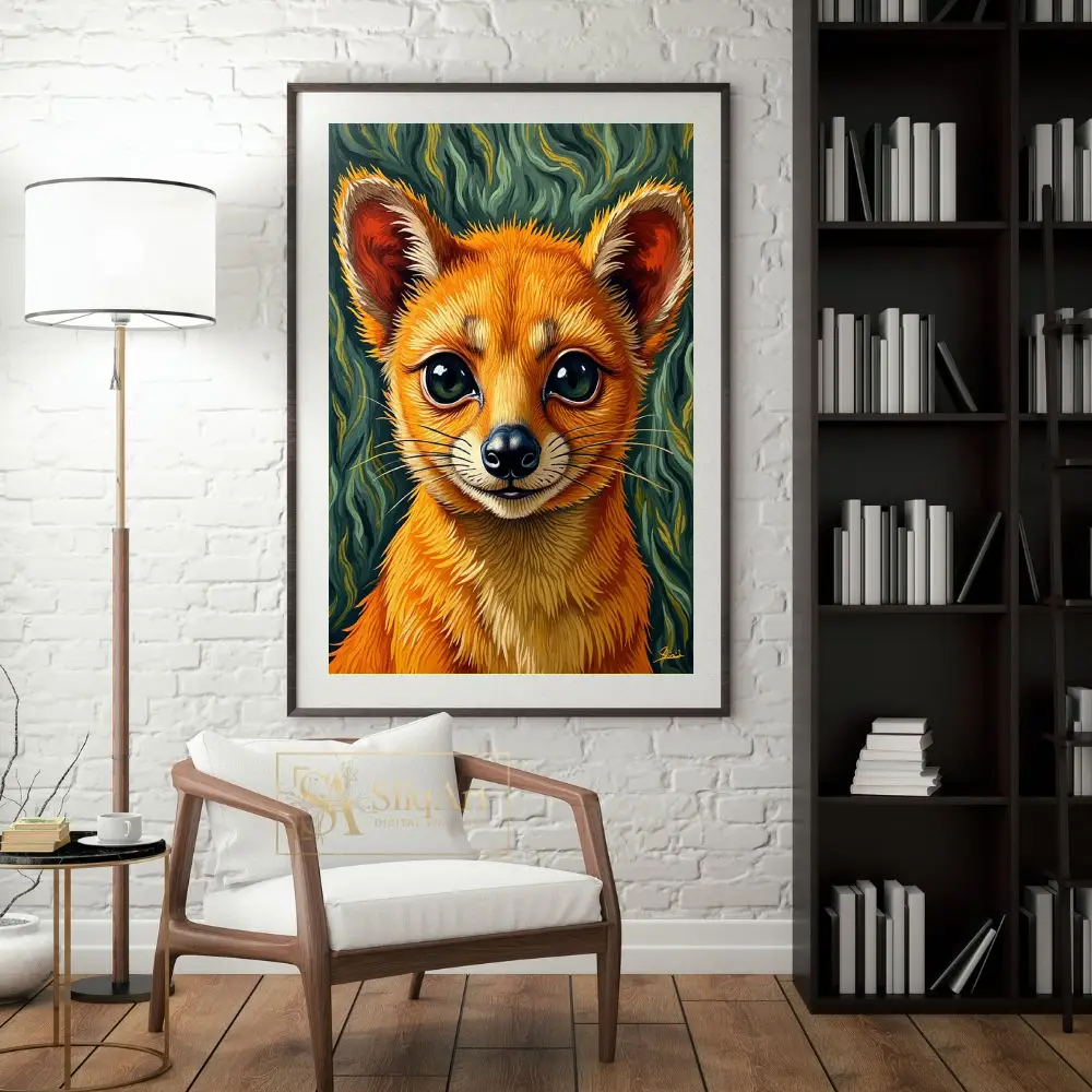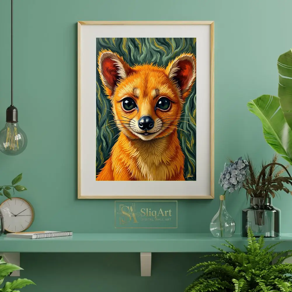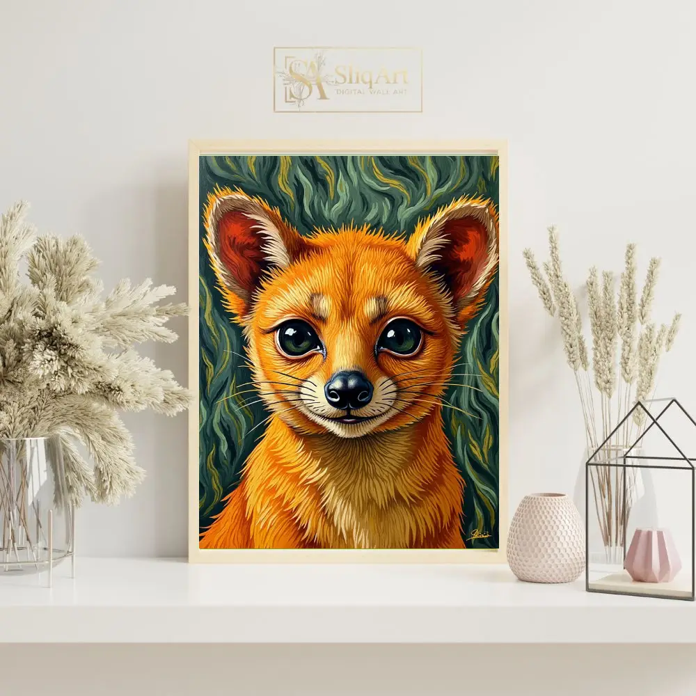 The intricate brushwork brings the fox’s fur to life with a tactile quality, while the swirling, impressionistic background in shades of forest green and teal creates a sense of magical energy and movement. This artwork captures a moment of pure curiosity and charm, making it a perfect addition to any modern interior seeking a touch of whimsy and nature-inspired beauty.