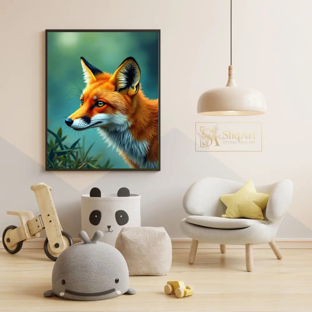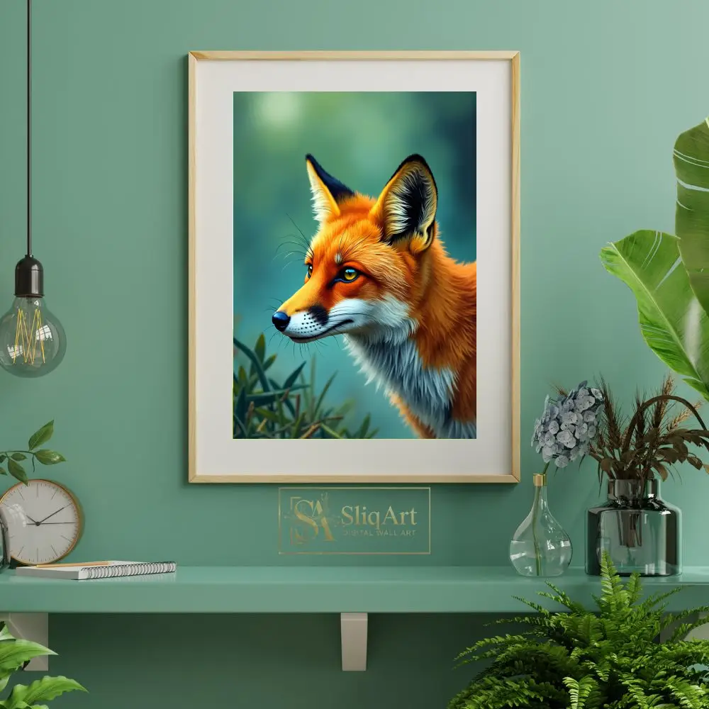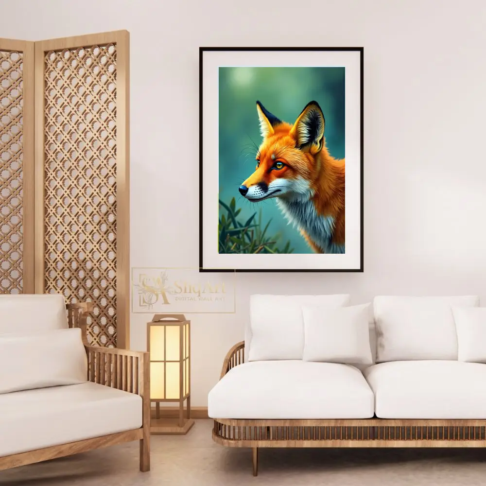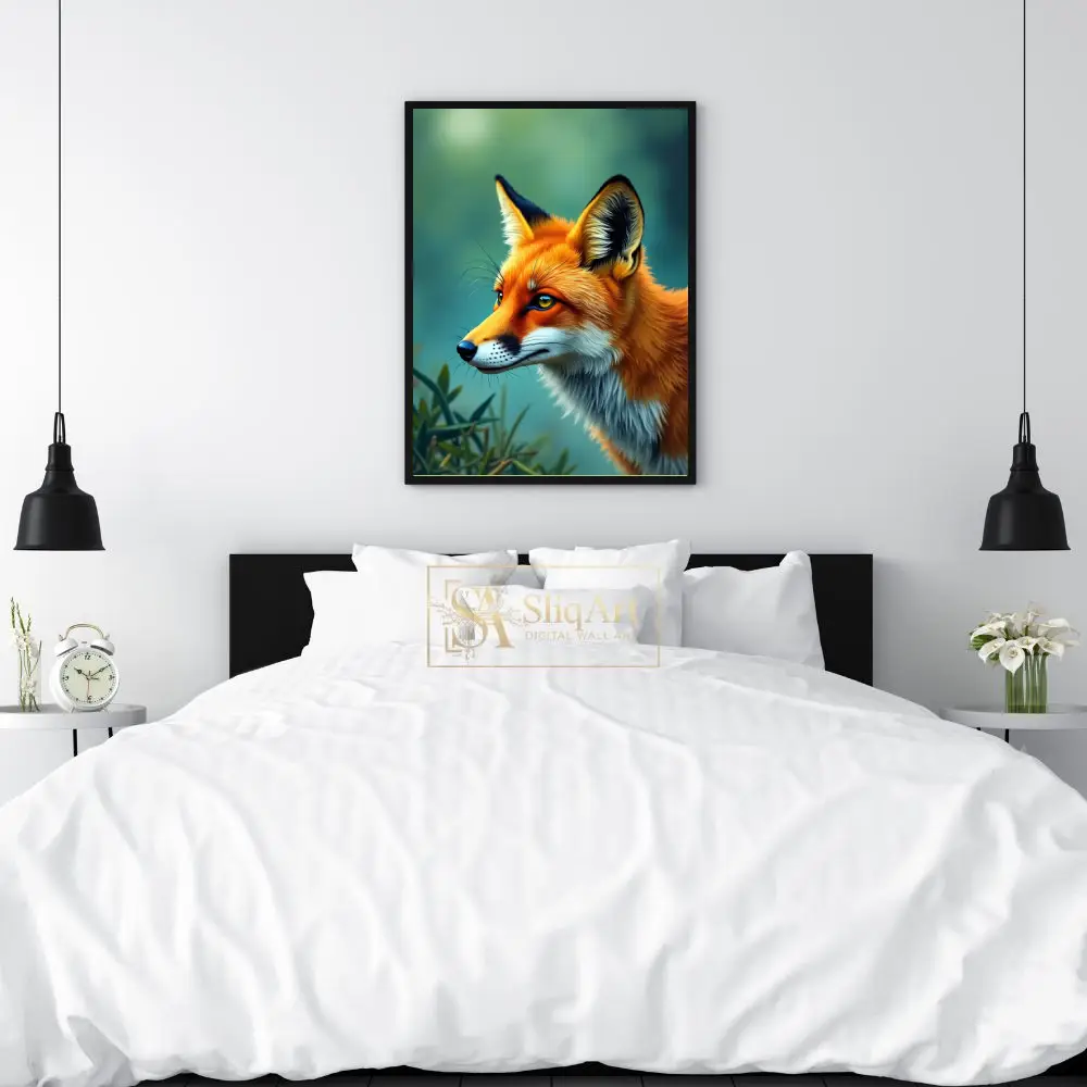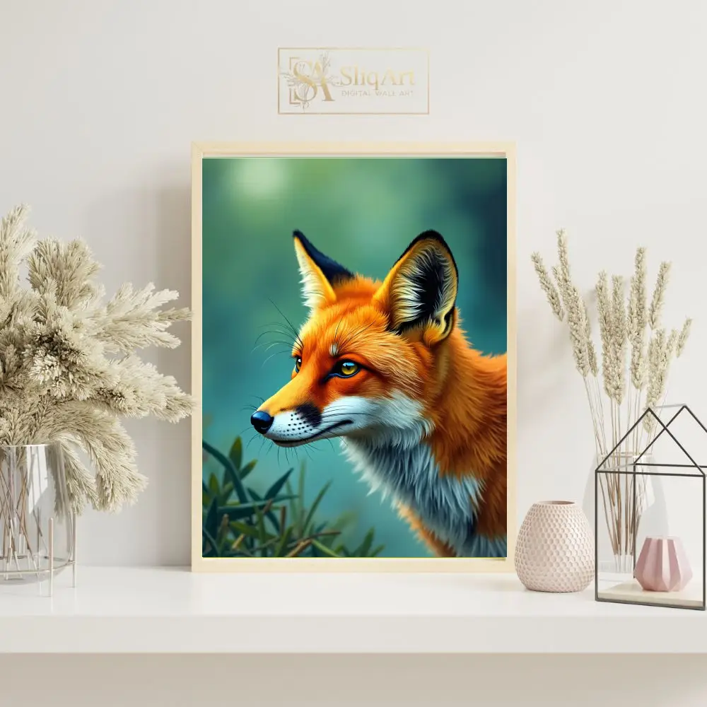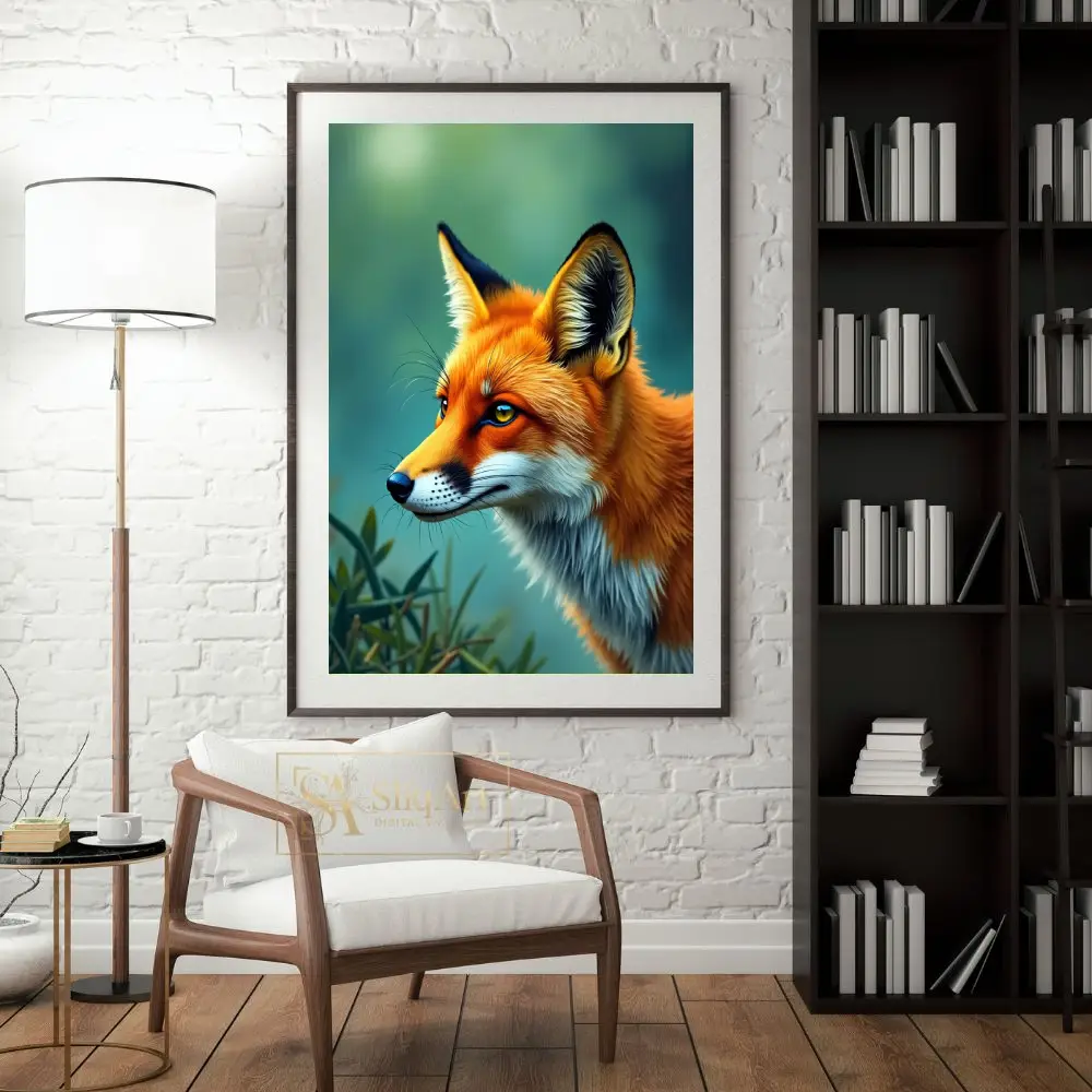 Experience the untamed beauty of nature with this stunning digital portrait of a red fox. Meticulously detailed, the artwork captures every strand of fiery orange fur and the intelligent glimmer in the fox’s amber eyes.