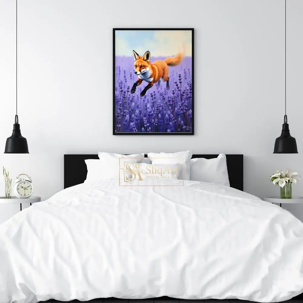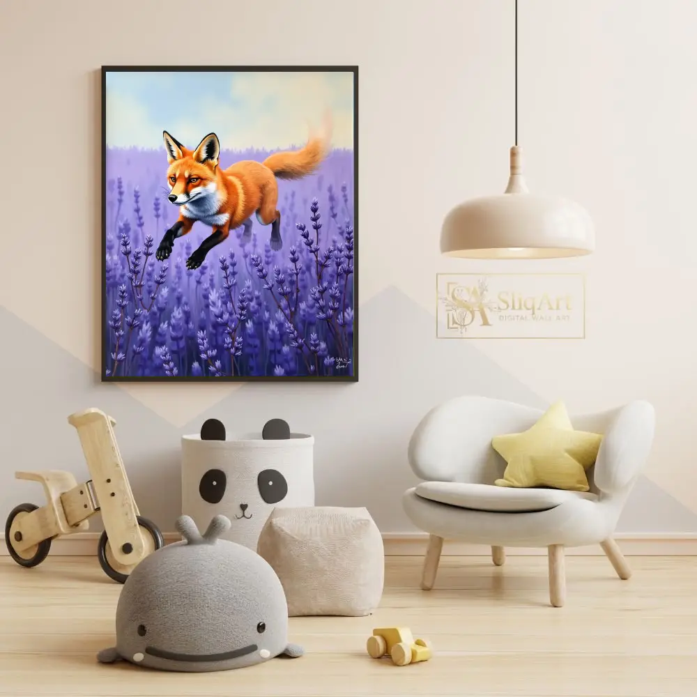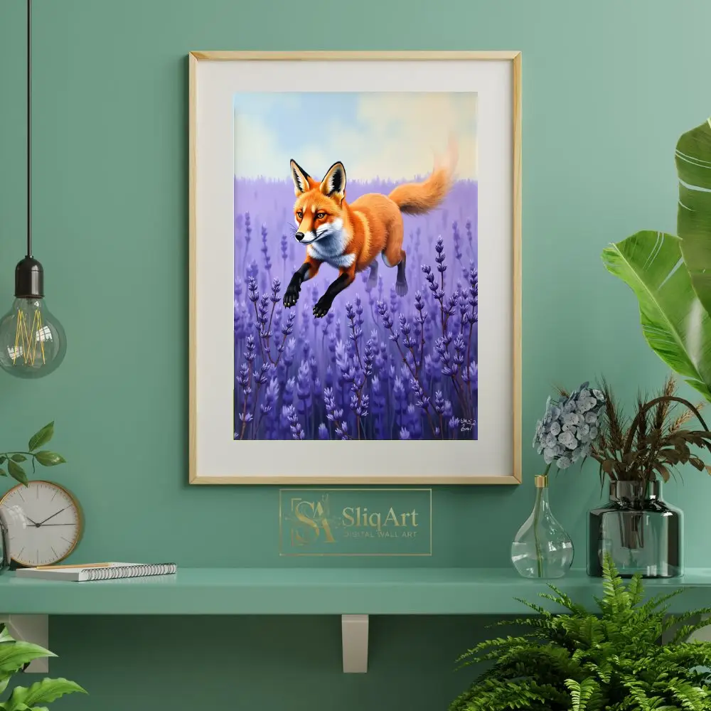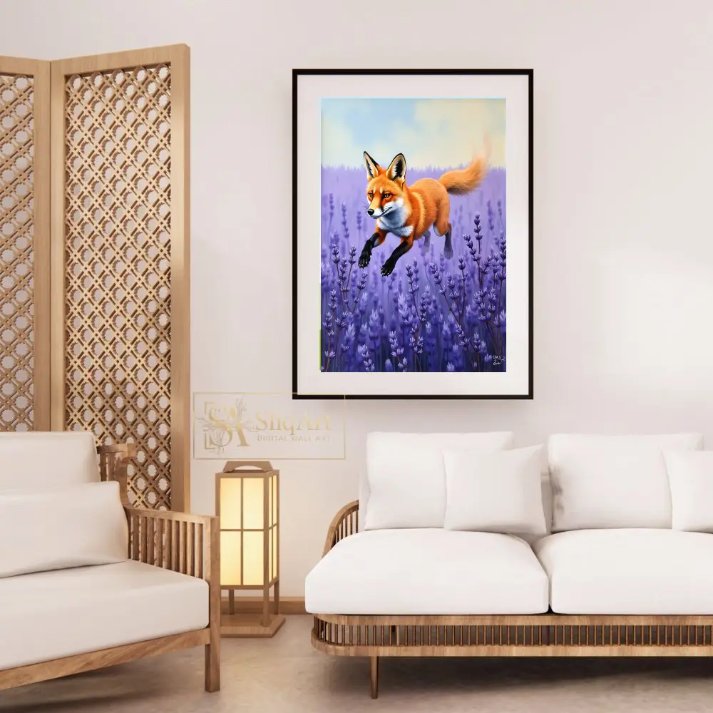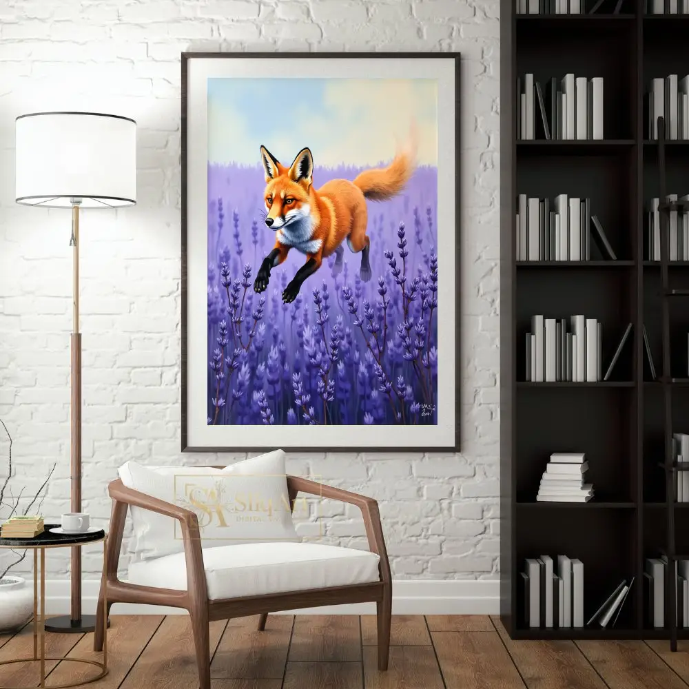 This captivating piece of art features a vibrant red fox captured in a moment of pure grace as it leaps through a dense field of blooming lavender. The striking contrast between the fox’s rich orange fur and the deep purple hues of the flowers creates a visually stunning focal point.
