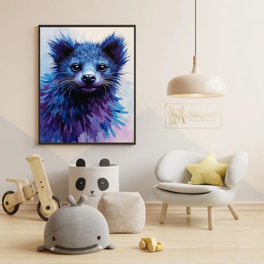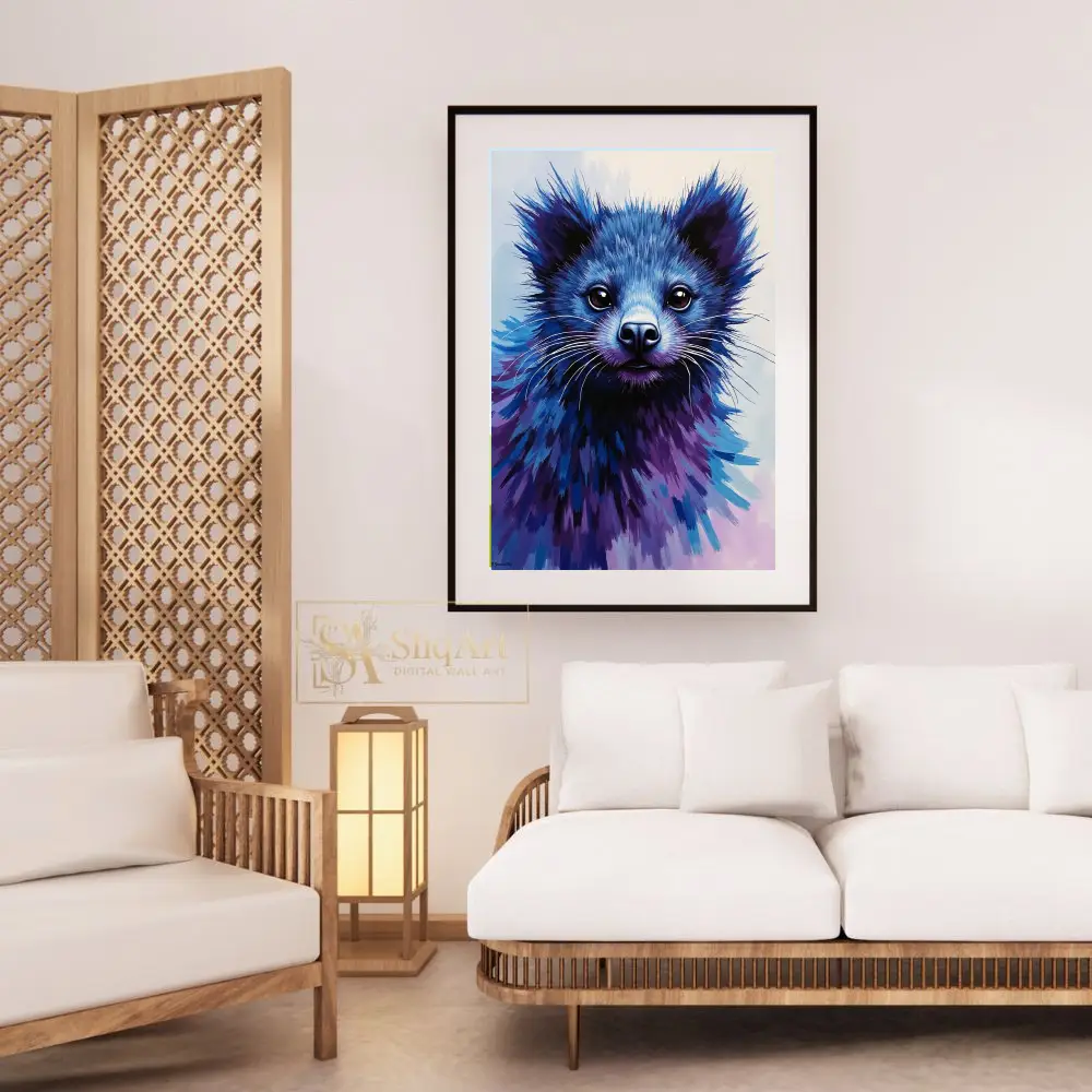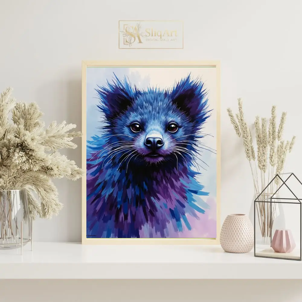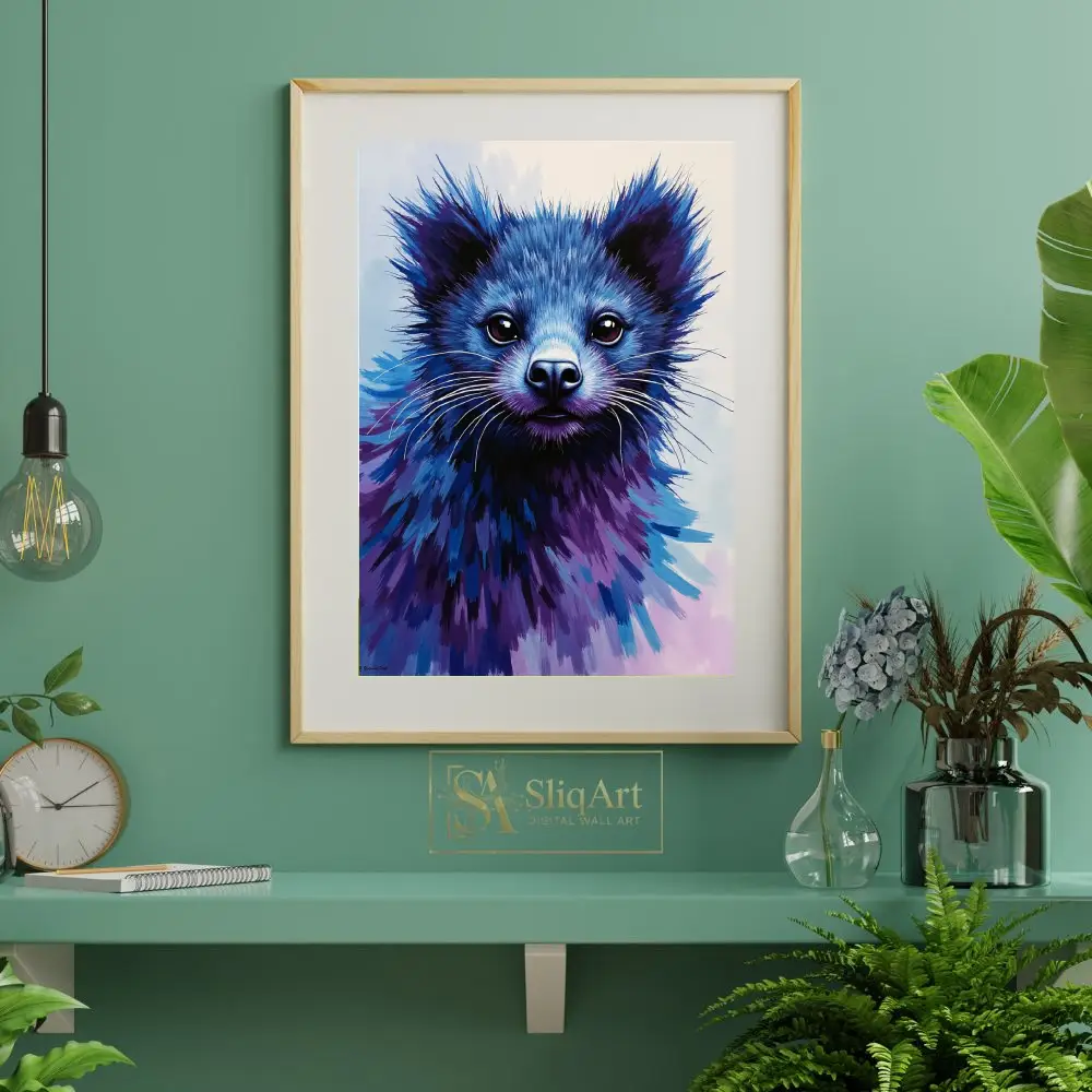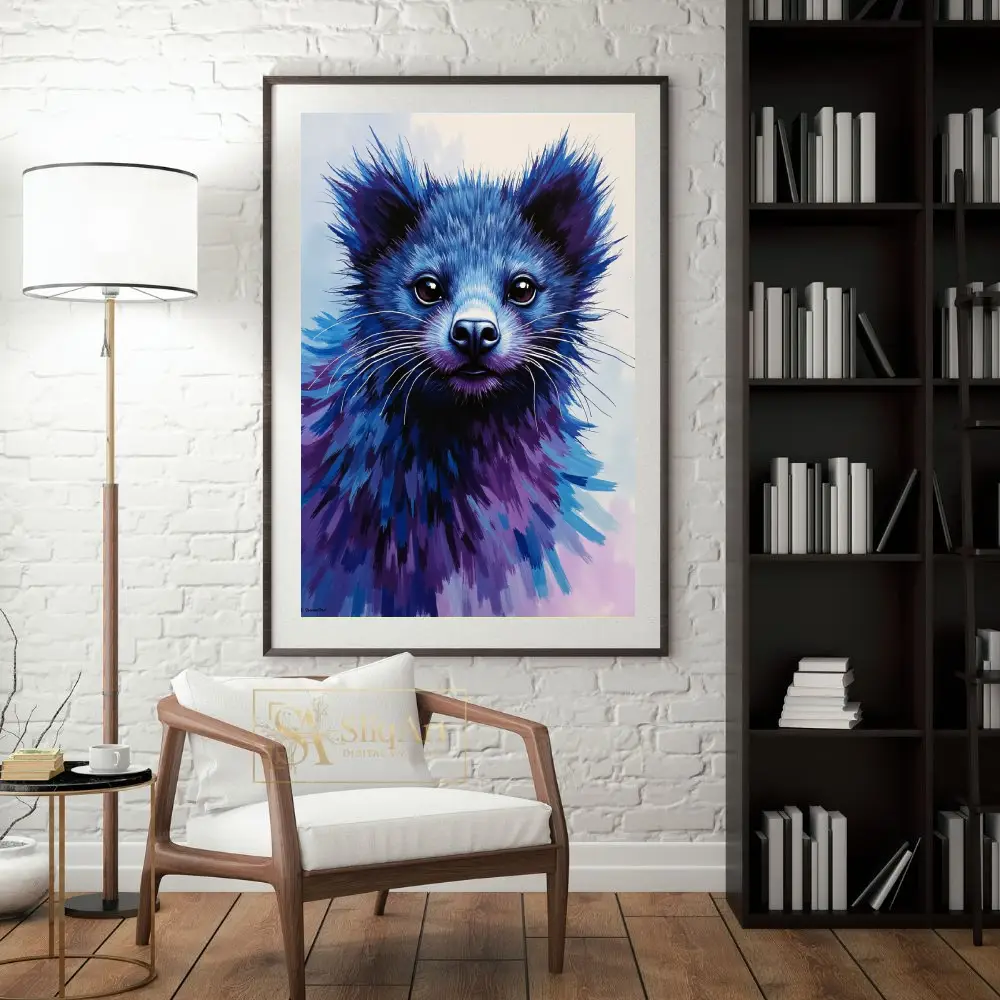 This captivating digital artwork features a stylized, furry creature rendered in a rich palette of electric blues and deep purples. The piece uses sharp, spiky brushstrokes to create a sense of texture and energy, while the large, expressive eyes draw the viewer in.