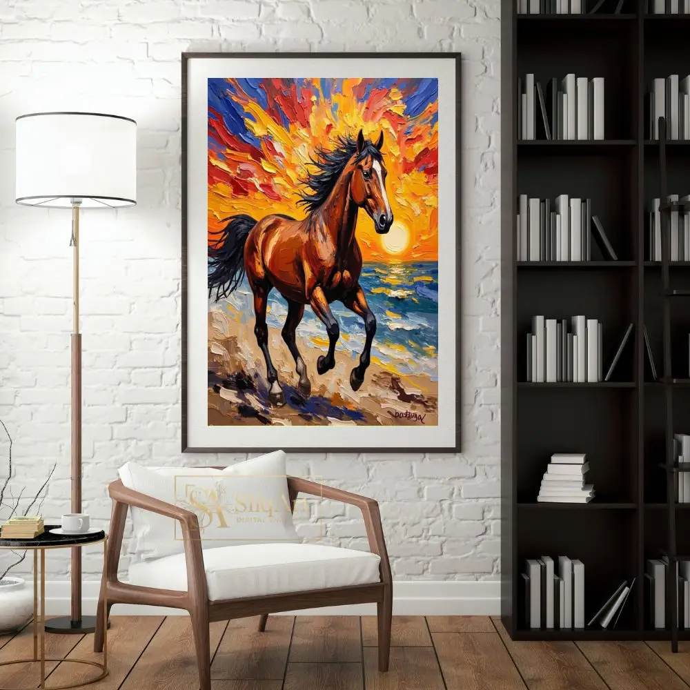 Capture the raw power and untamed spirit of nature with this stunning impasto oil painting featuring a majestic brown horse galloping across a sun-drenched beach. The artist utilizes thick, expressive brushstrokes and a rich palette of fiery oranges, deep blues, and earthy browns to create a sense of dynamic movement and tactile texture.