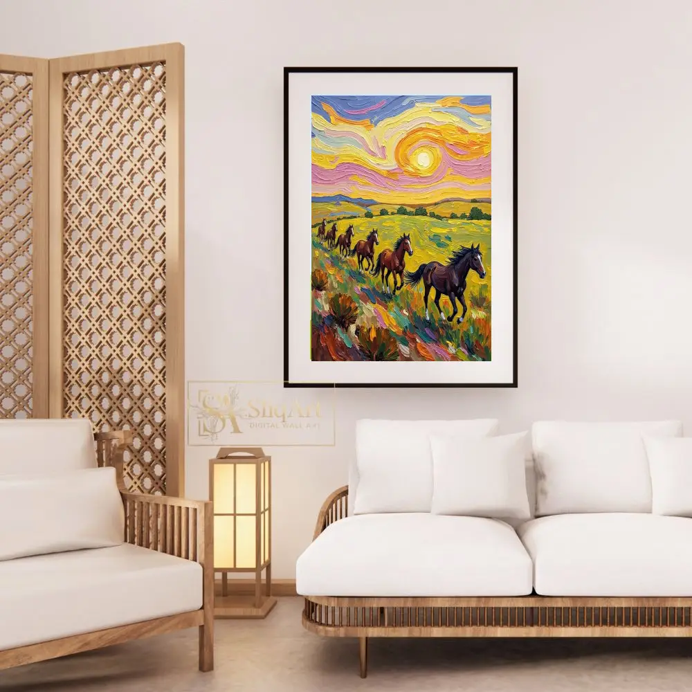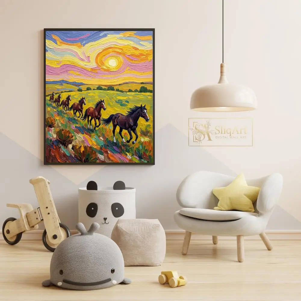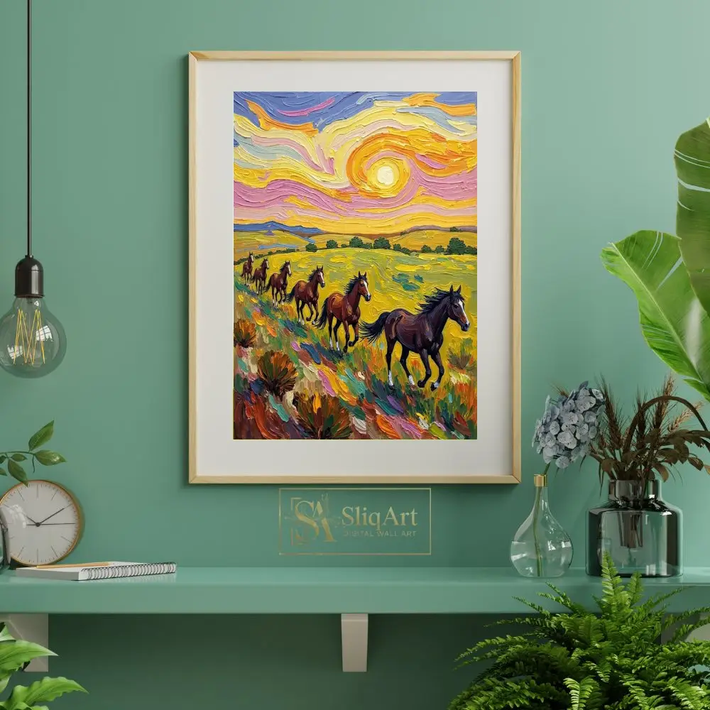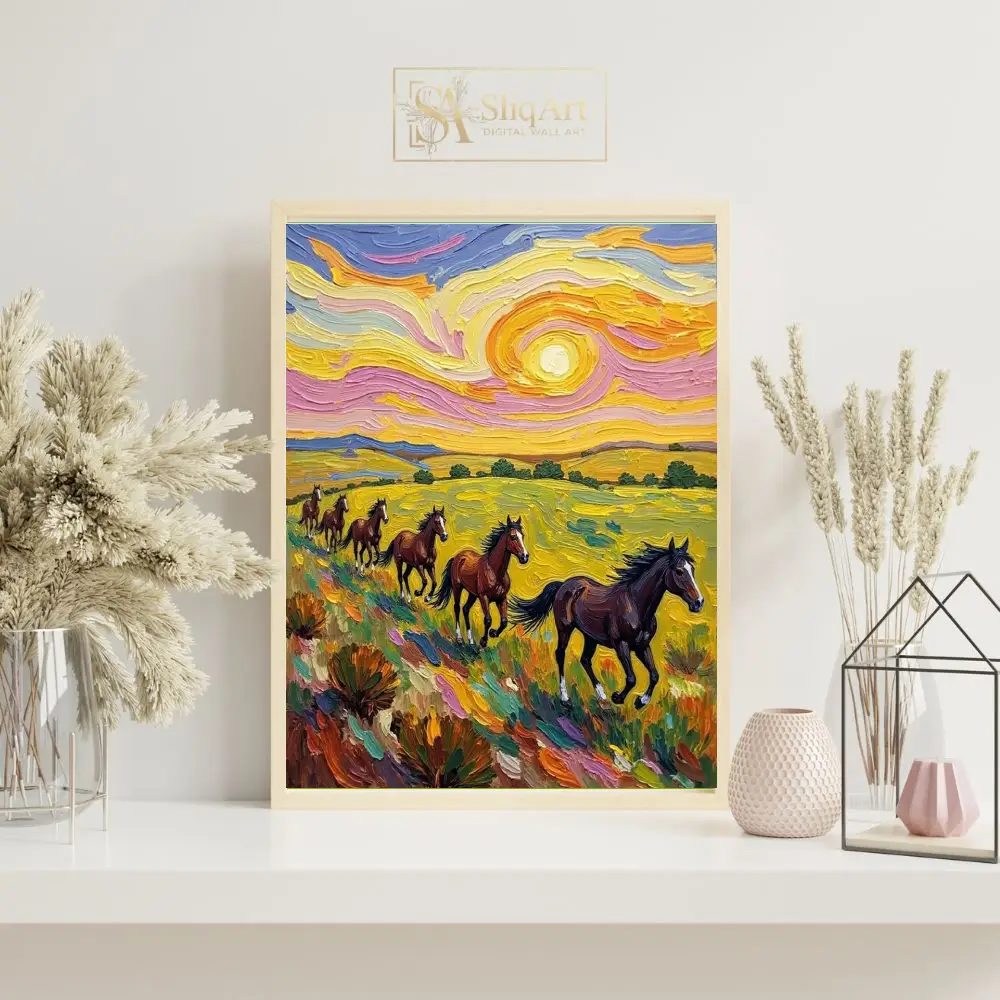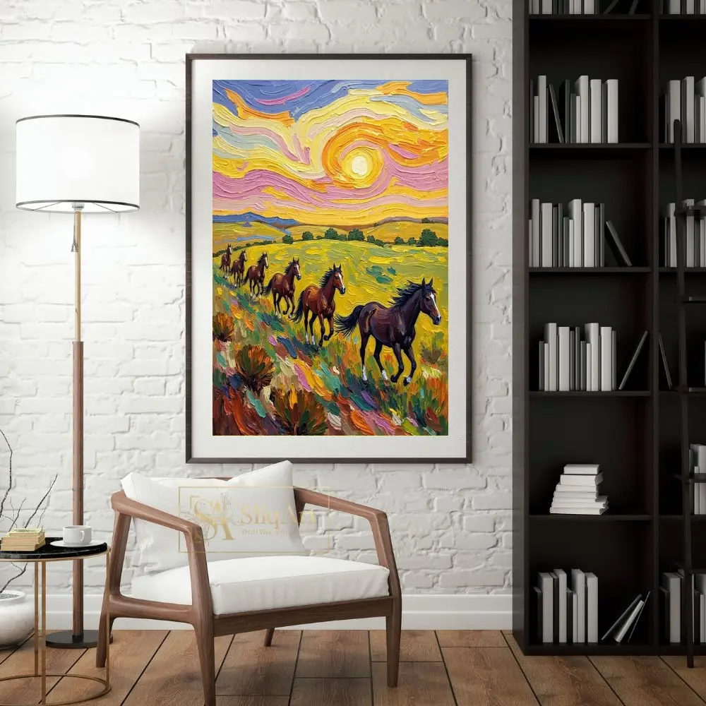 Embrace the dynamic energy of the wild with this captivating impasto-style painting. Featuring a herd of majestic brown horses galloping through a sunlit meadow, this piece is defined by its thick, expressive brushwork and a swirling sky reminiscent of Post-Impressionist masterpieces.