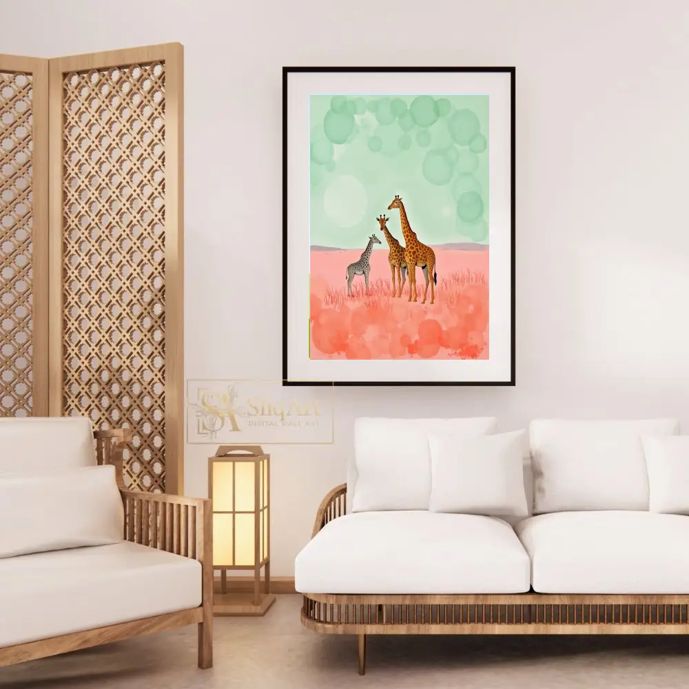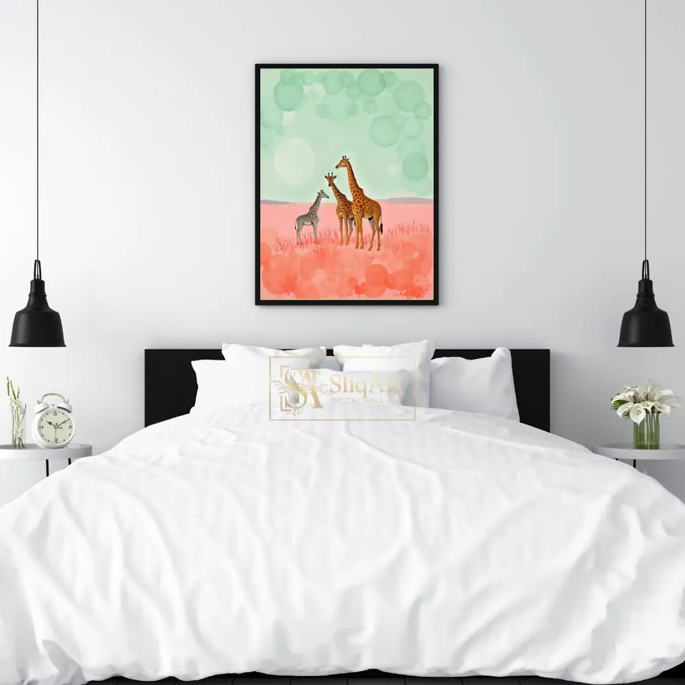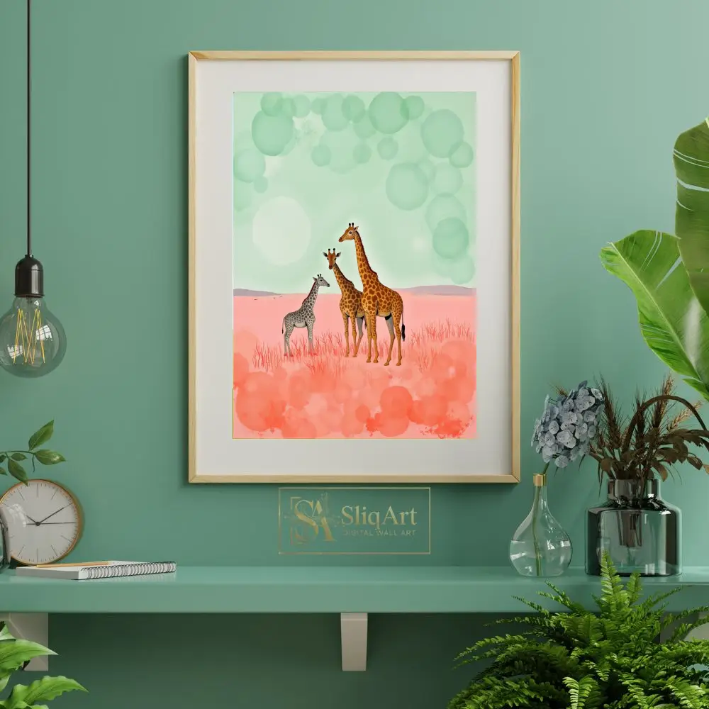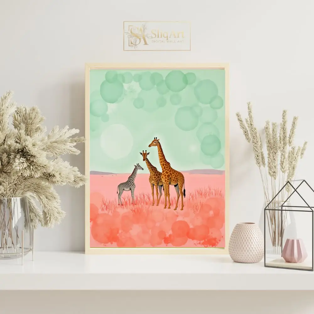 This enchanting art piece features a majestic giraffe family—two adults and a calf—standing gracefully in a dreamlike, surreal landscape. The ground is a vibrant wash of pastel pinks and salmon tones, resembling a soft, otherworldly savannah.