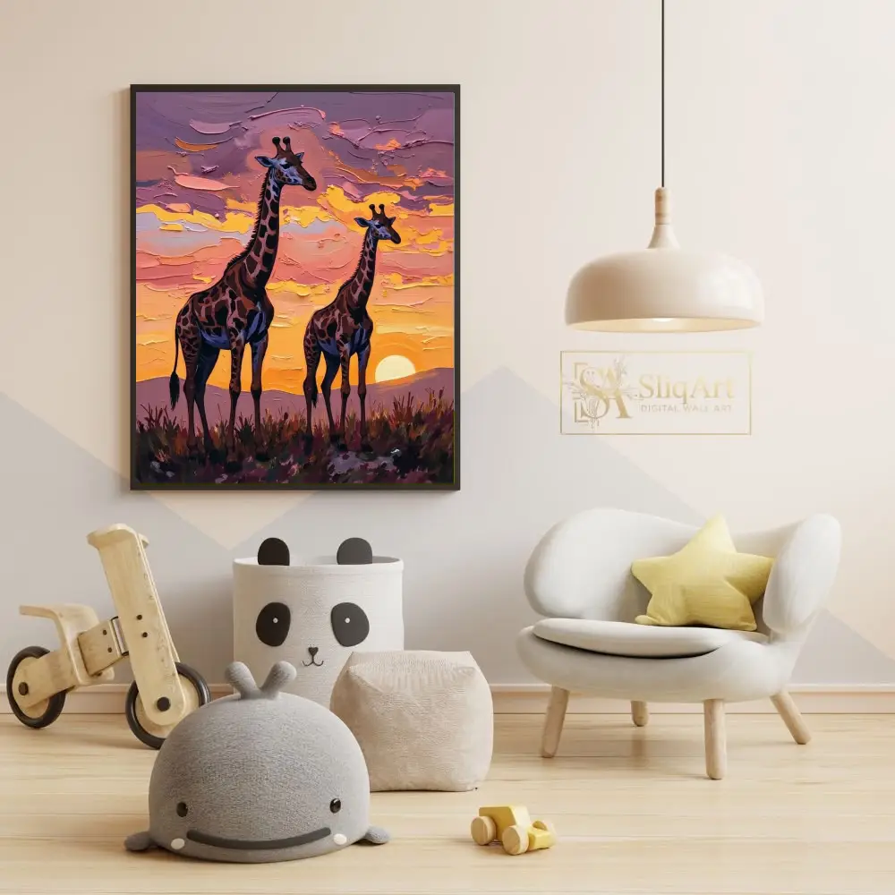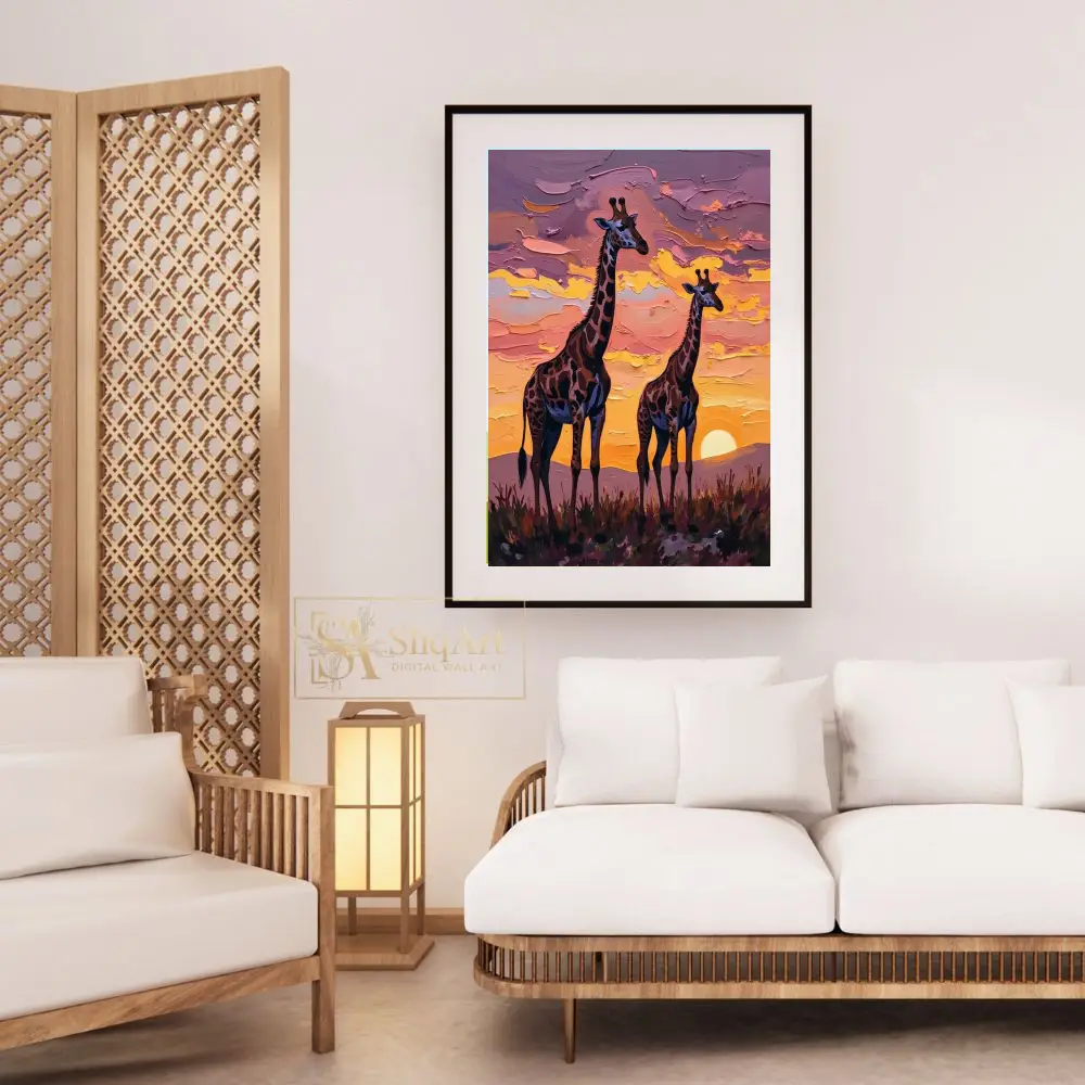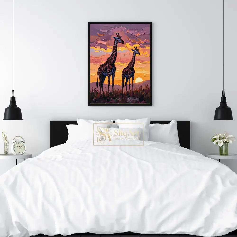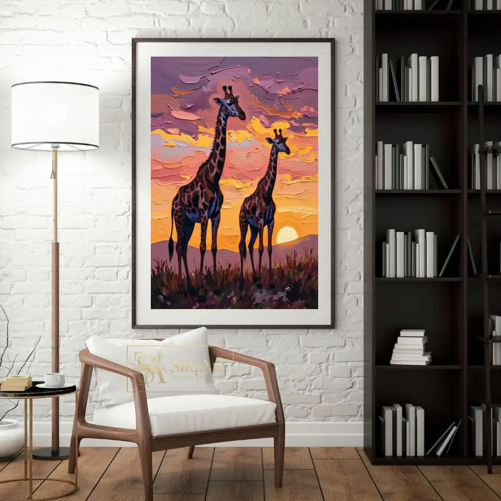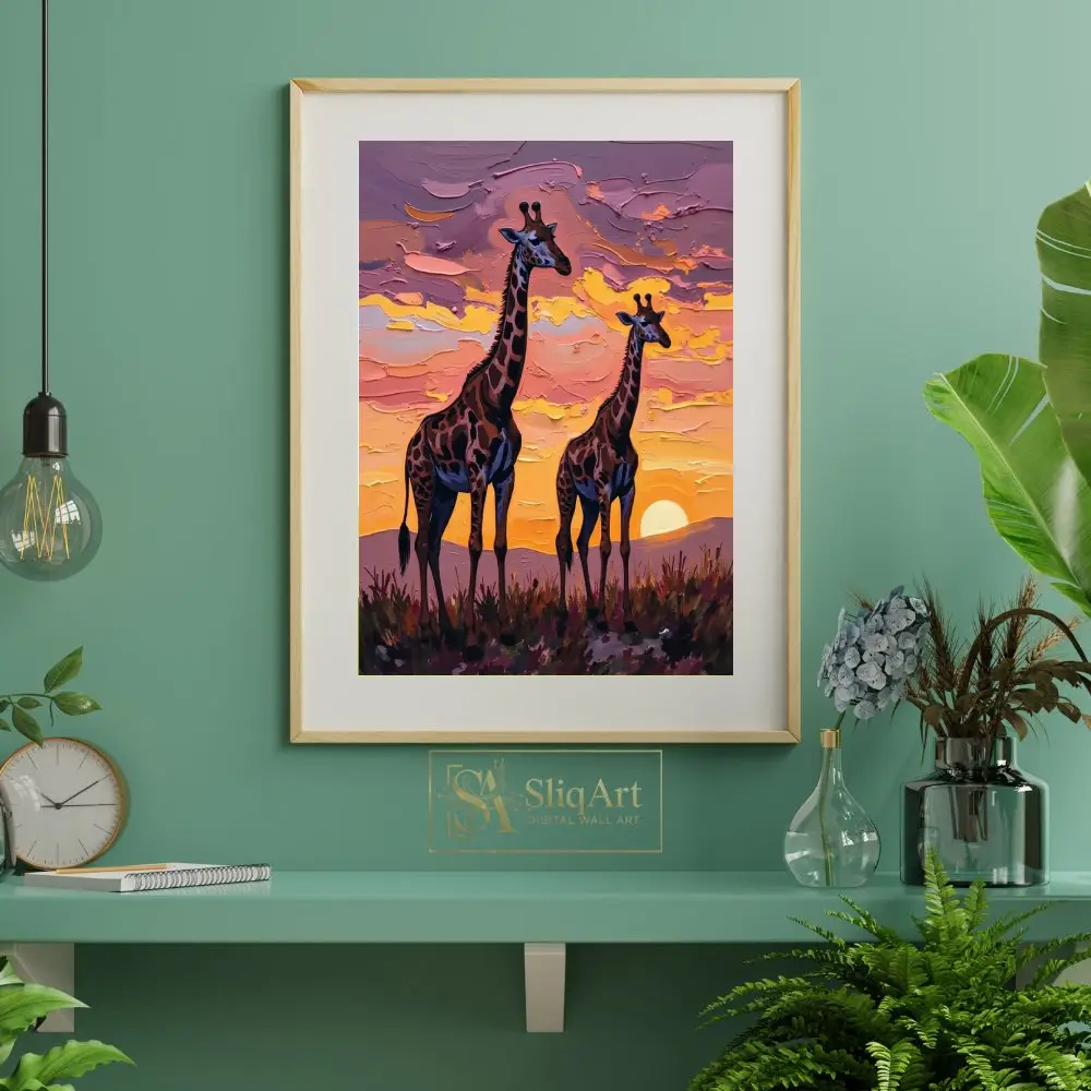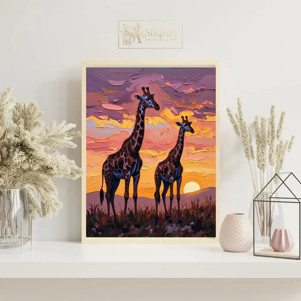 Add a touch of majestic wildlife to your walls with this stunning impasto-style painting of two giraffes silhouetted against a radiant African sunset.