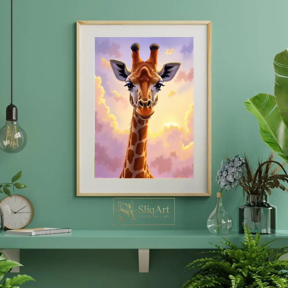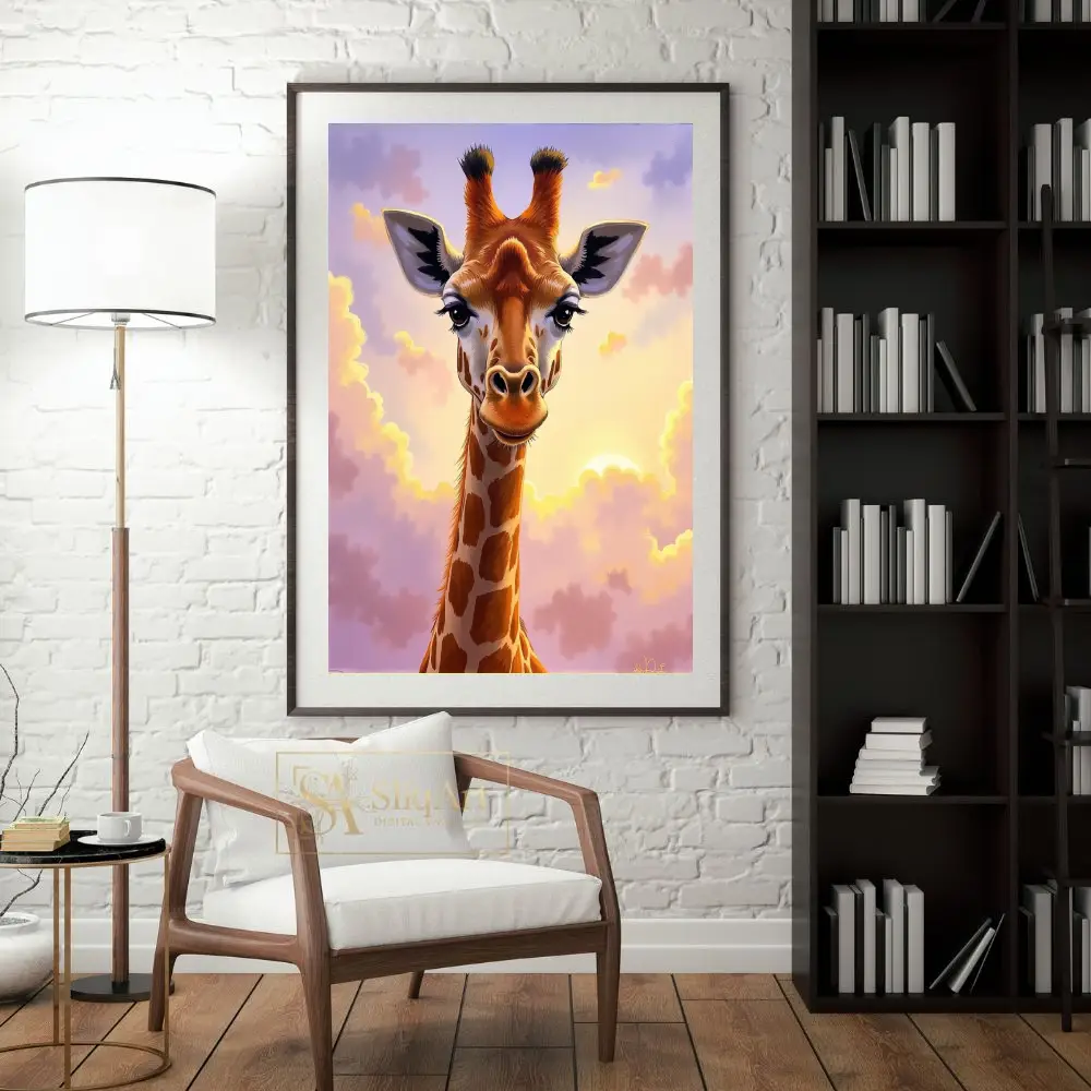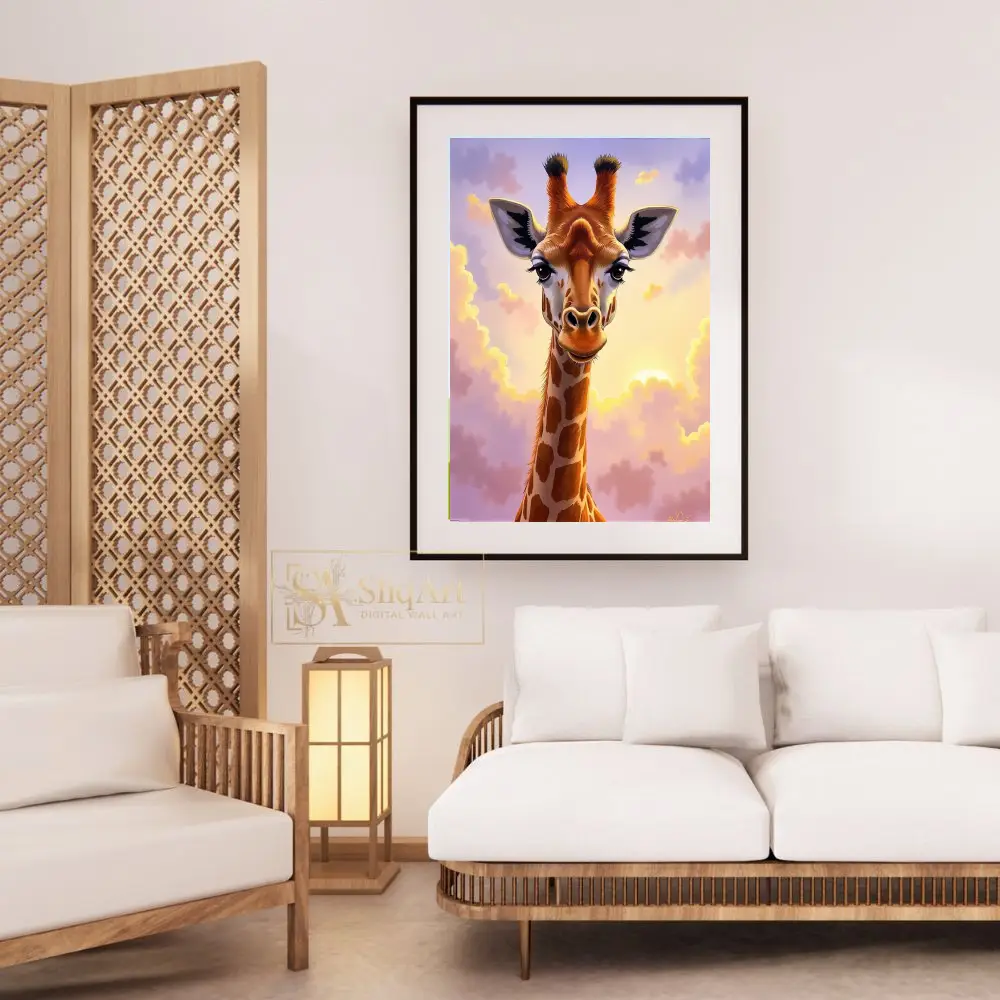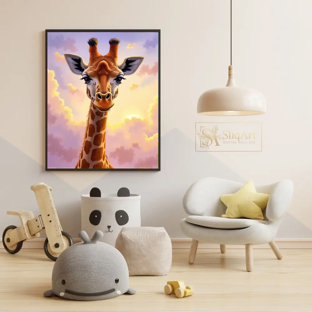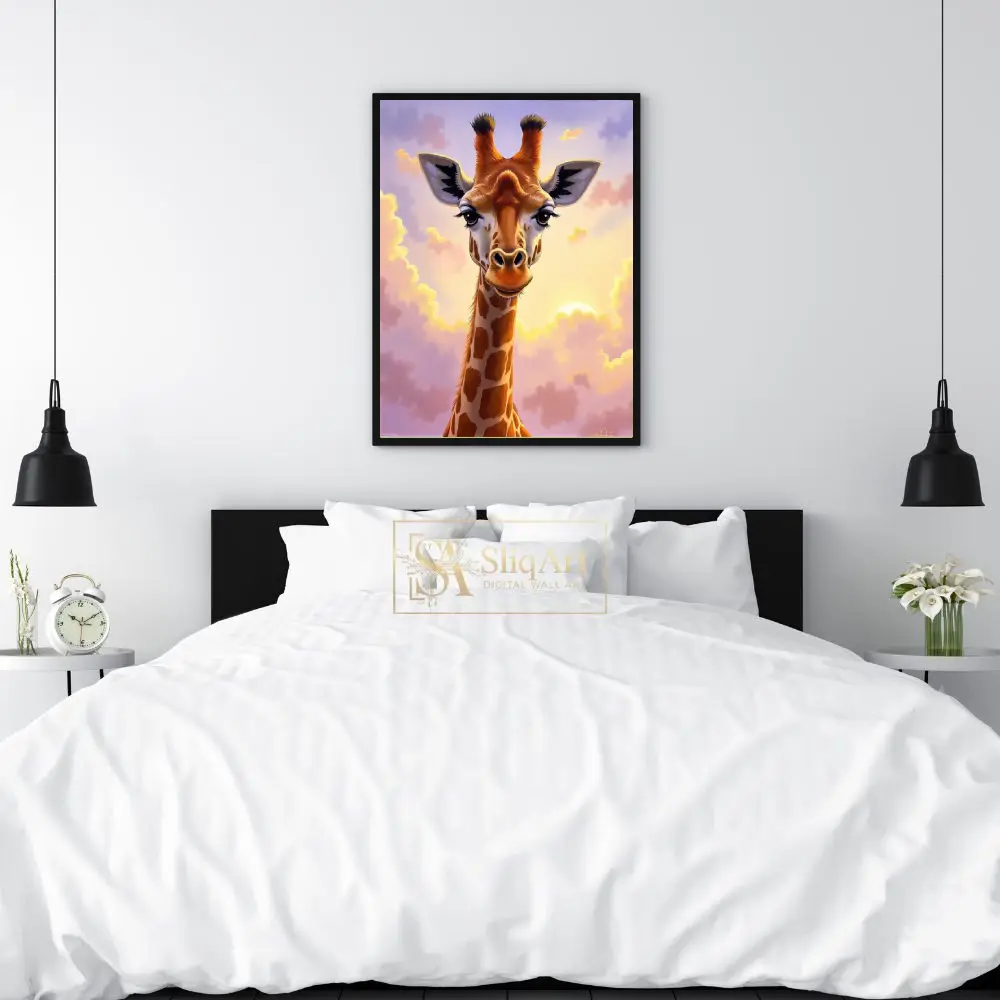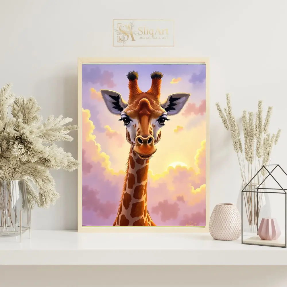 Featuring a close-up portrait with soulful eyes and intricate patterns, the artwork is set against a dreamy pastel sunset filled with soft clouds in shades of lavender, peach, and gold. This vibrant yet soothing piece captures the majestic presence of the giraffe in a modern, stylized aesthetic that adds a touch of nature’s wonder and warmth to any contemporary space.