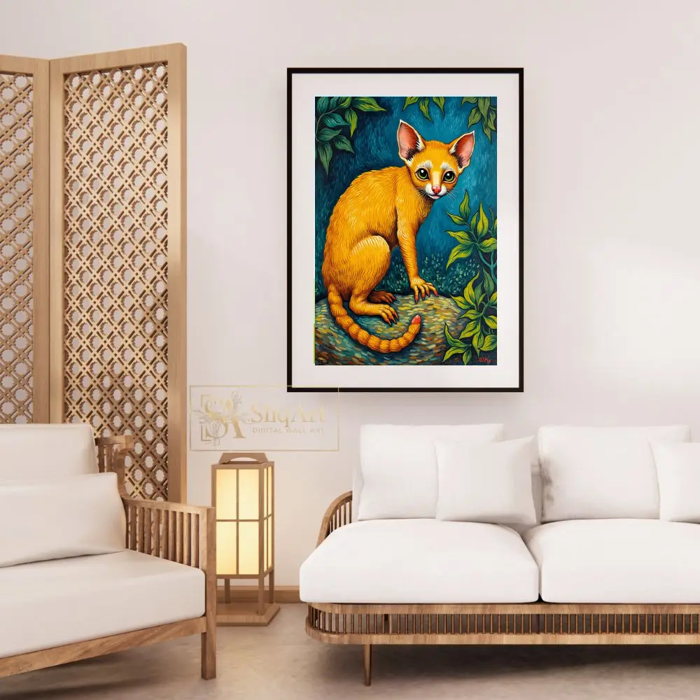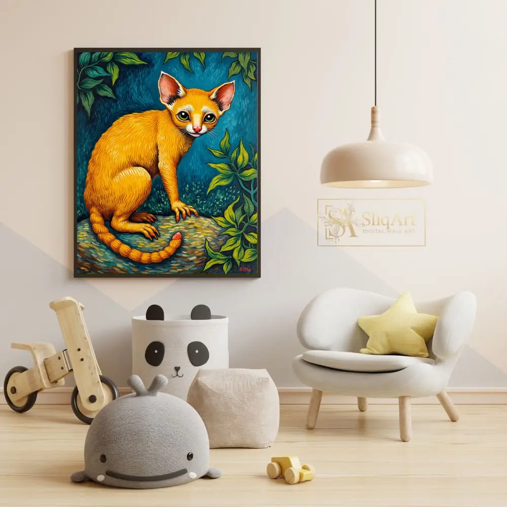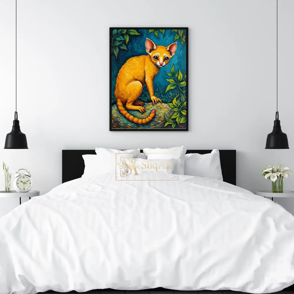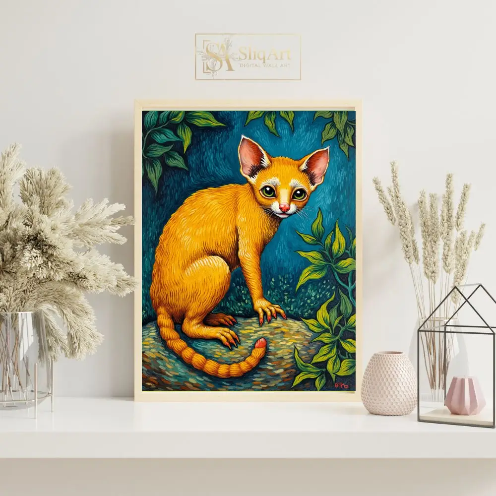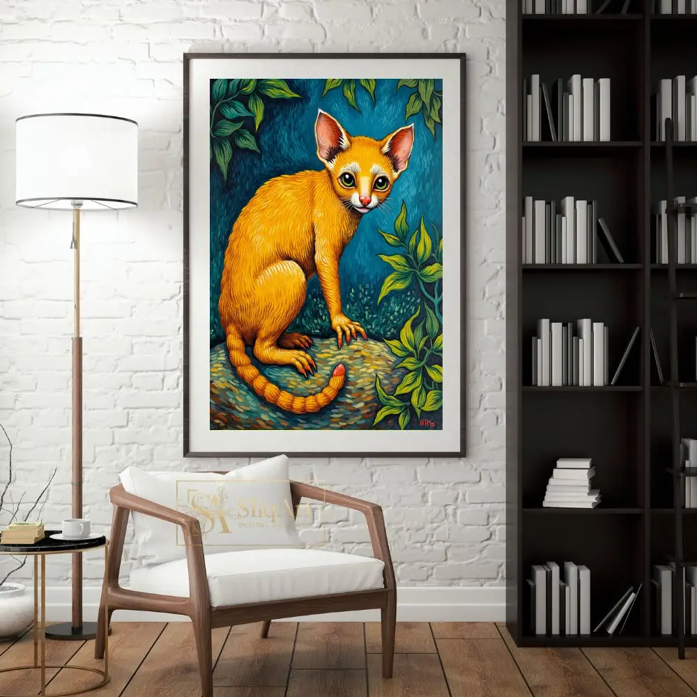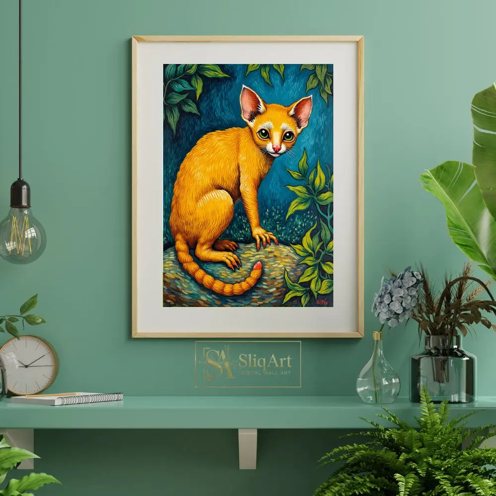 The intricate detailing of the fur, the unique red-tipped claws, and the segmented tail create a sense of whimsical fantasy. Blending elements of folk art and surrealism, this piece uses a bold palette of warm oranges and cool greens to create a dynamic visual experience that commands attention in any interior space.