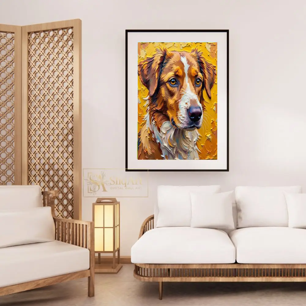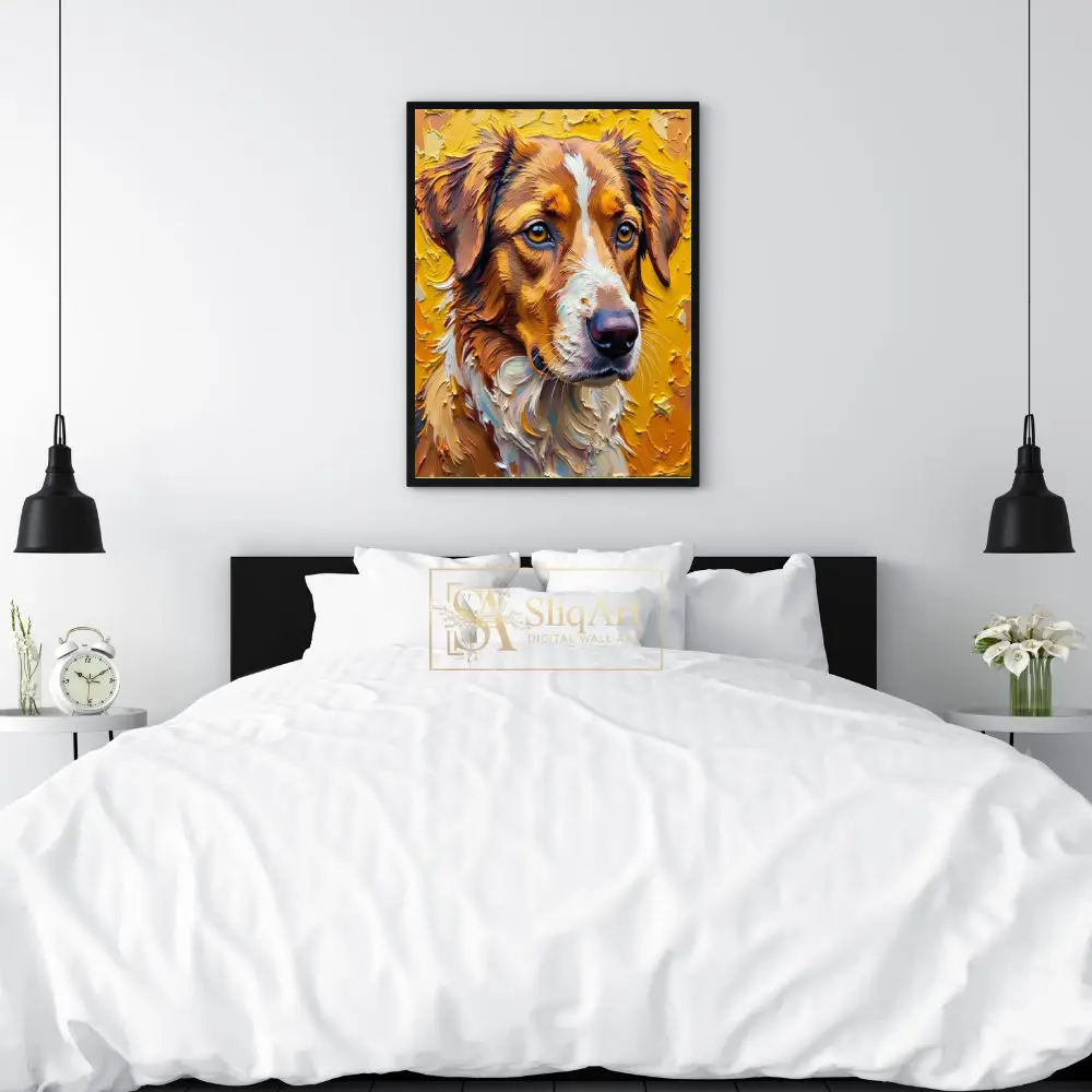 The interplay of warm browns, rust tones, and crisp whites in the fur makes this piece a masterpiece of modern expressionism. Perfect for pet enthusiasts looking for a bold statement piece that combines artistic craftsmanship with the warmth of a loyal companion.