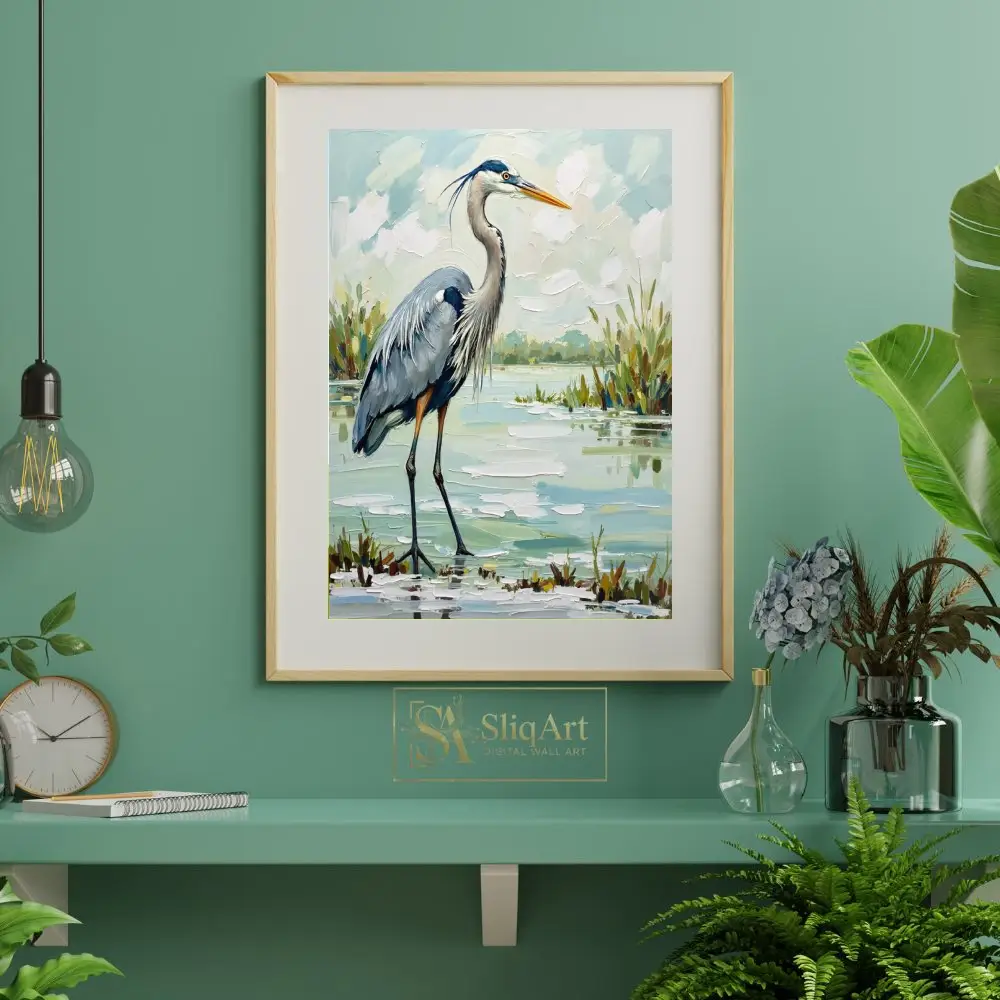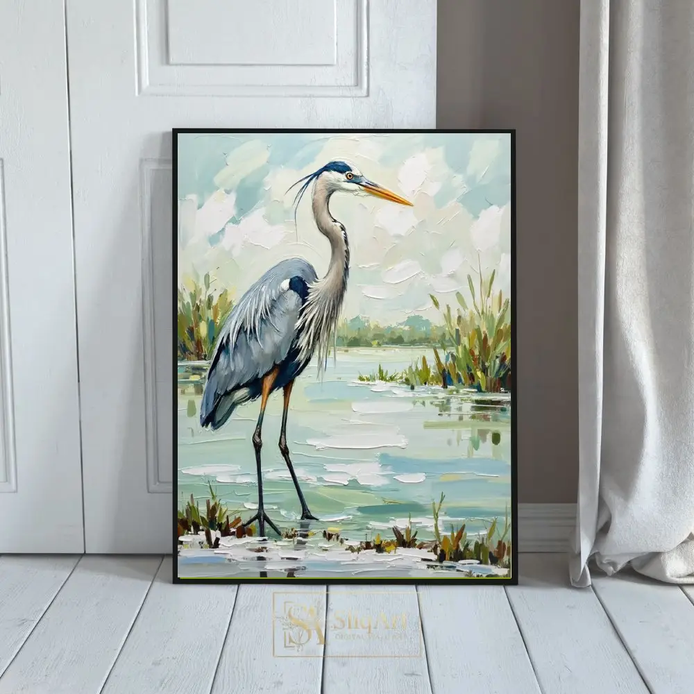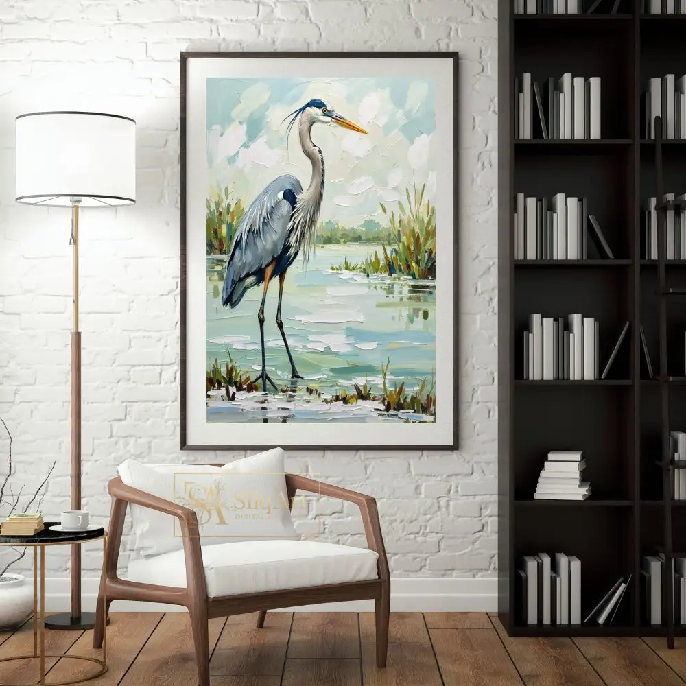 Enhance your living space with the tranquil beauty of the wetlands through this exquisite Great Blue Heron oil painting. Rendered in a bold impasto style, the artist uses thick, expressive brushstrokes to bring the heron’s textured plumage and the shimmering marsh water to life.