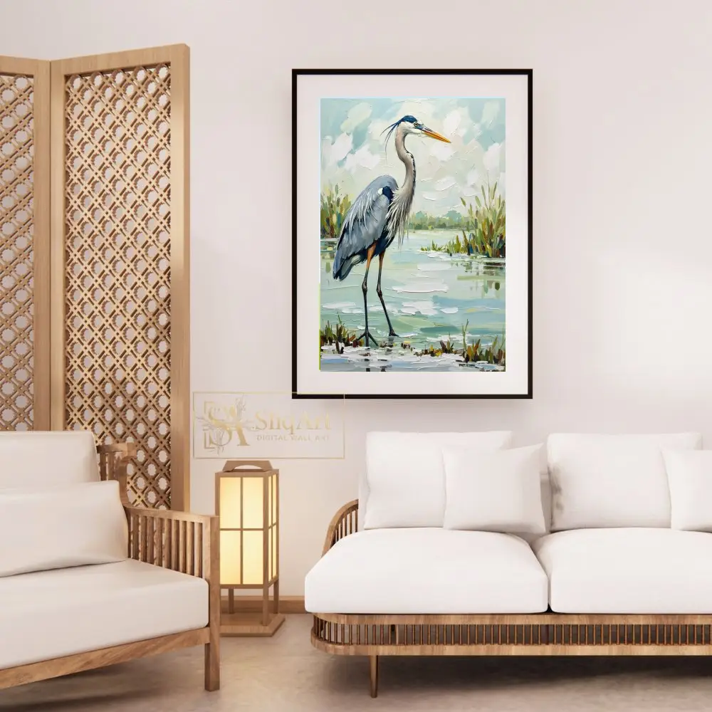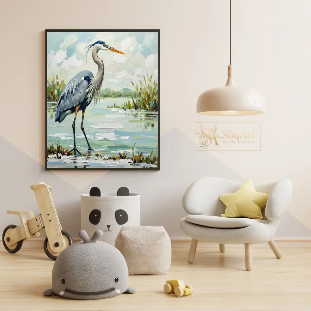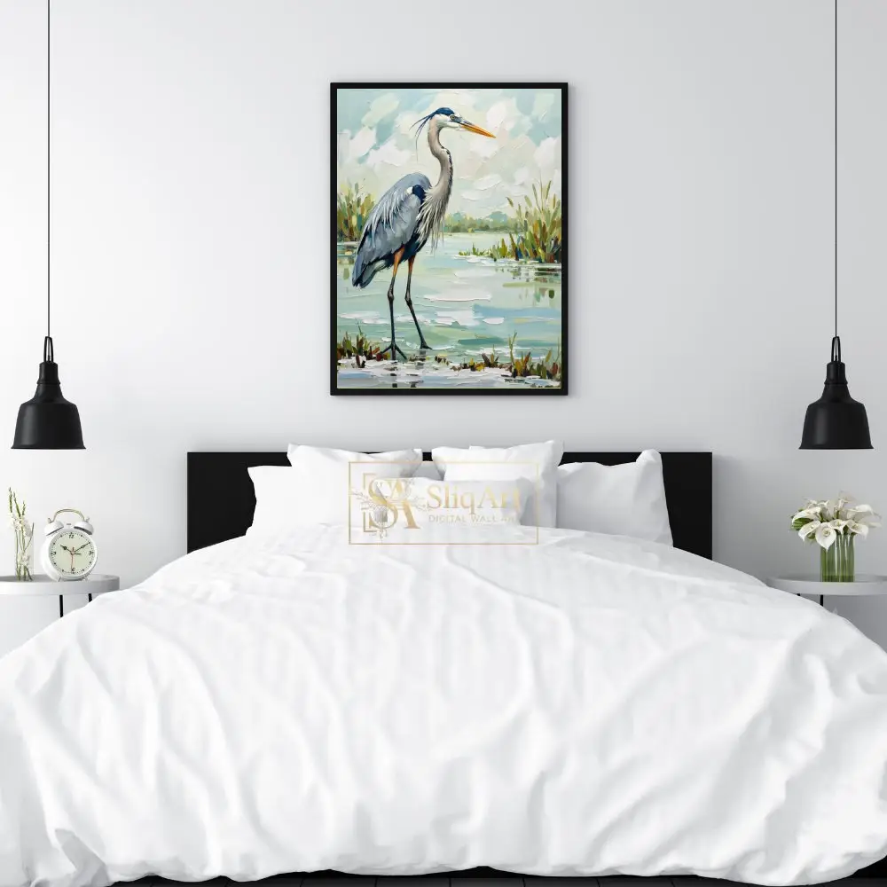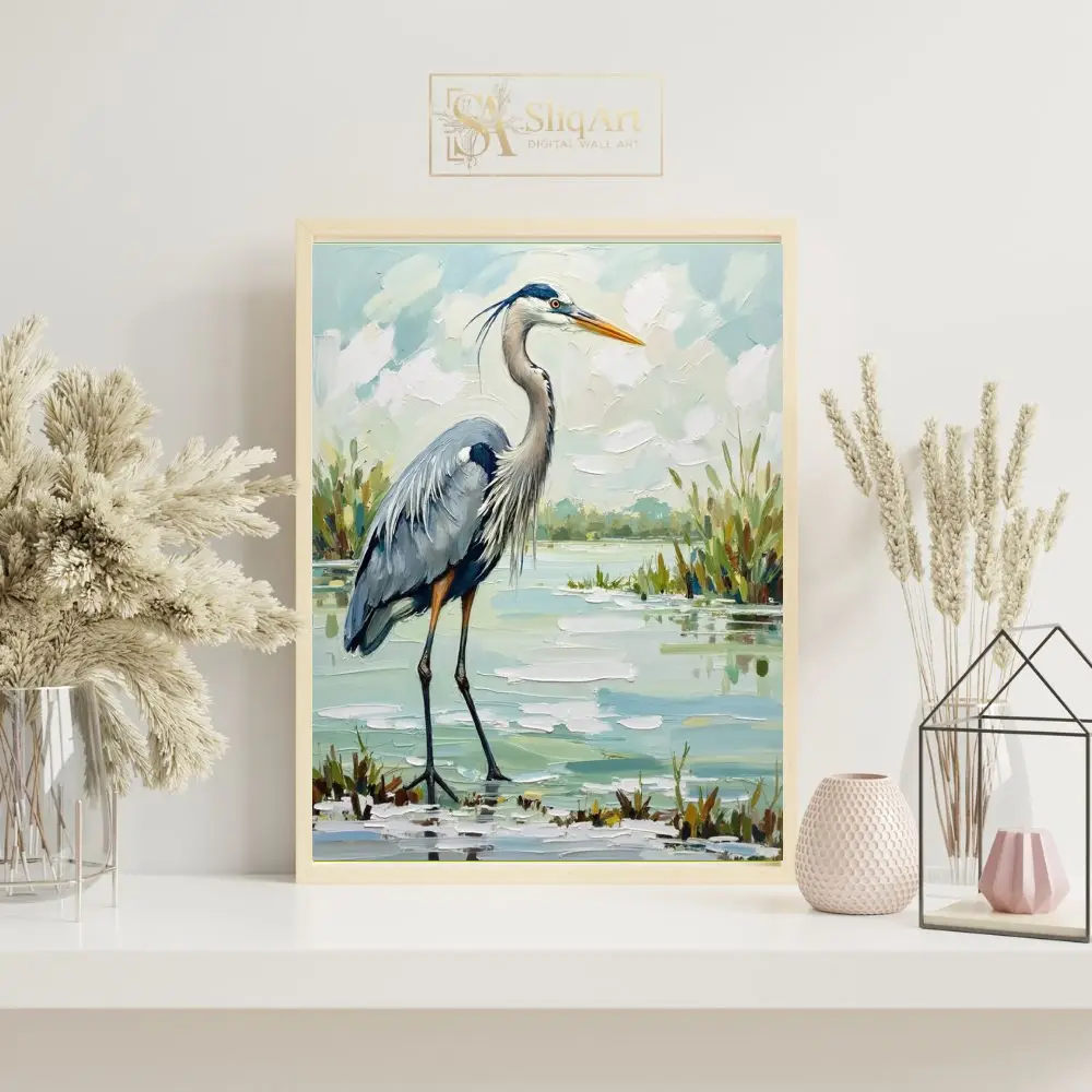 Enhance your living space with the tranquil beauty of the wetlands through this exquisite Great Blue Heron oil painting. Rendered in a bold impasto style, the artist uses thick, expressive brushstrokes to bring the heron’s textured plumage and the shimmering marsh water to life.