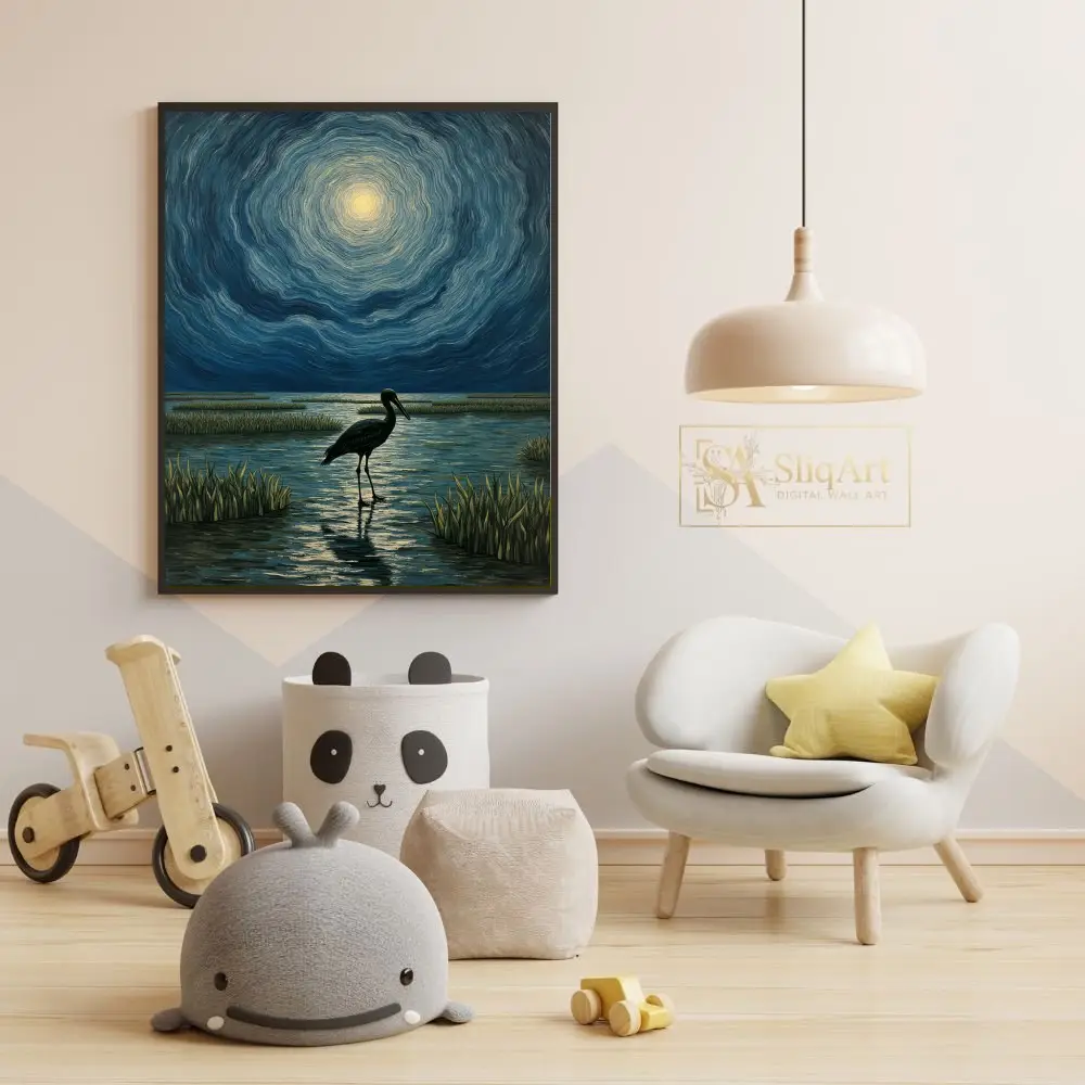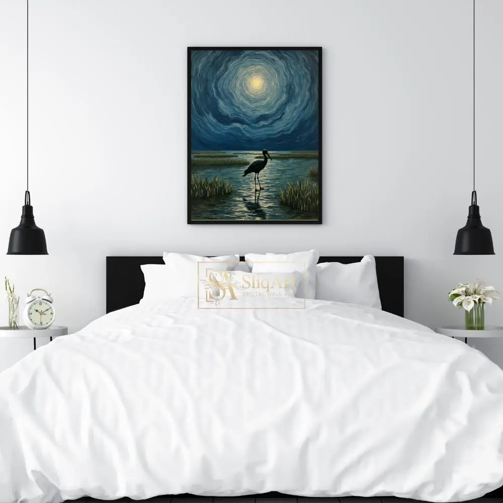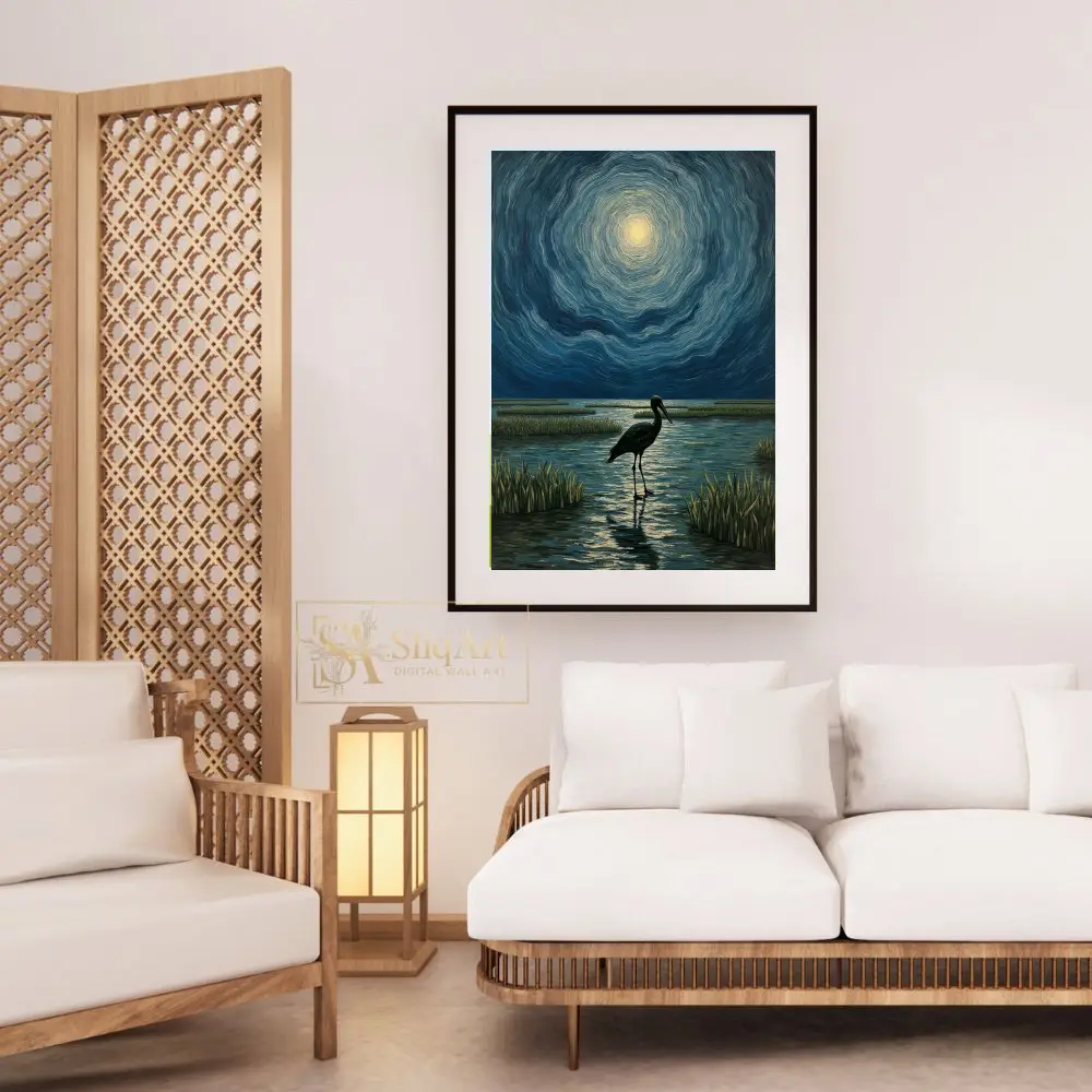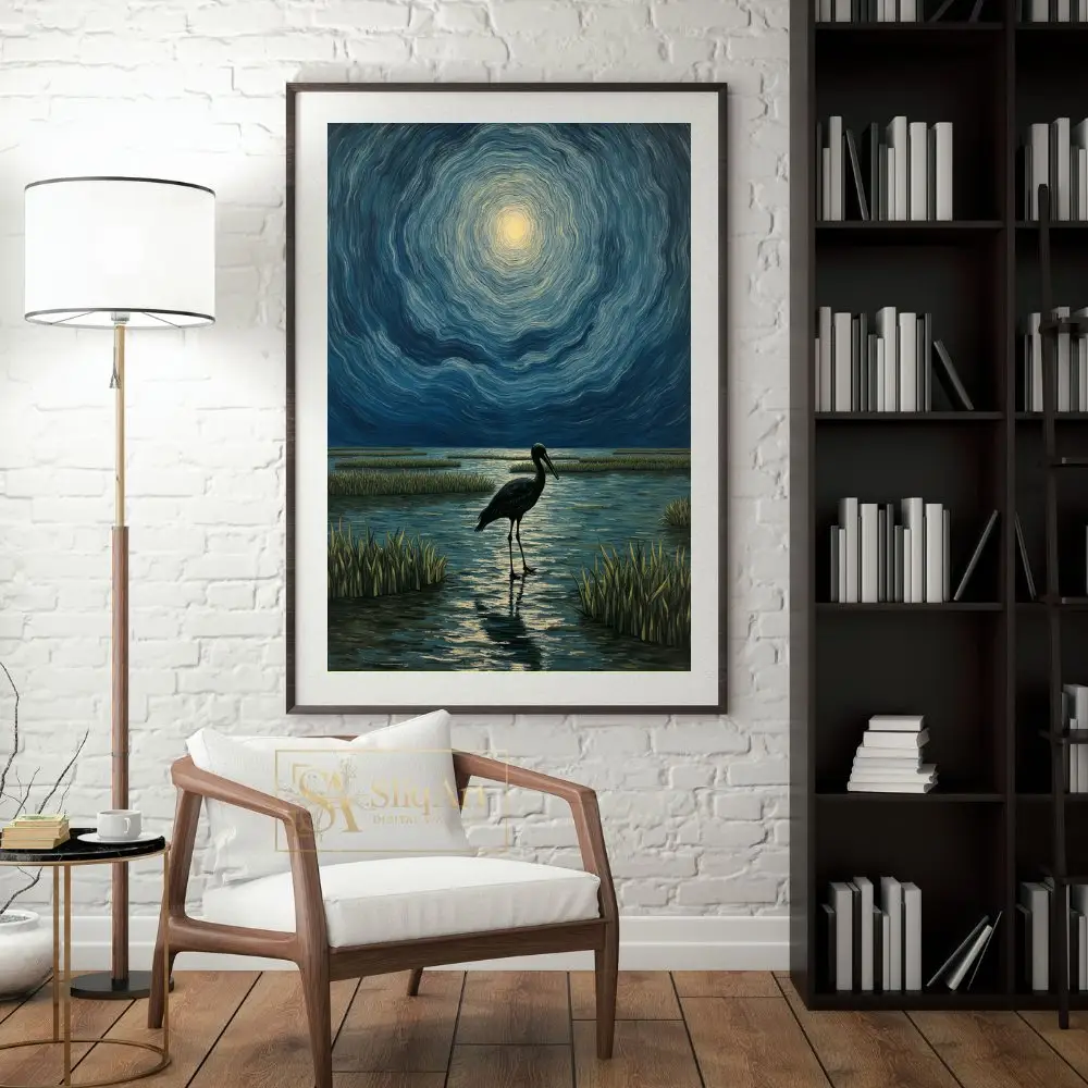 This captivating piece features a lone wading bird silhouetted against a shimmering marsh at night. Above, the sky transforms into a mesmerizing vortex of concentric, rhythmic lines, drawing heavy inspiration from the expressive post-impressionist brushwork of Van Gogh.