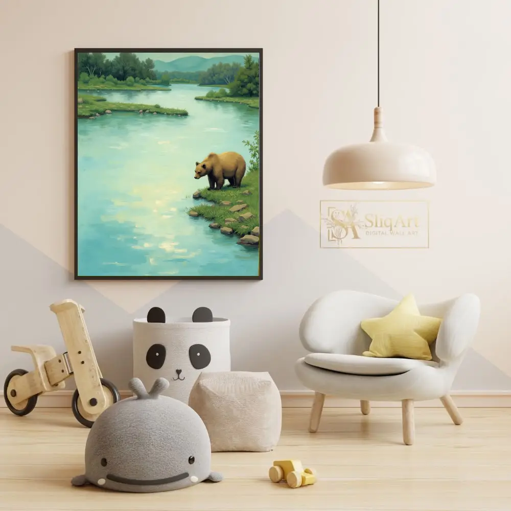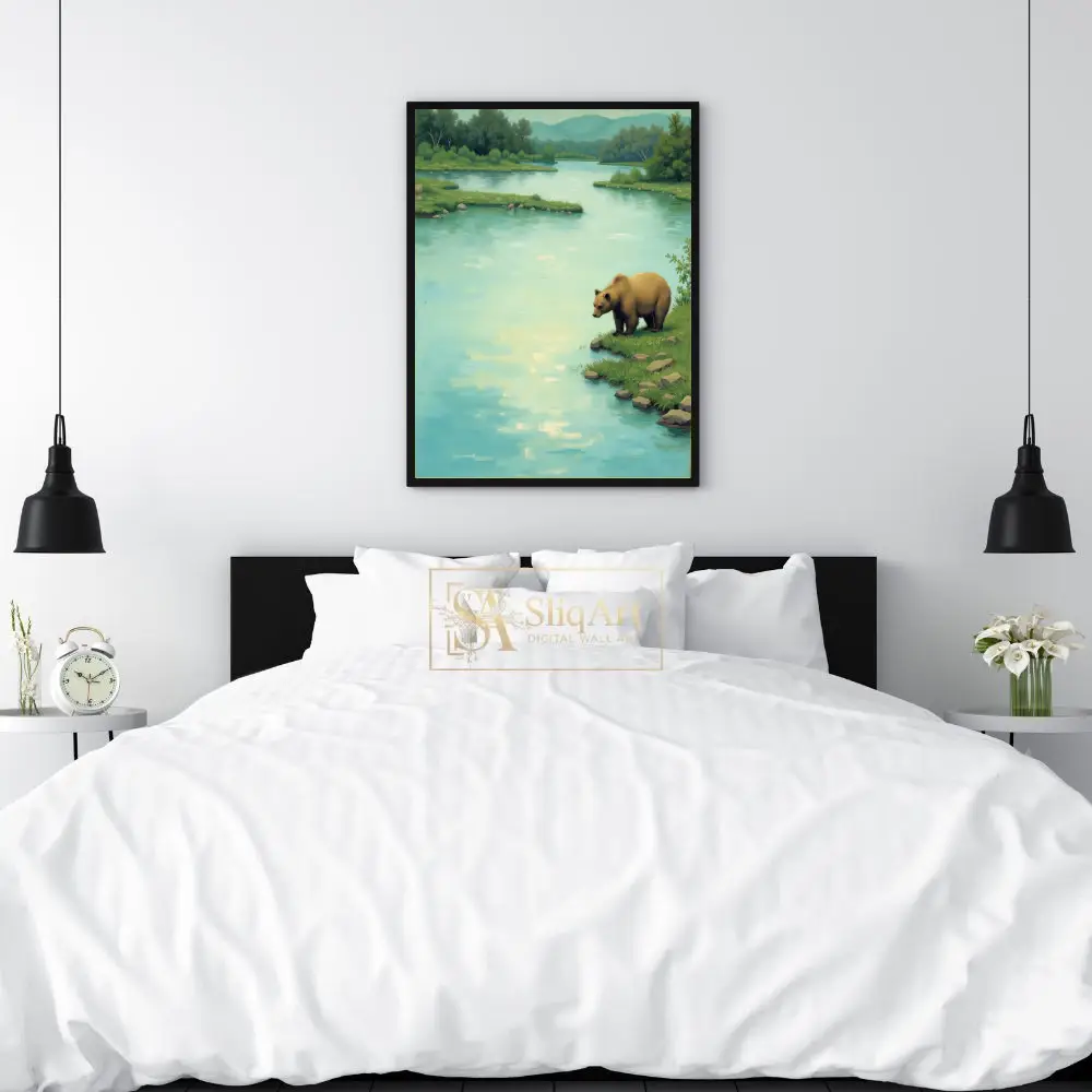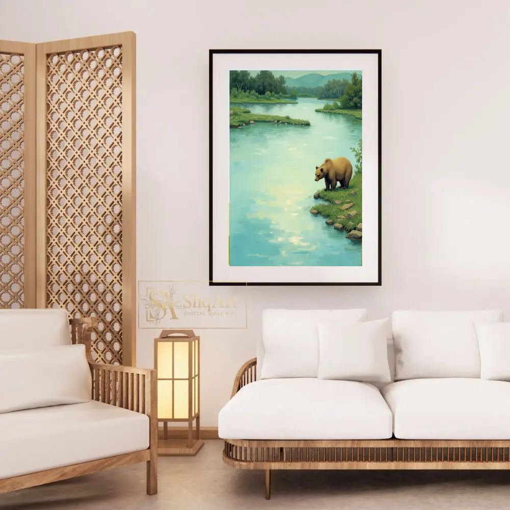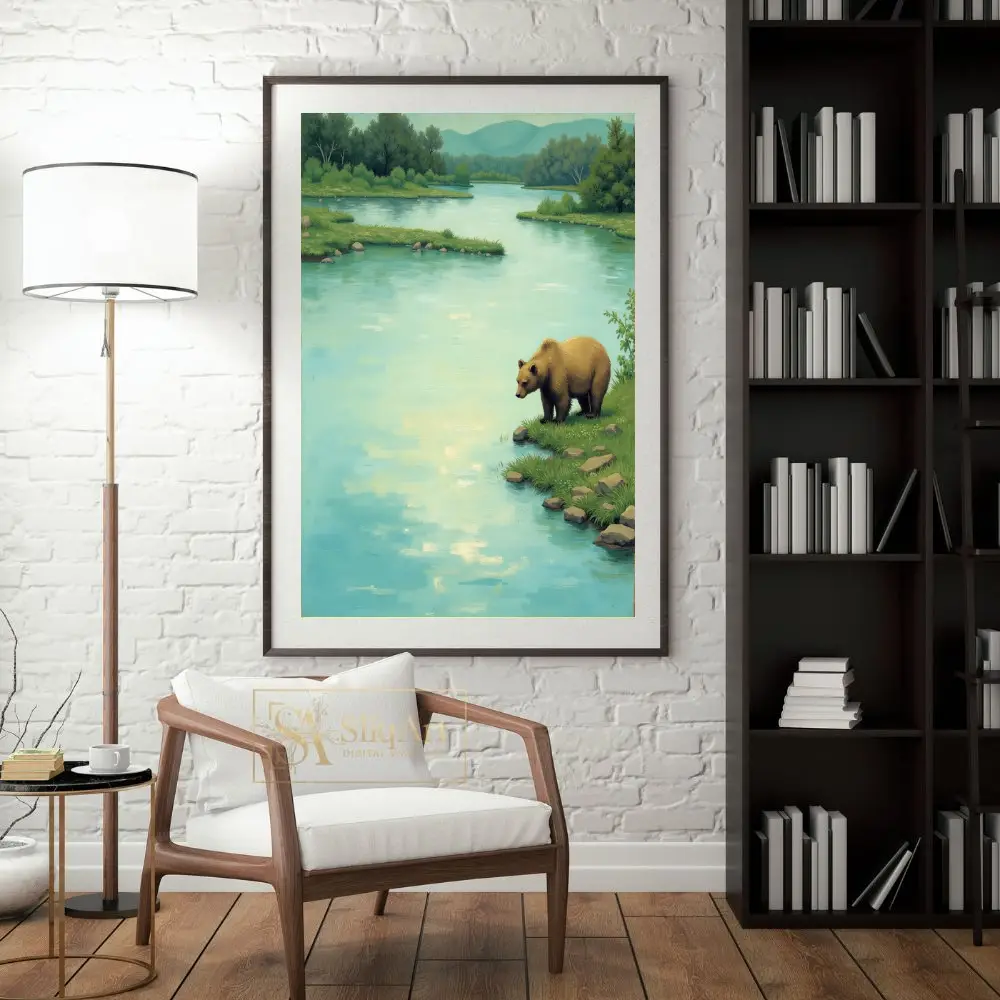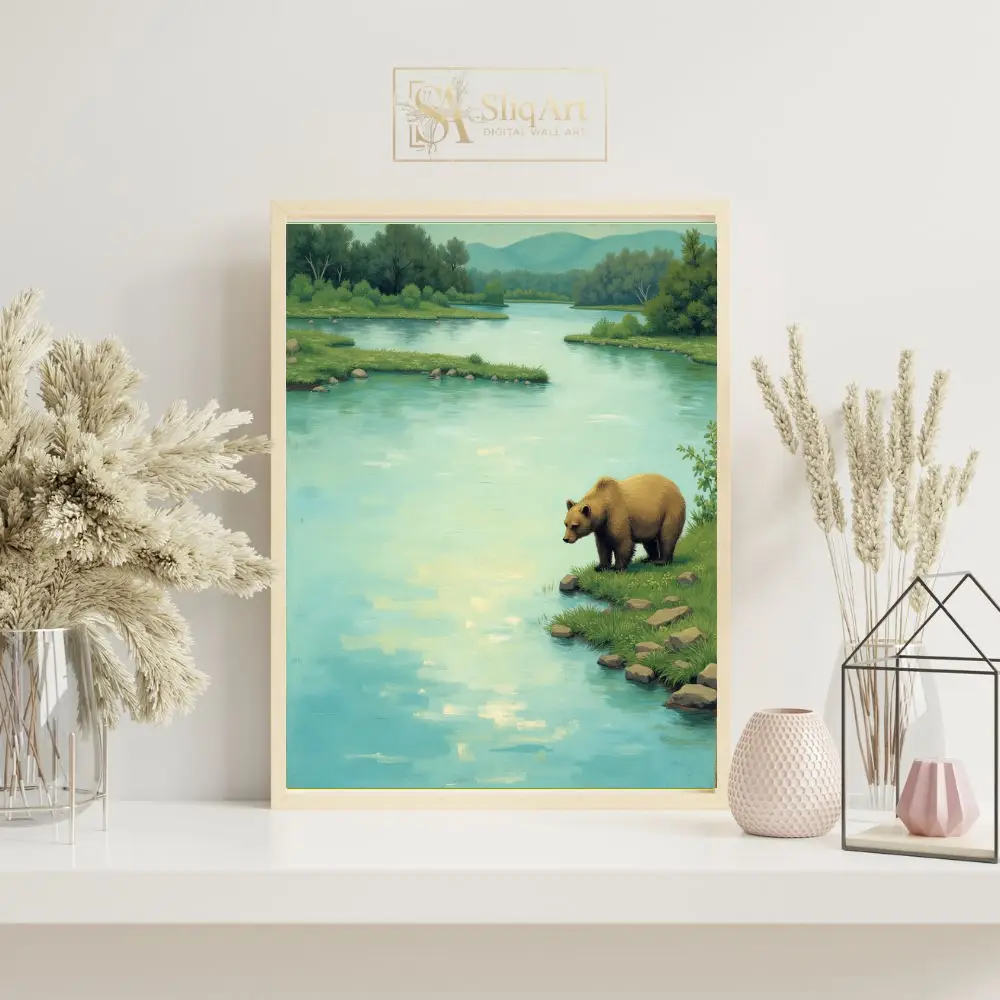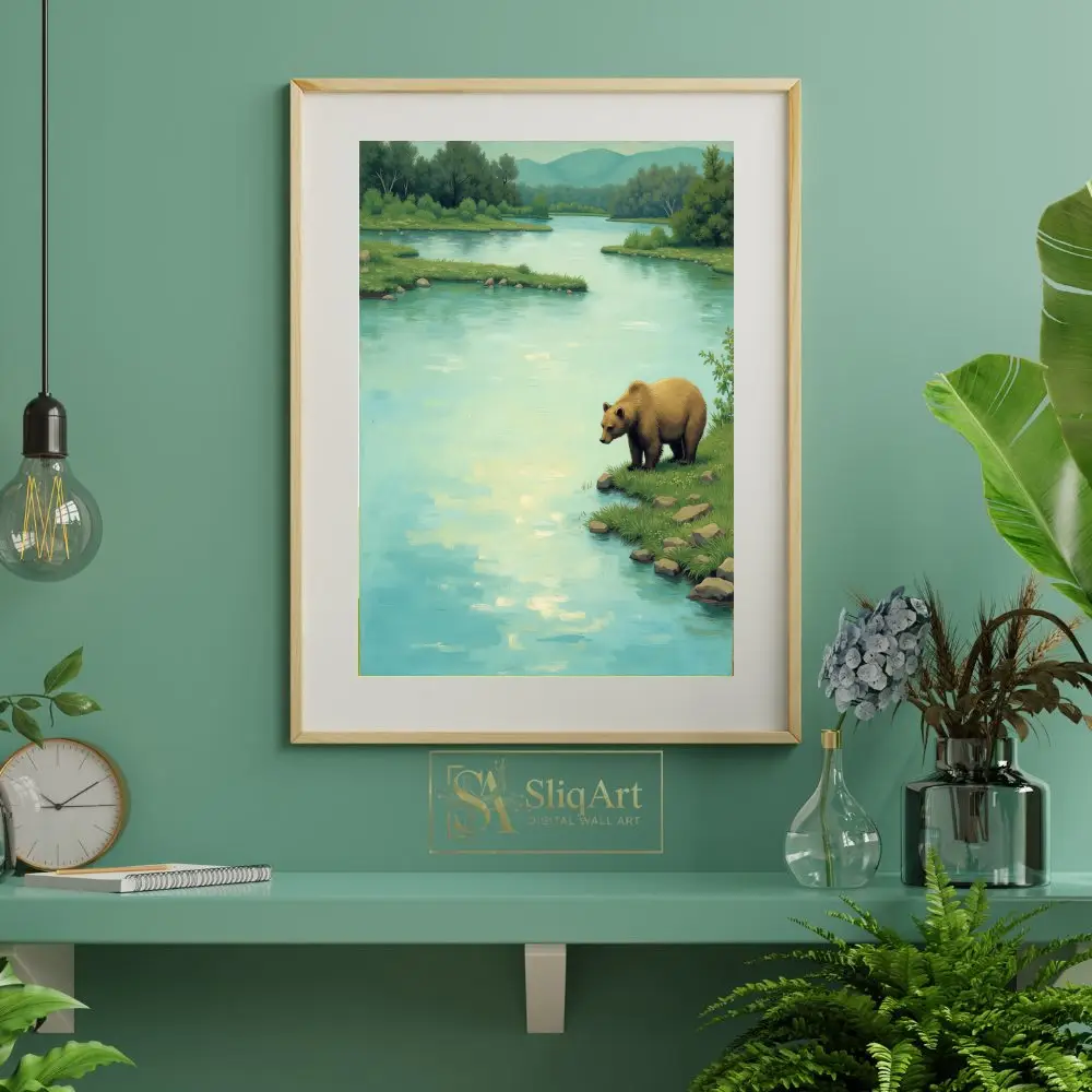 Bring the serene power of the wild into your home with this stunning landscape painting. Featuring a majestic brown bear standing at the edge of a crystal-clear, shimmering turquoise river, this piece captures a moment of quiet reflection in the heart of nature.