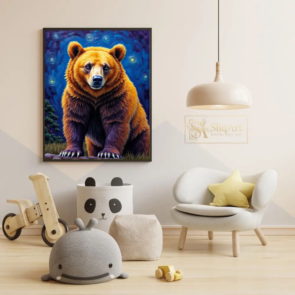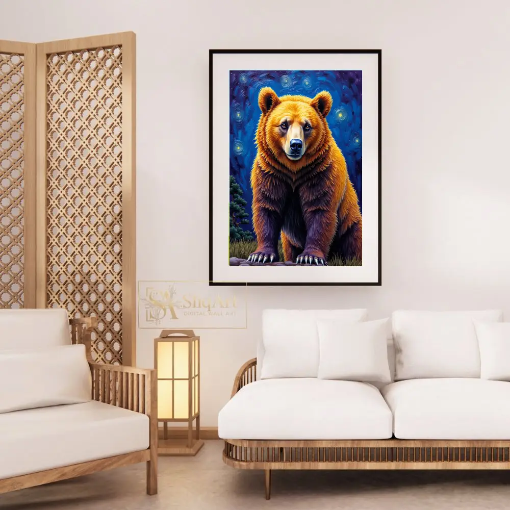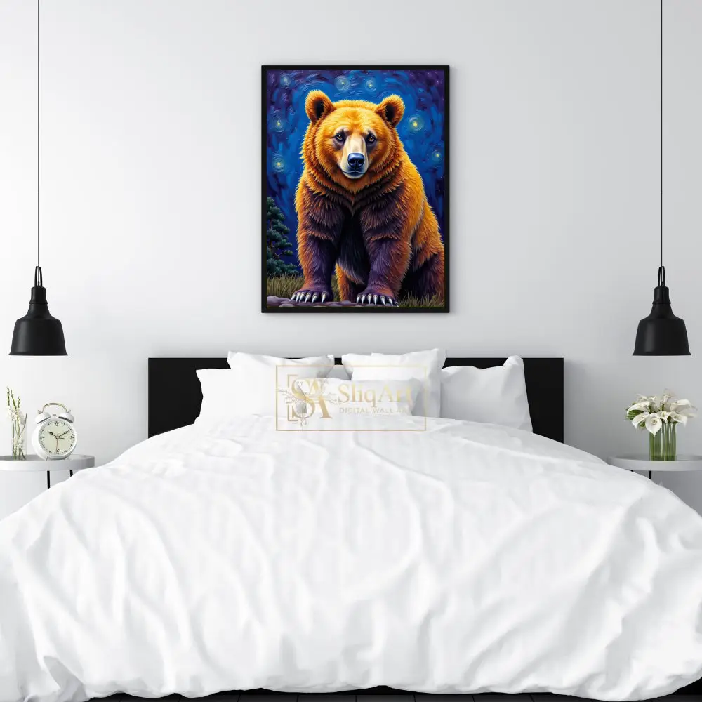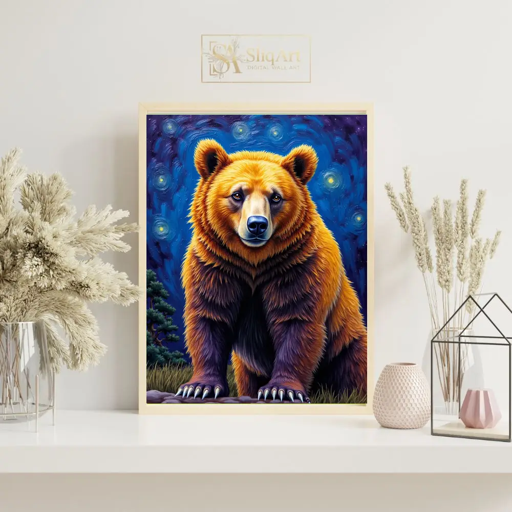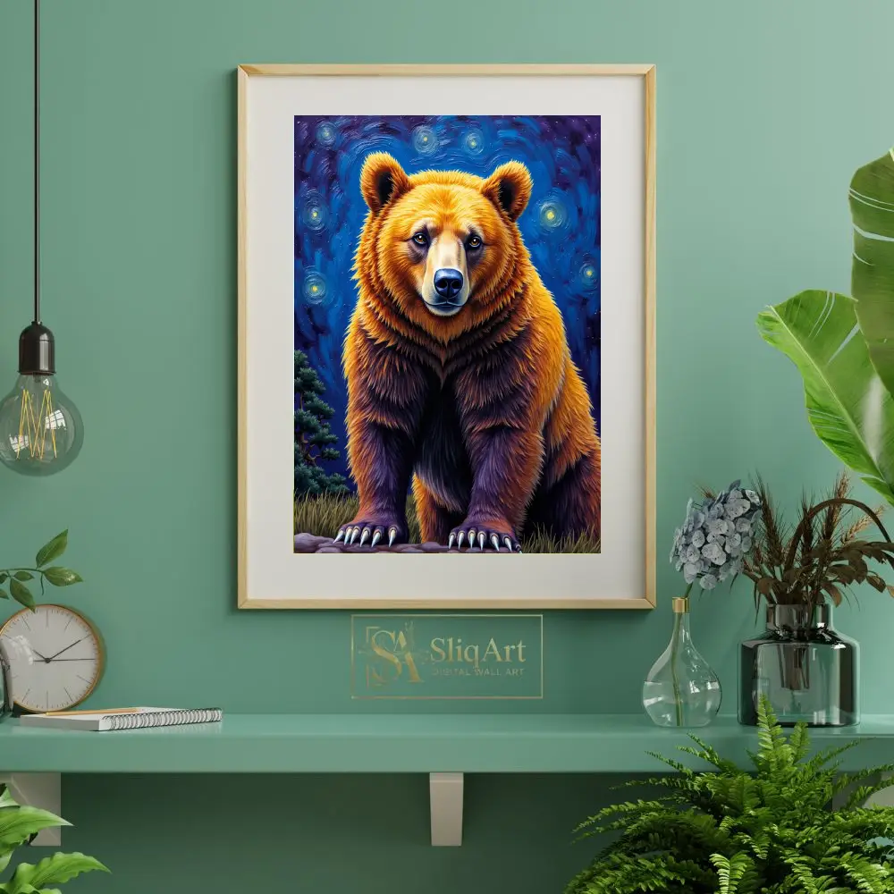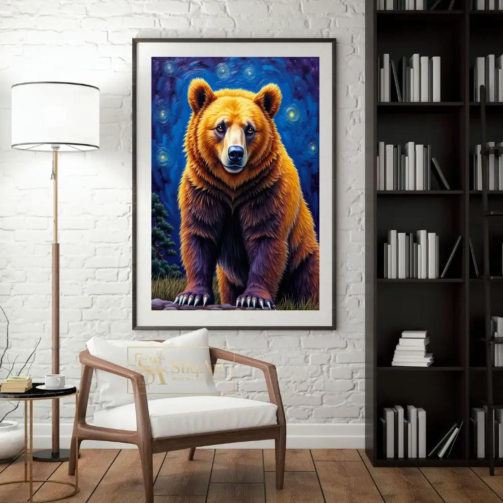 Embrace the power and tranquility of the wild with this stunning grizzly bear portrait, reimagined through a post-impressionist lens. This artwork features a majestic bear rendered in rich golden and deep umber tones, standing boldly against a swirling, starlit sky reminiscent of classic masterpieces.