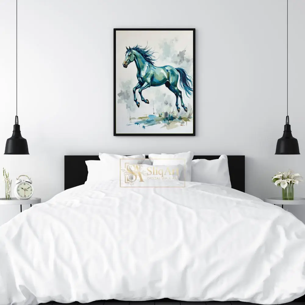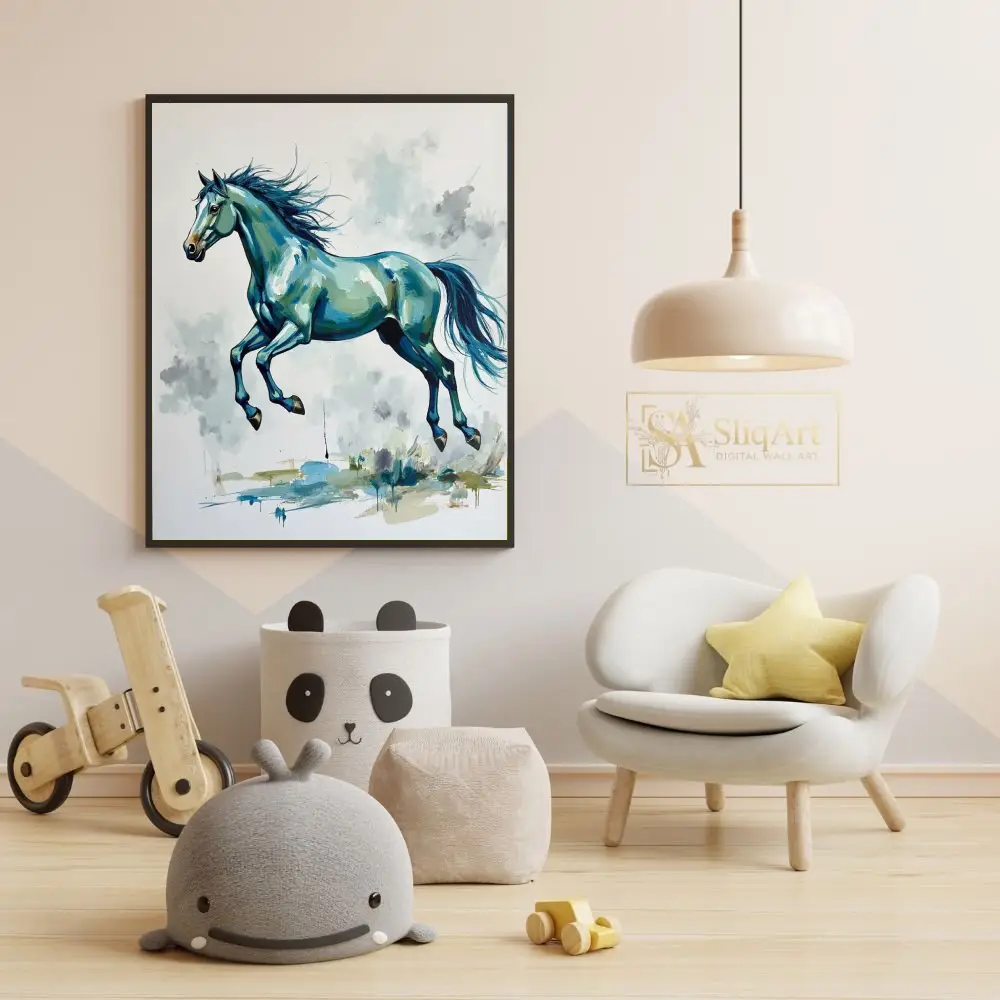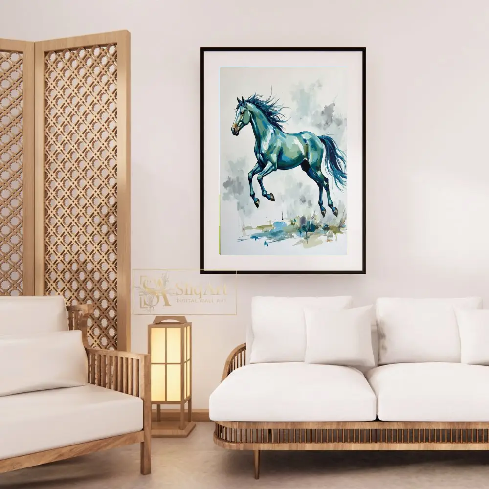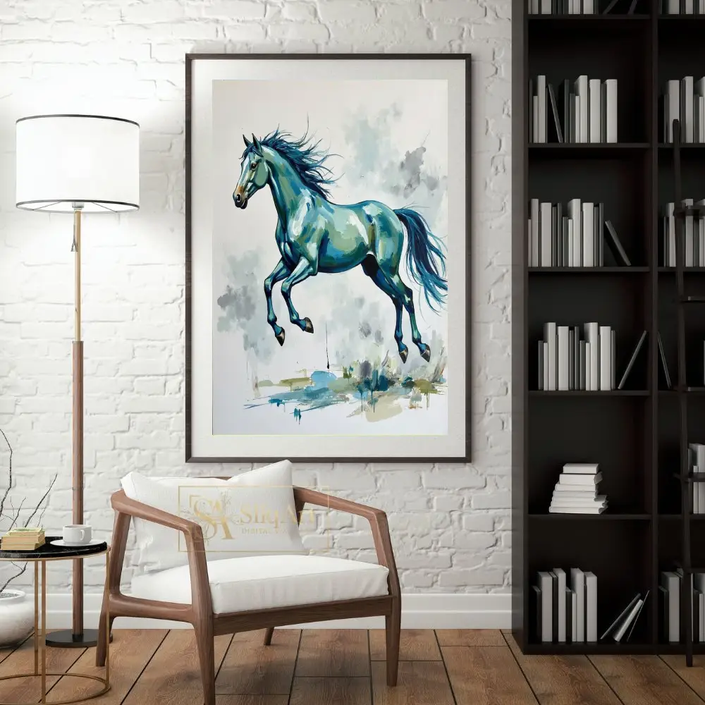 The fluid brushstrokes and abstract, misty background create a sense of kinetic energy and freedom. This artwork serves as a bold statement piece, perfect for adding a touch of modern vitality and sophisticated color to your interior design. Whether placed in a professional setting or a personal sanctuary, its dynamic composition captures the timeless beauty of the horse in a uniquely modern style.