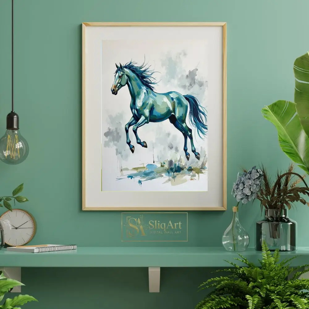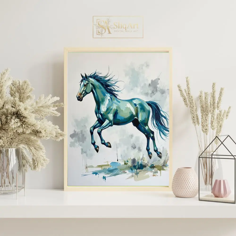 Embrace the power and elegance of nature with this striking contemporary painting of a horse in mid-stride. Titled ‘Spirit of Motion’, this piece utilizes an expressive palette of teal, turquoise, and deep indigo to depict a majestic equine figure.