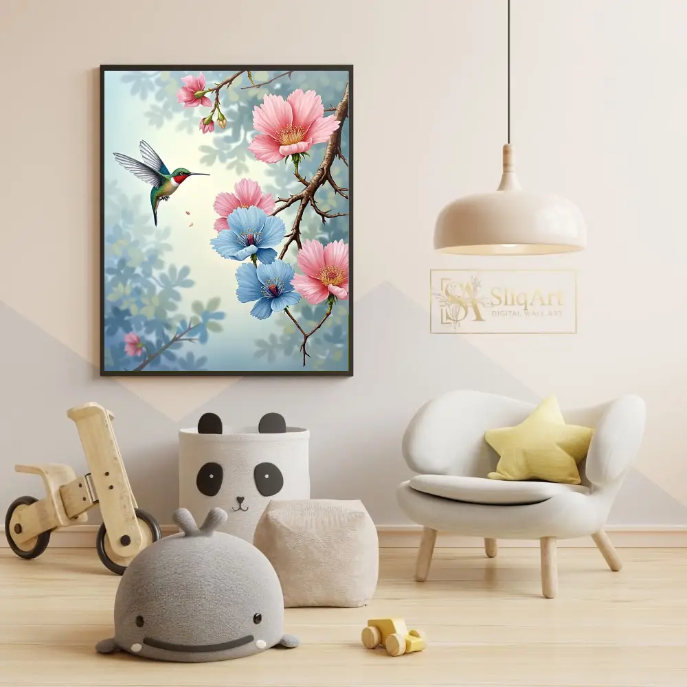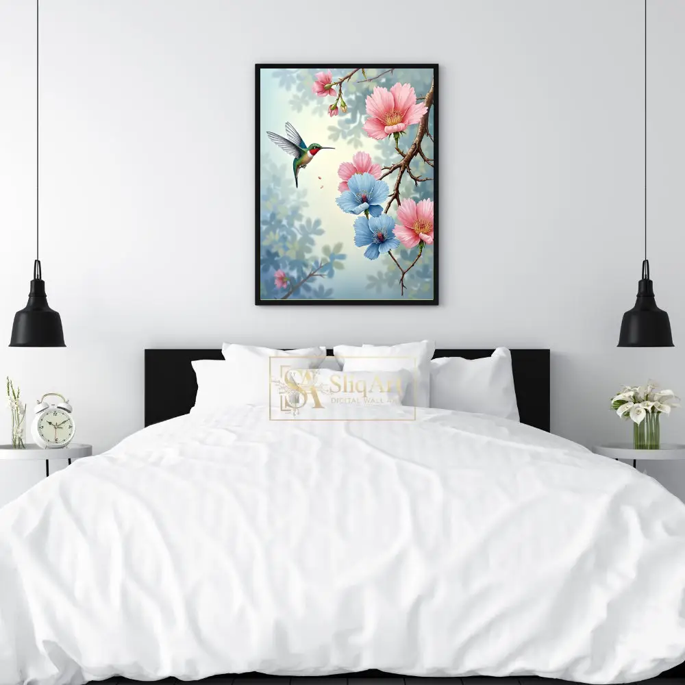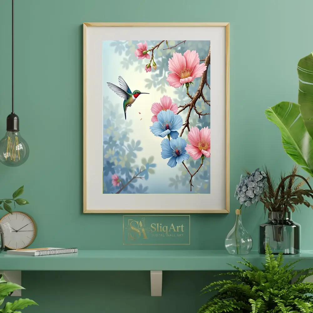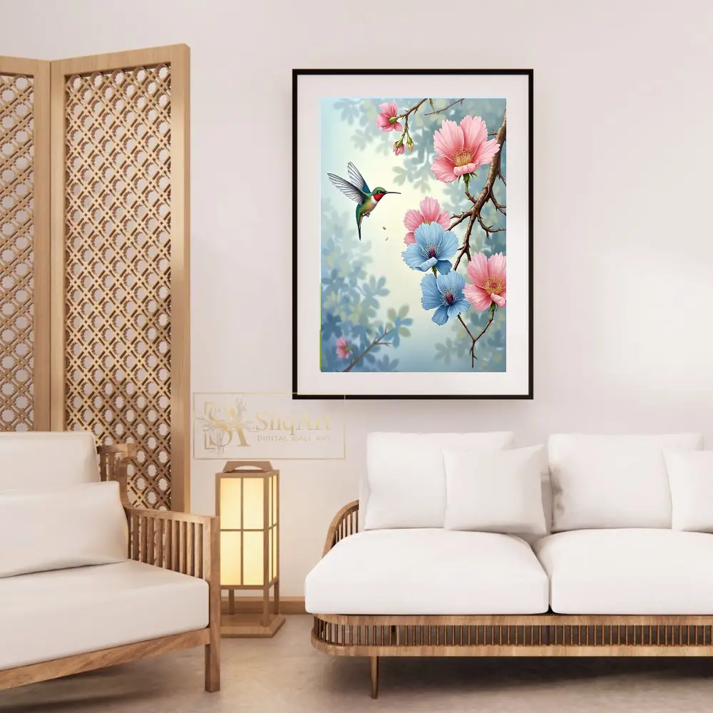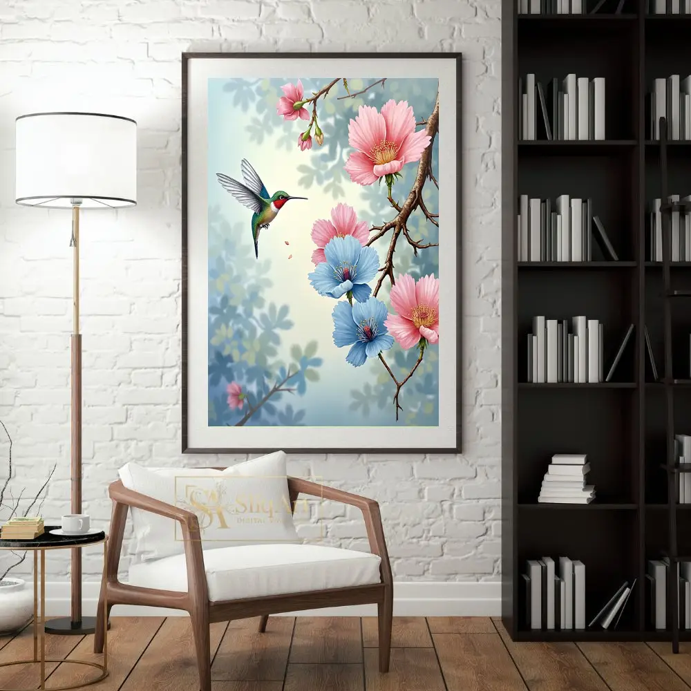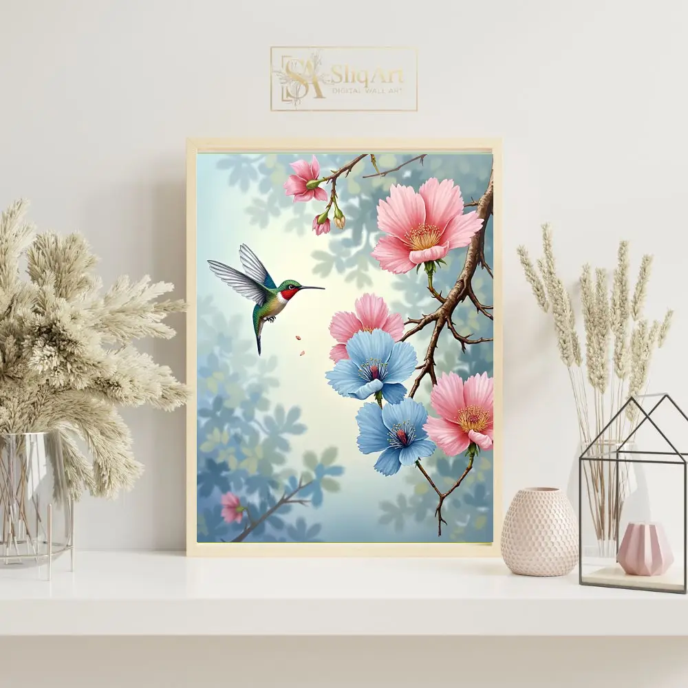 This enchanting digital illustration captures the delicate dance of a hummingbird approaching a cluster of vibrant pink and soft blue blossoms. The detailed rendering of the bird’s iridescent green and ruby feathers contrasts beautifully with the soft, ethereal background, creating a sense of peace and fluid movement.