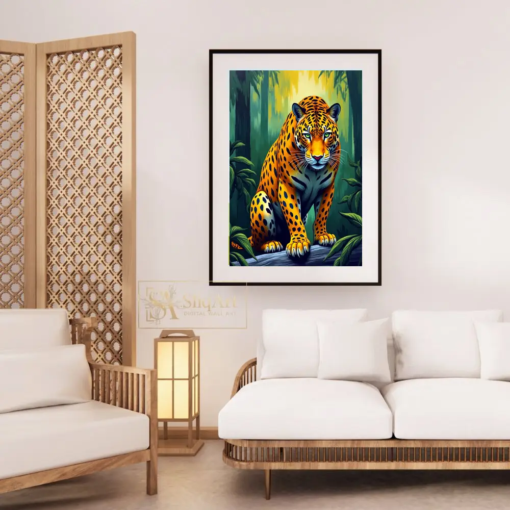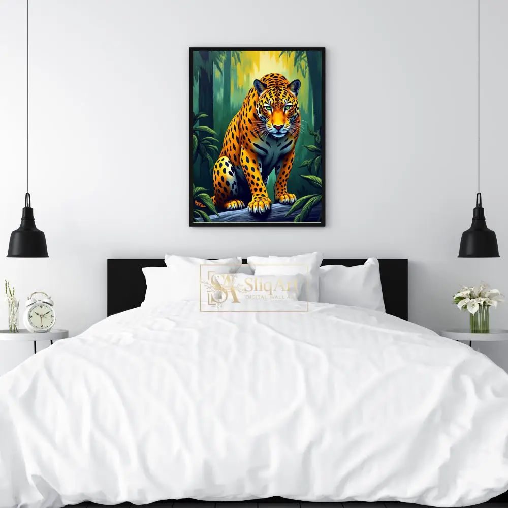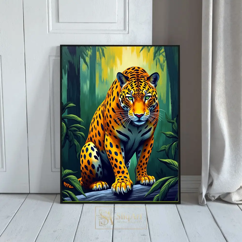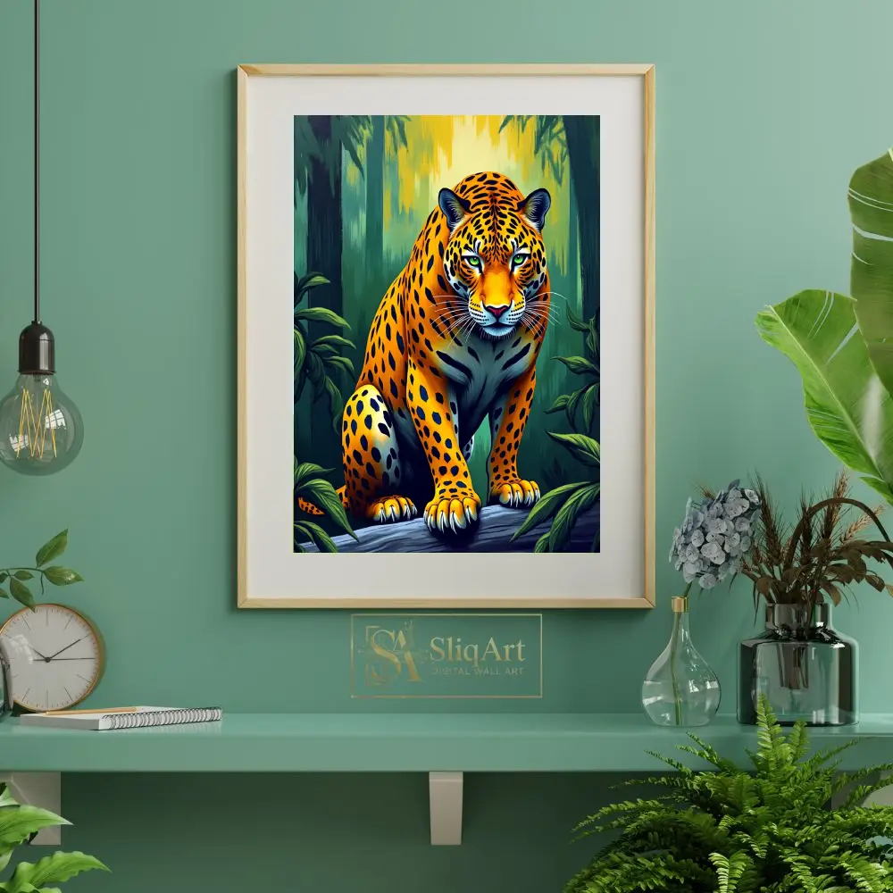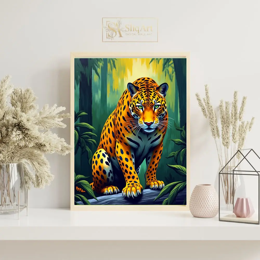 Bring the raw power and beauty of the wild into your home with this stunning digital illustration of a jaguar. Perched with quiet intensity on a fallen log, the majestic big cat is rendered in vivid oranges and deep yellows that contrast beautifully against the lush, emerald-green forest backdrop.
