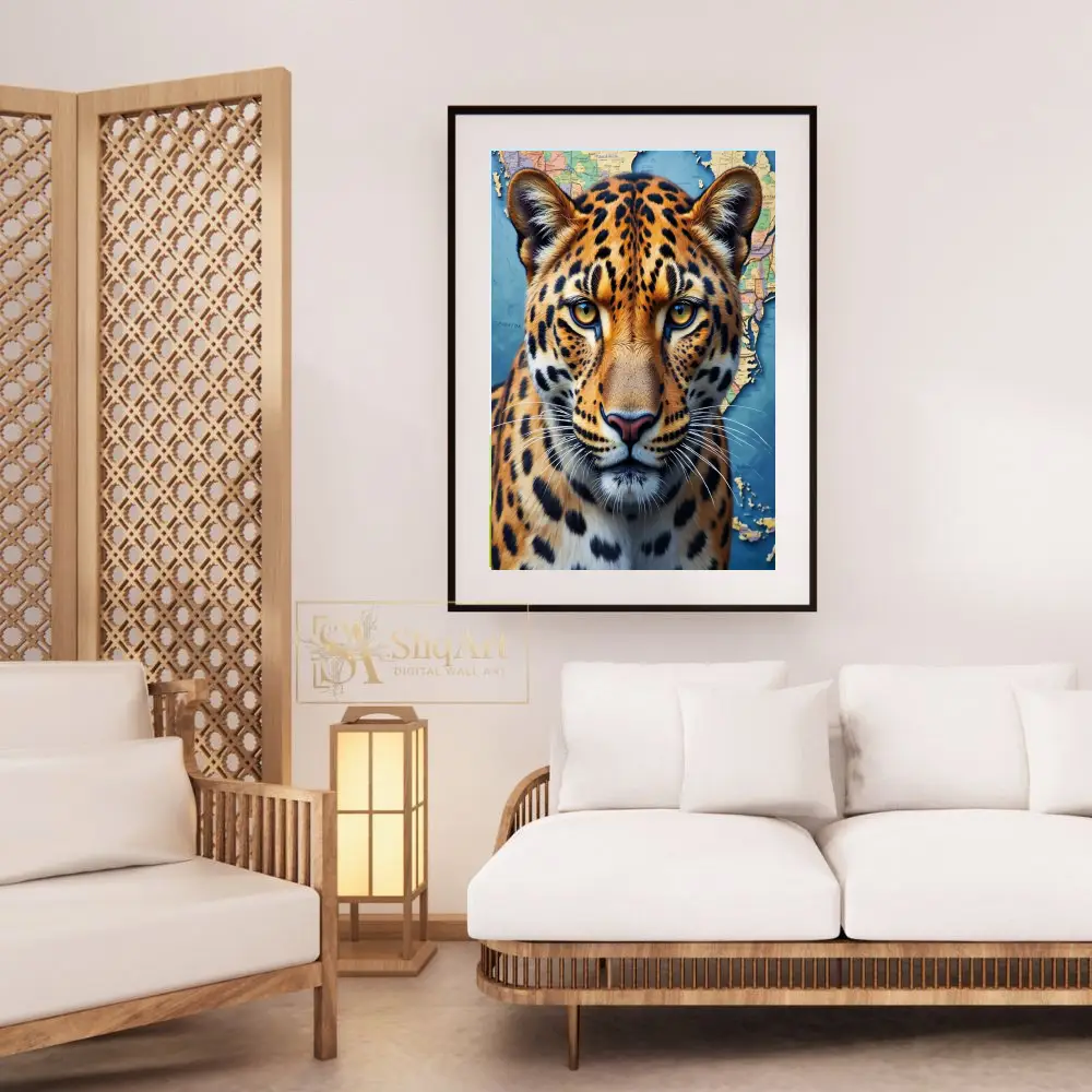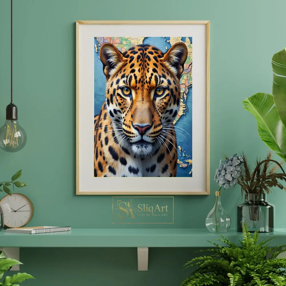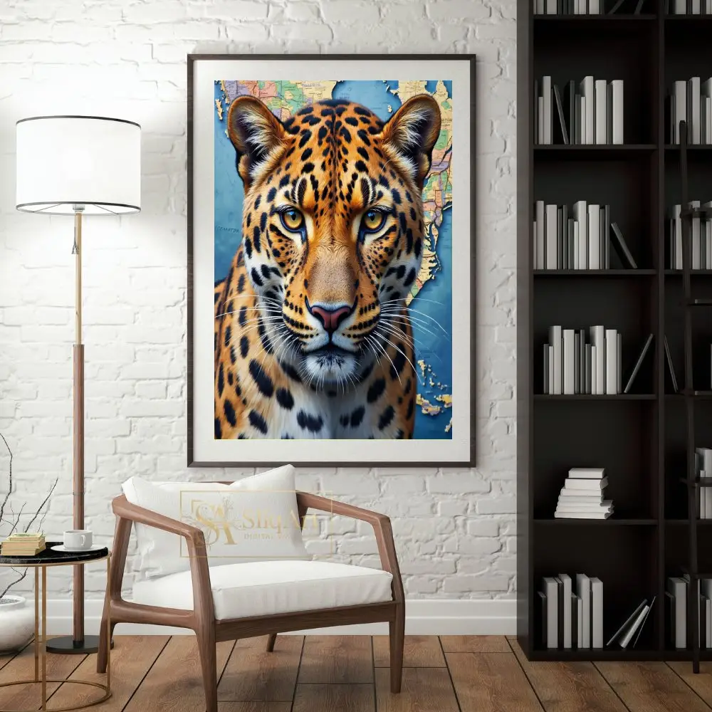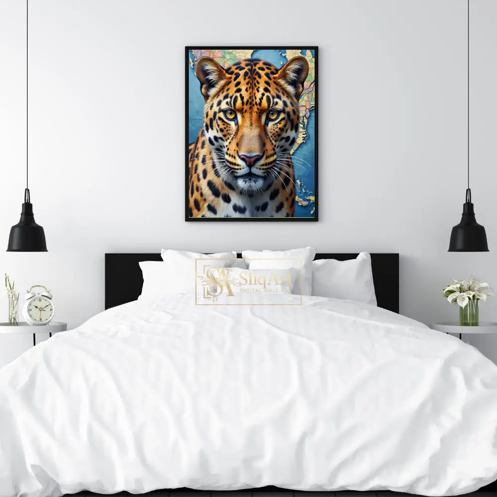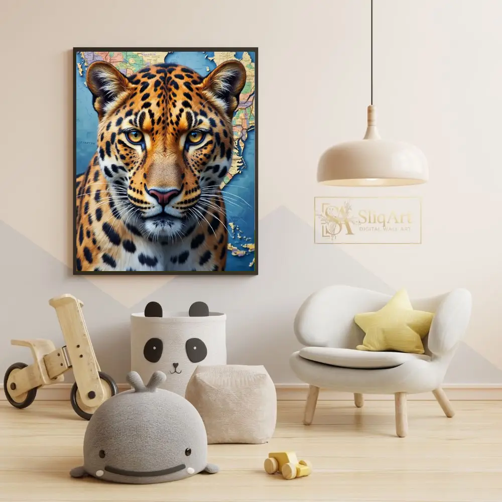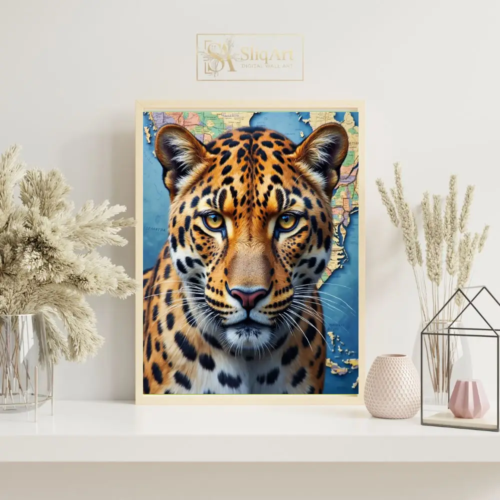 The intense, amber eyes of the big cat command attention, creating a powerful focal point for any room. The blend of rich golds and oranges from the leopard’s fur contrasts beautifully with the deep blues and earthy tones of the map, symbolizing a connection between the wild world and global exploration.